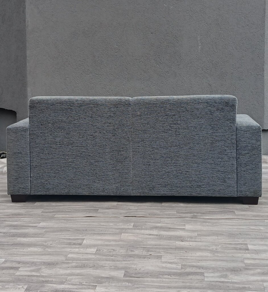 Táto dvojmiestna sedačka sa vyznačuje čistým, minimalistickým dizajnom, ktorý je typický pre moderný a škandinávsky štýl bývania. Má robustnú, hranatú siluetu s pevnými líniami. Široké bočné opierky jej dodávajú stabilitu a moderný vzhľad. Je potiahnutá hrubšou melírovanou textíliou v stredne sivom odtieni. Sedacia časť aj operadlo sú rozdelené na dve rovnaké sekcie, čo naznačuje pohodlné sedenie pre dve dospelé osoby . Stojí na nízkych, nenápadných drevených nožičkách v tmavohnedom prevedení, ktoré vytvárajú mierny kontrast k sivej látke.