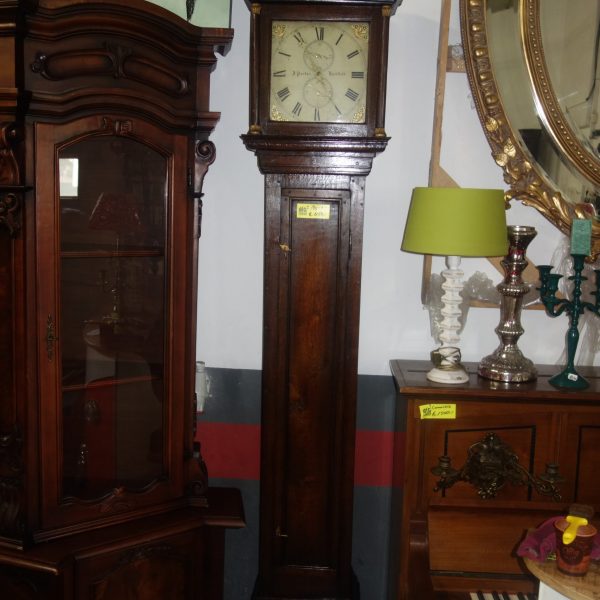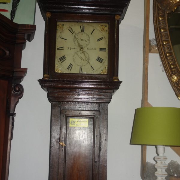 Nemecké dubové dedove hodiny cca okolo roku 1900 . Ručne vyrezávané so zaoblenou kapotou a sklopnými dvierkami s vyrezávanými kvetinovými vzormi . Vo vrchnej časti hodín sa nachádza mosadzný ciferník s arabskými číslicami. Sklenené vstupné dvierka odhaľujú dve mosadzné závažia a mosadzné kyvadlo. Hodiny stoja v prednej časti na drdolových nohách . V pôvodnom starožitnom stave – bez zámku .Tieto hodiny sa predávajú tak, ako boli dovezené z Holandska. Nevyskúšané . Je nutné dať po zakúpení skontrolovať hodinárovi . Výška – 194 cm , šírka – 64 cm , hĺbka – 30 cm .