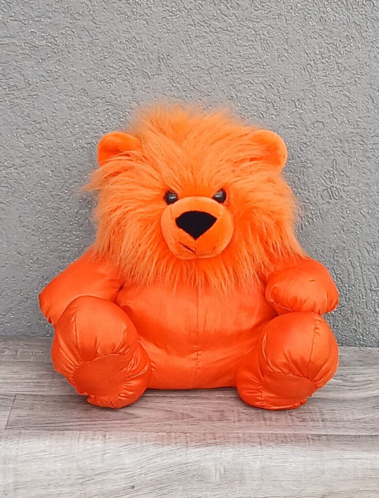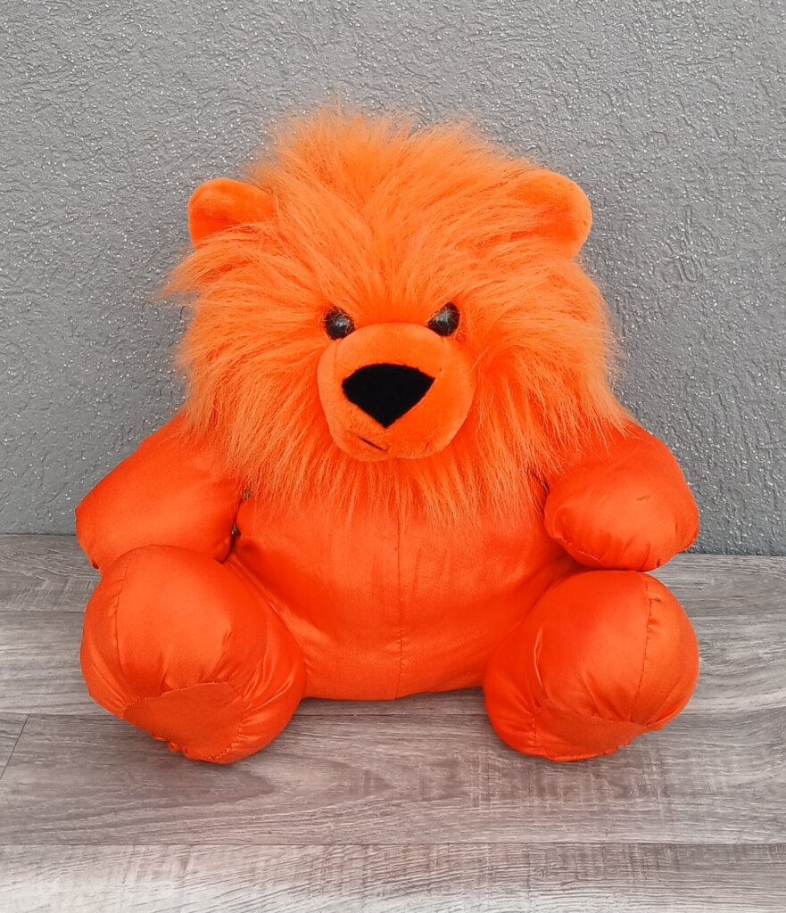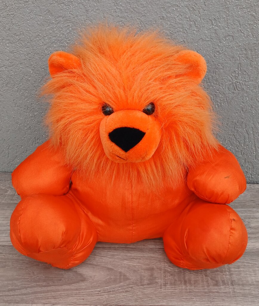 Plyšová hračka leva s chlpatou hrivou s neprehliadnuteľnou žiarivou oranžovou farbou – vintage kúsok. Mäkká látka vhodná na maznanie. Ideálny darček pre športového fanúšika (napr. holandského tímu) , alebo ako originálny doplnok do detskej izby. Používaná . Výška – 35 cm .