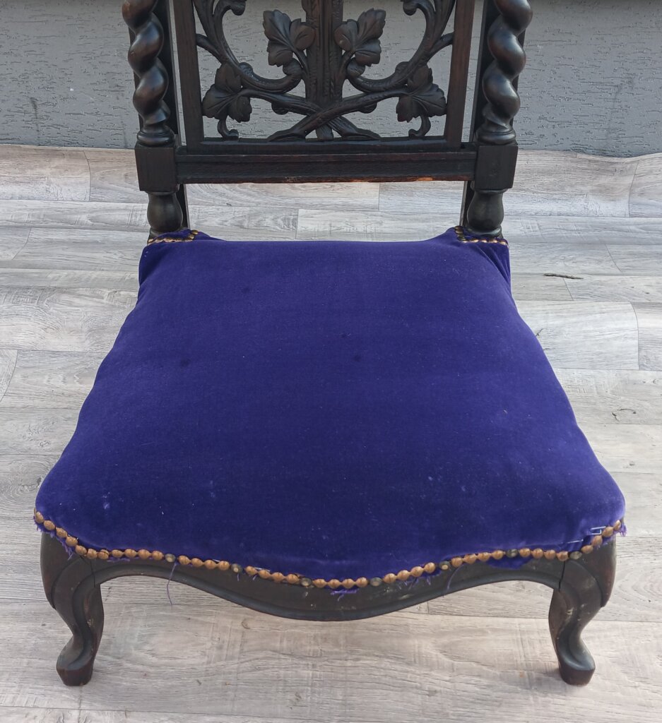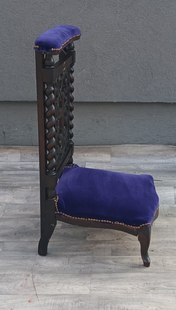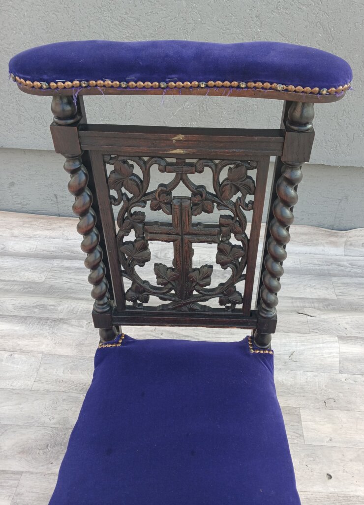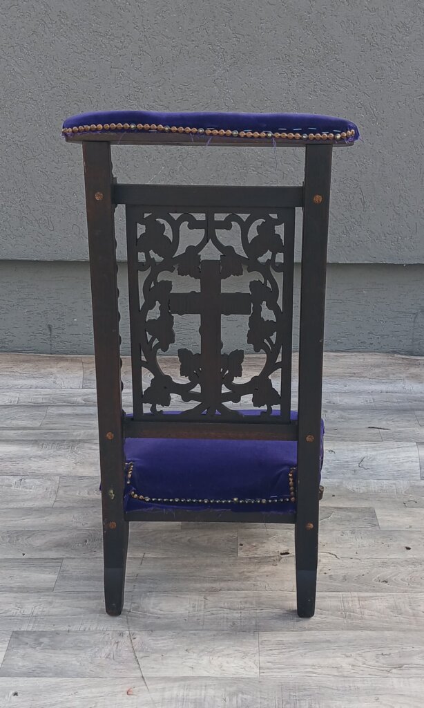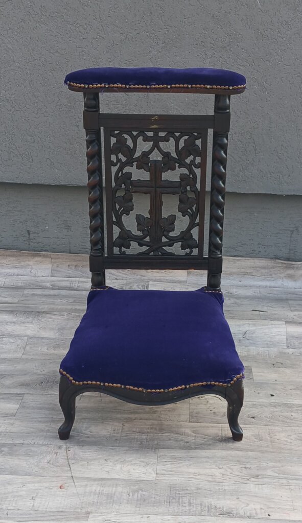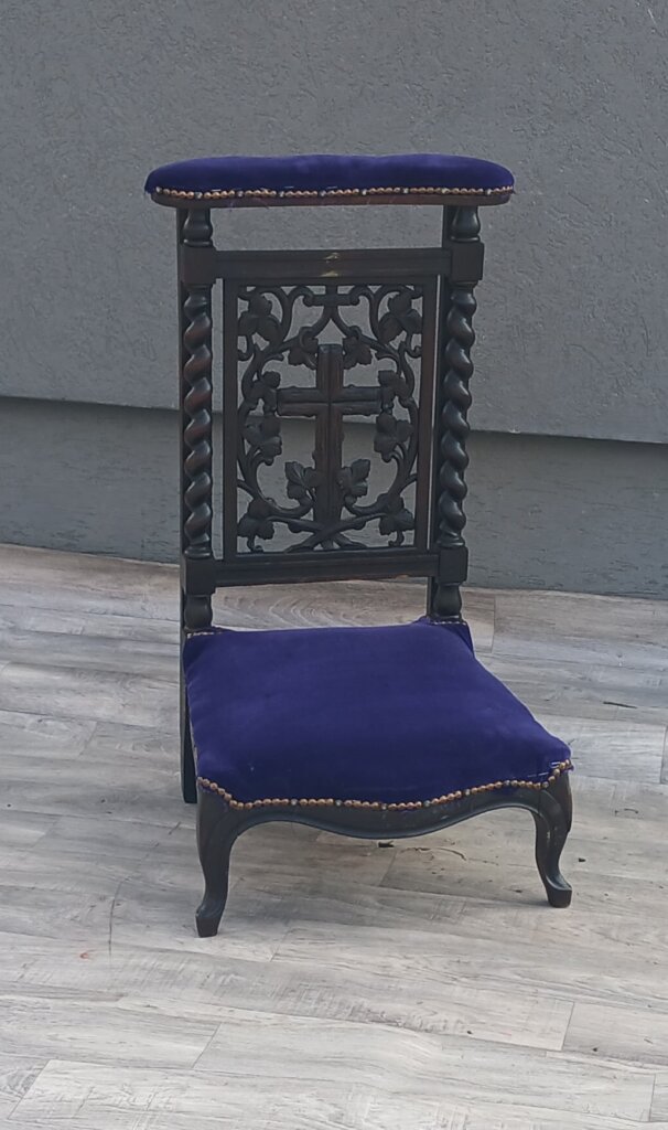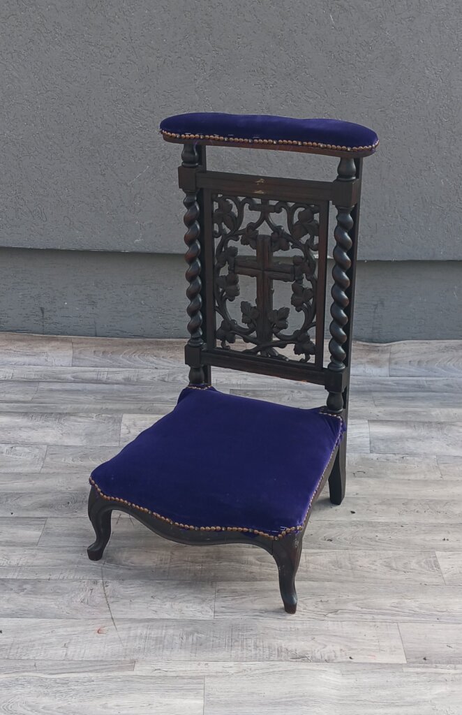 Starožitná kľakačka pochádza pravdepodobne z druhej polovice 19. storočia a je krásnym príkladom sakrálneho interiérového dizajnu. Kľakačka v zahraničí známa pod názvom Prie-Dieu, slúžila v meštianskych domoch , alebo súkromných kaplnkách na osobnú modlitbu a rozjímanie. Je vyrobená z masívneho dreva s tmavou patinou. Ústredným motívom je precízne vyrezávaný latinský kríž zakomponovaný do bohato zdobeného rastlinného ornamentu (akantové listy a vinič). Po stranách sa nachádzajú výrazné skrútené stĺpy, ktoré sú typickým prvkom neorenesancie a baroka. Sedadlo (slúžiace na kľačanie) a horná opierka sú potiahnuté tmavofialovým zamatom. Látka je po obvode dekoratívne uchytená mosadznými čalúnnickými klincami, čo podčiarkuje historický charakter. Predné nohy sú jemne prehnuté v štýle cabriole, čo dodáva masívnej konštrukcii potrebnú ľahkosť. Kľakadlo vykazuje známky primeraného veku a používania, čo mu dodáva autentickú starožitnú patinu. Okrem pôvodného náboženského účelu je dnes tento kúsok vyhľadávaným solitérom do dobových interiérov, knižníc , alebo ako štýlový doplnok pre zberateľov sakrálneho umenia. Používaná. Výška – 89 cm , šírka – 45 cm , hĺbka – 44 cm , výška sedu – 18 cm , hĺbka sedenia – 41 cm .