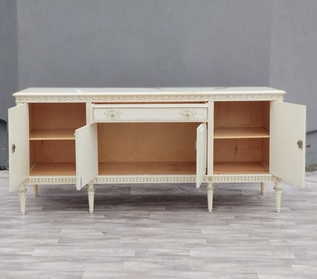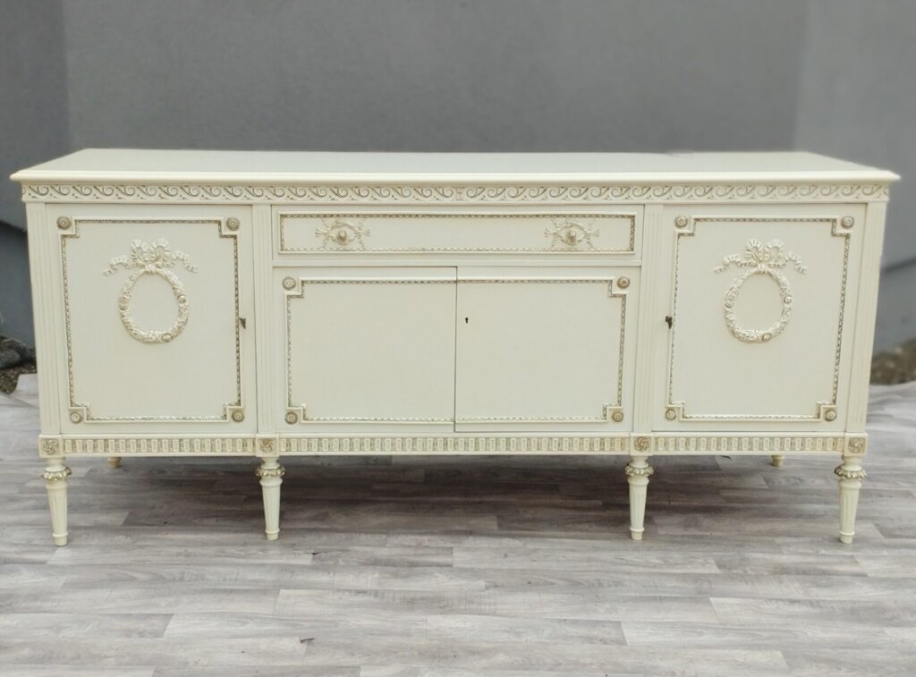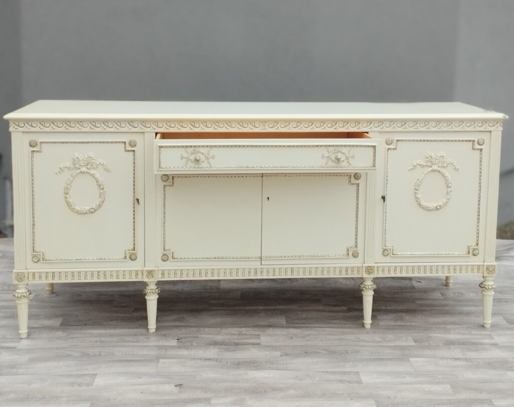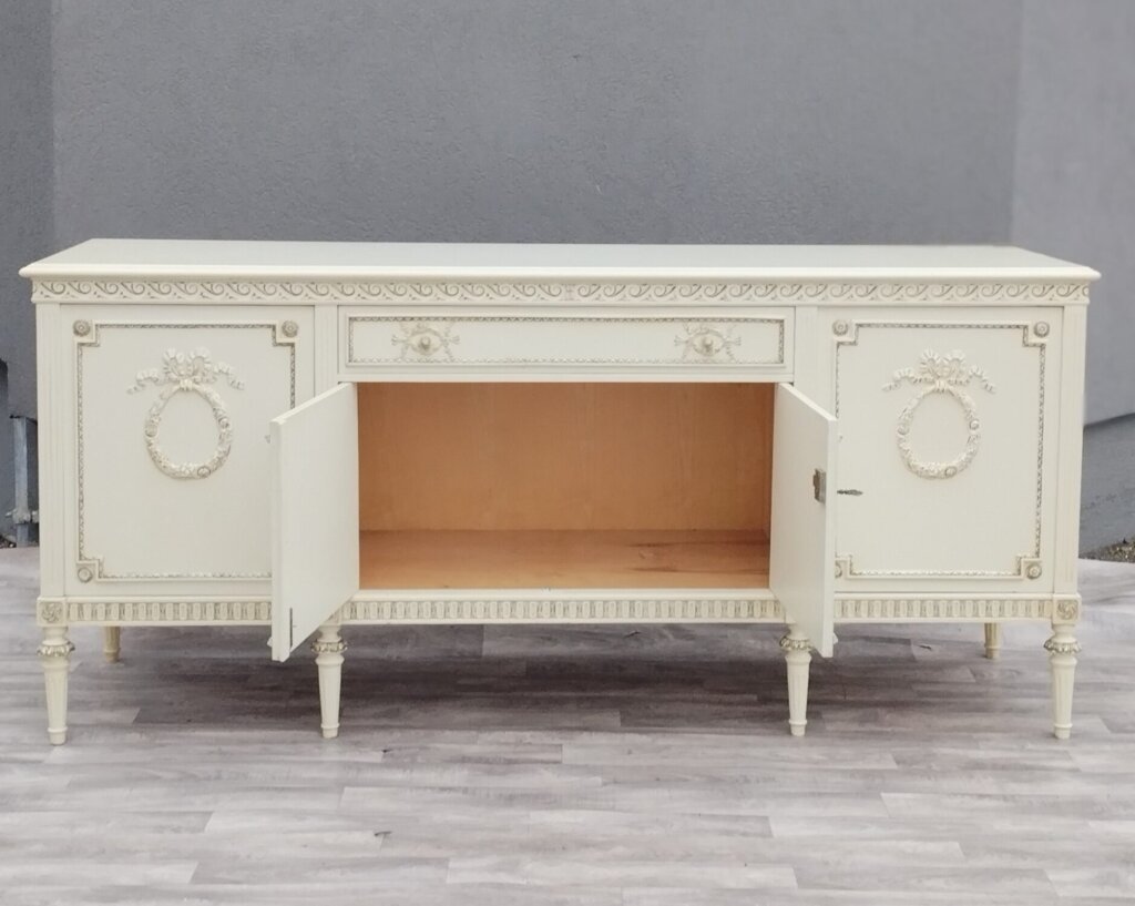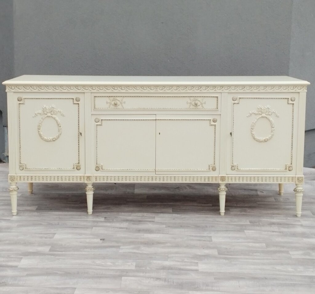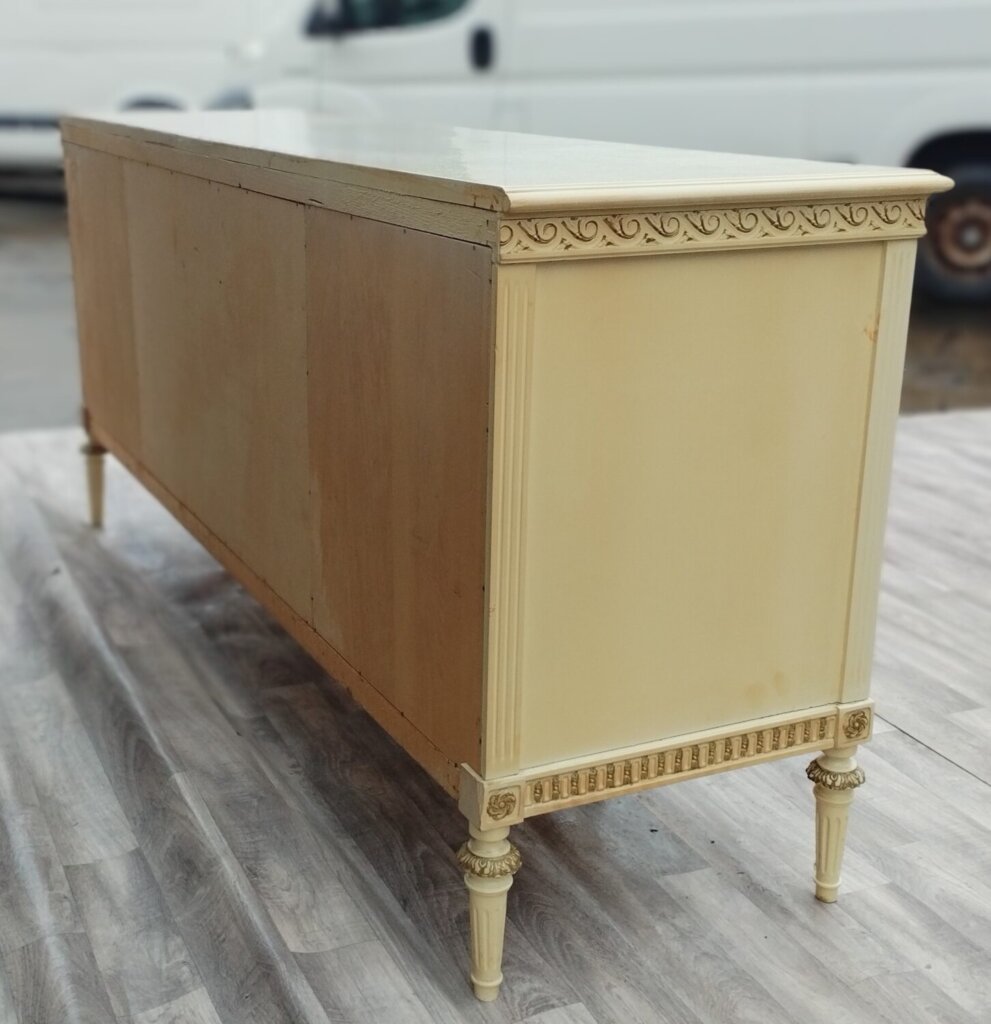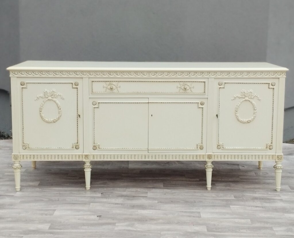 Komoda XXL v štýle Ľudovíta XVI s veľkým úložným priestorom a 1 veľkou zásuvkou , ktorá bude vhodná do obývacích priestorov . Je vyrobená z bukového dreva vo farbe slonia kosť . Má vyrezávané ornamenty, vrátane girlandových vencov a žliabkovaných nôh, čo sú typické prvky pre tento neoklasicistický štýl. Používaná . Výška – 95 cm , šírka – 210 cm , hĺbka – 57 cm .