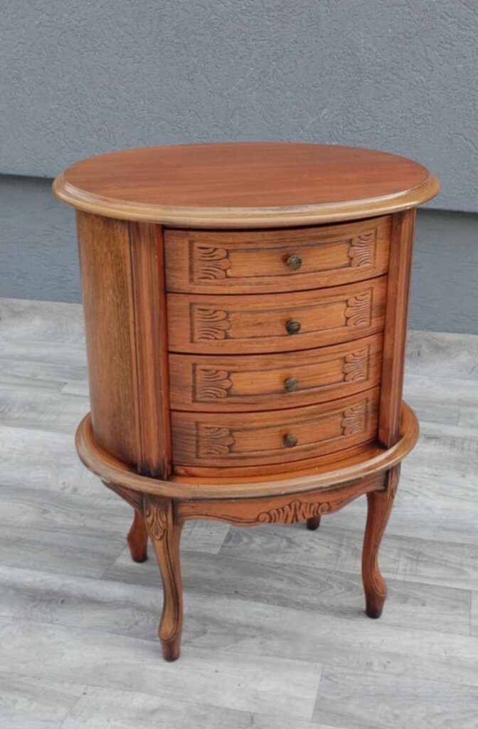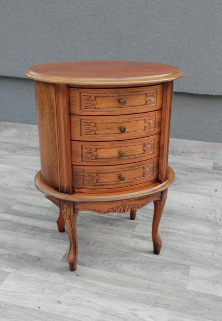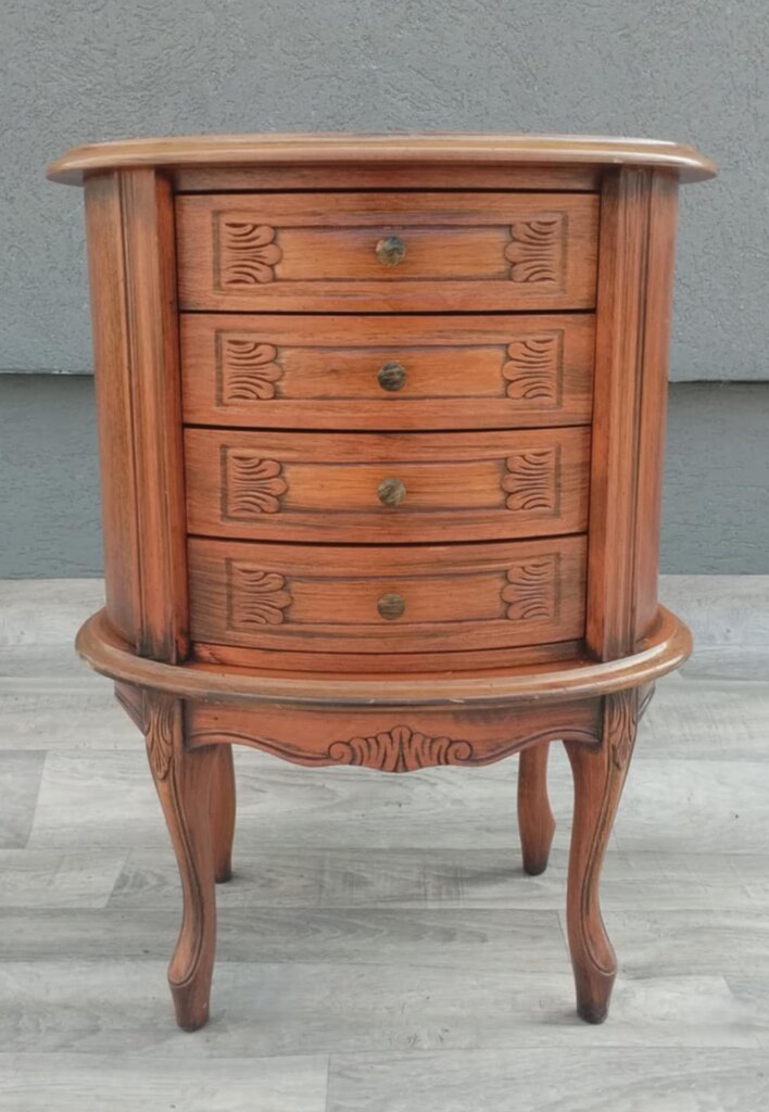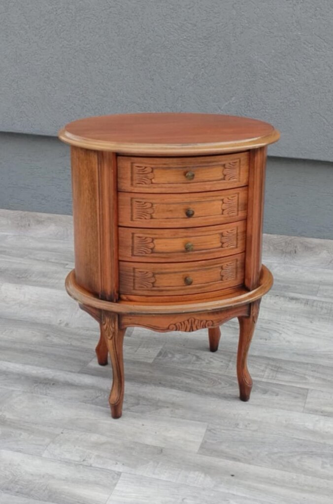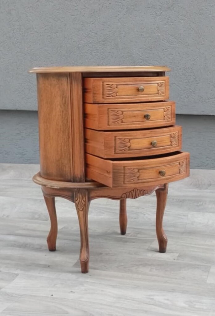 Krásna drevená oválna komôdka v štýle Ľudovíta XV s 3 zásuvkami na zaoblených nožičkách v tvare elipsy je krásne zdobená, mimoriadne dekoratívna a jedinečná. Používaná vo veľmi dobrom stave . Výška – 62 cm , dĺžka – 48 cm , šírka – 41 cm .