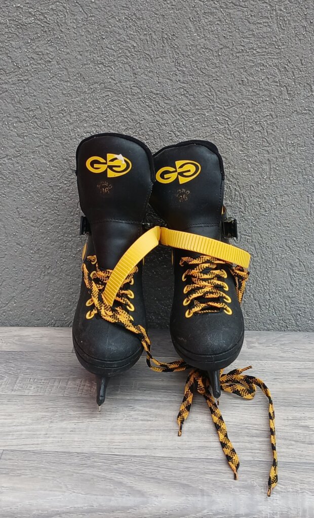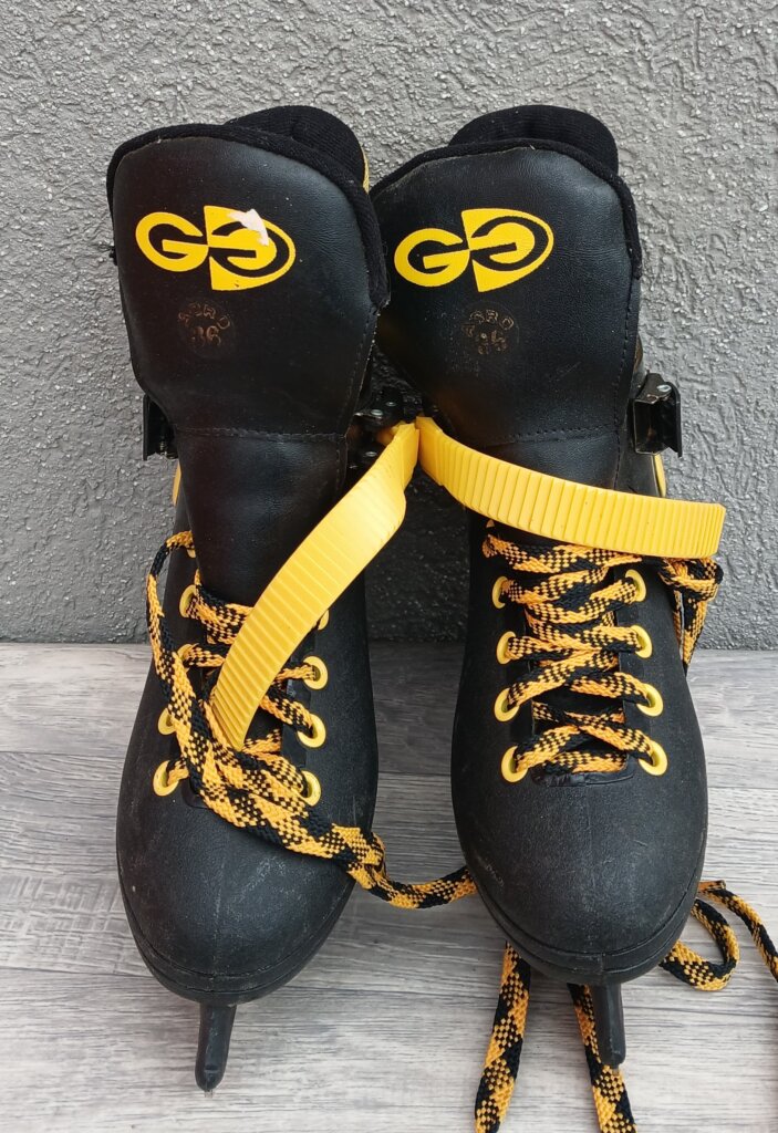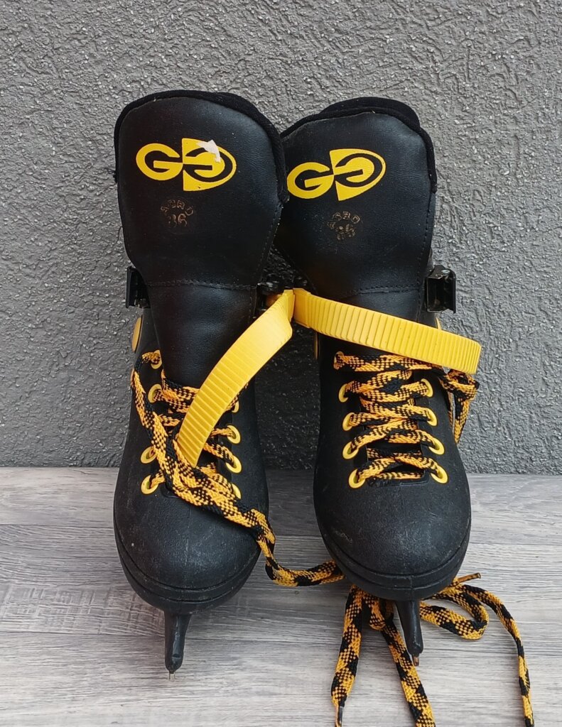 Tieto čierne korčule so žltými detailmi, ktoré sú doplnené výraznými žlto-čiernymi šnúrkami a žltým remienkom na suchý zips pre lepšie spevnenie. Vďaka svojej konštrukcii vhodné najmä pre deti a rekreačných korčuliarov. Používané . Značka ACRO – model GG – č.6 .