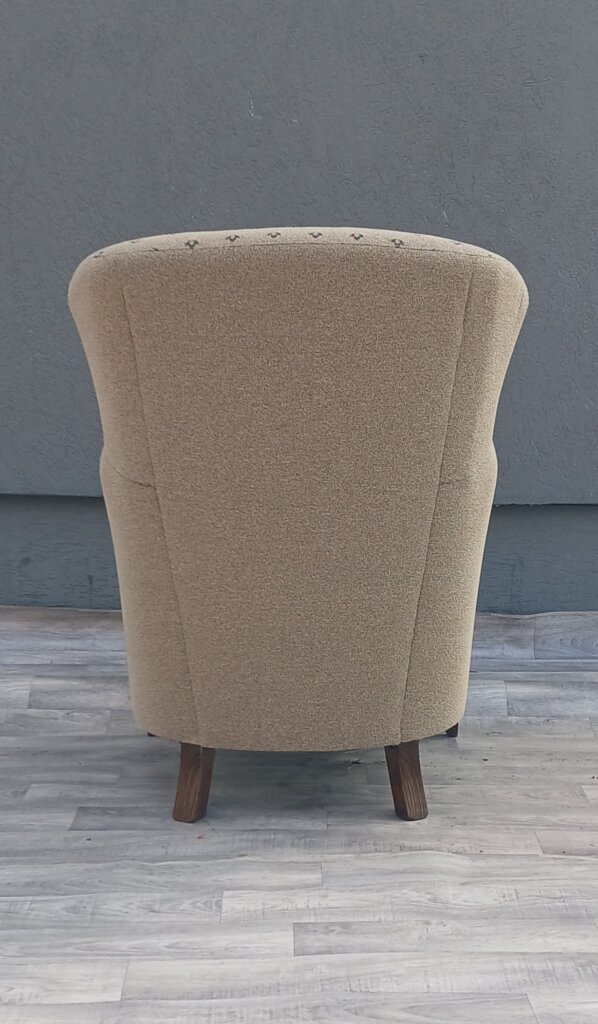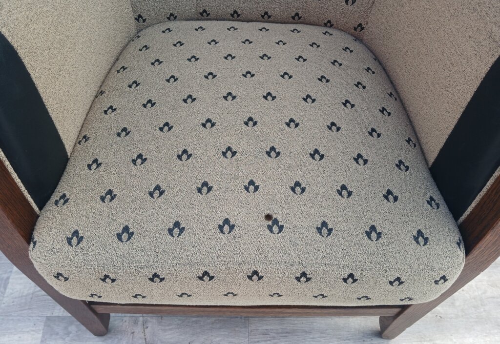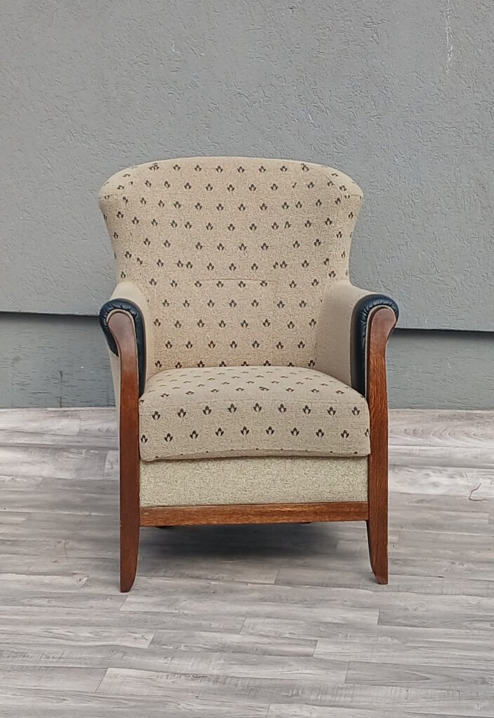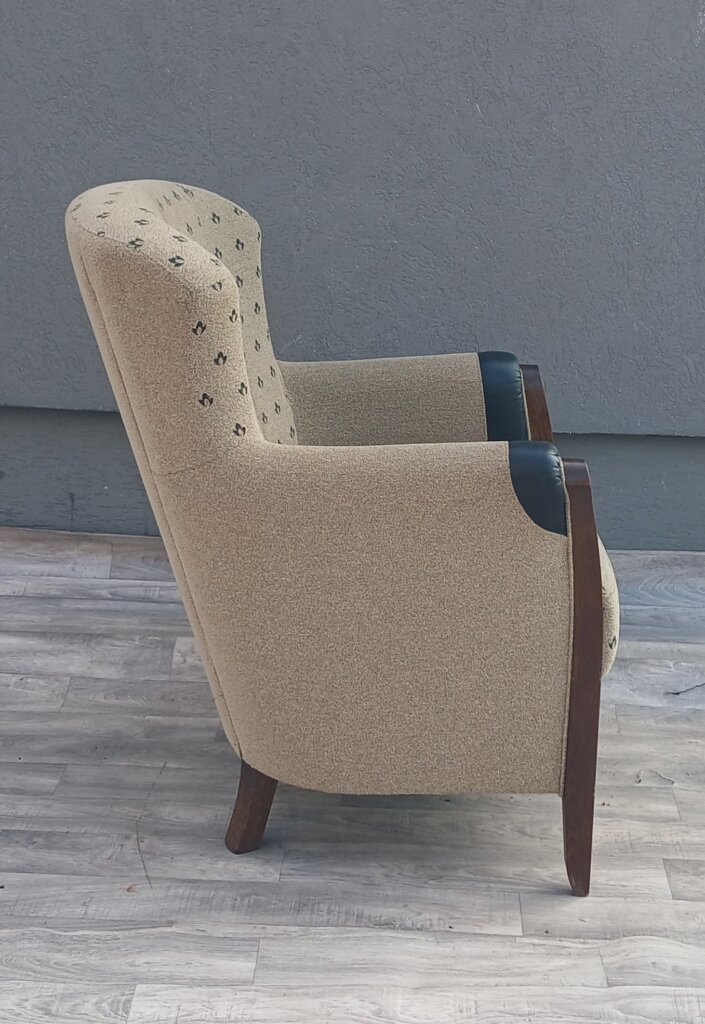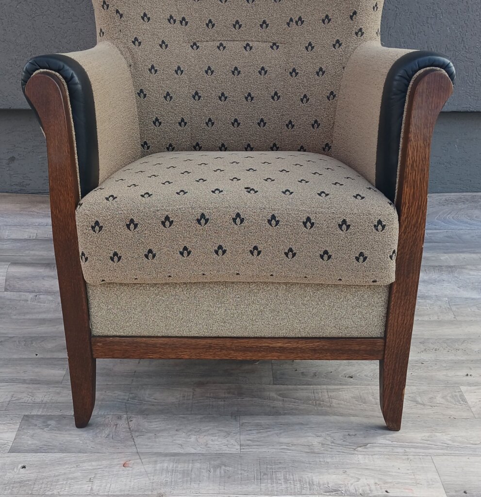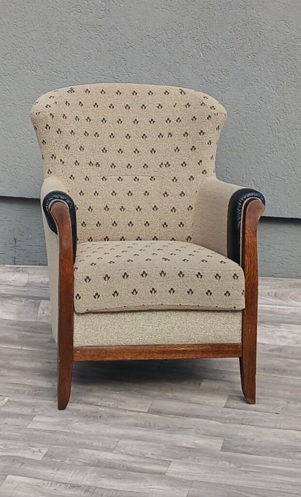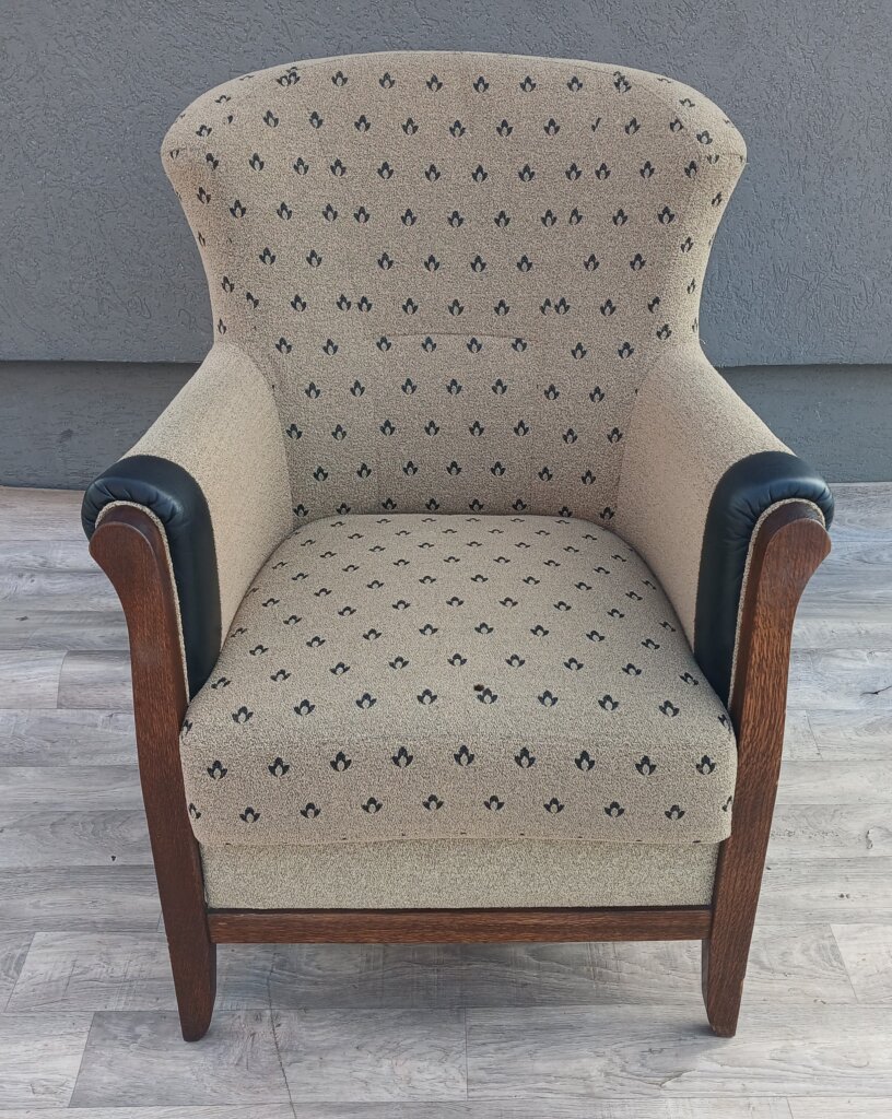 Kreslo štýlové v duchu Art Deco zo 40. až 50. rokov 20. storočia , ktoré spája remeselnú poctivosť minulého storočia s moderným komfortom a dizajnom. Má pevnú kostru z masívneho dreva s krásnou prírodnou kresbou a elegantne klenutými nohami . Zaoblené drevené opierky , ktoré sú v hornej časti potiahnuté kvalitnou tmavou kožou pre luxusnejší vzhľad . Textilný poťah v krémovom odtieni s jemným geometrickým vzorom „plamienkov“ dodáva kreslu vintage dušu . Ergonomicky tvarované vysoké operadlo a pevné pružinové sedenie zaručujú maximálny komfort aj pri dlhšom oddychu. Bude ideálne do obývacej izby, čitateľského kútika , alebo do štýlovej kancelárie. Používané s poškodením viď. posledná fotografia . Výška – 95 cm , šírka – 71 cm , hĺbka – 60 cm , výška sedu – 46 cm , hĺbka sedenia – 51 cm .