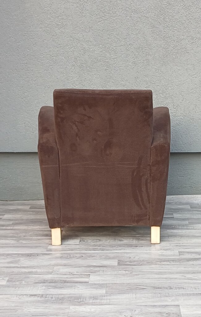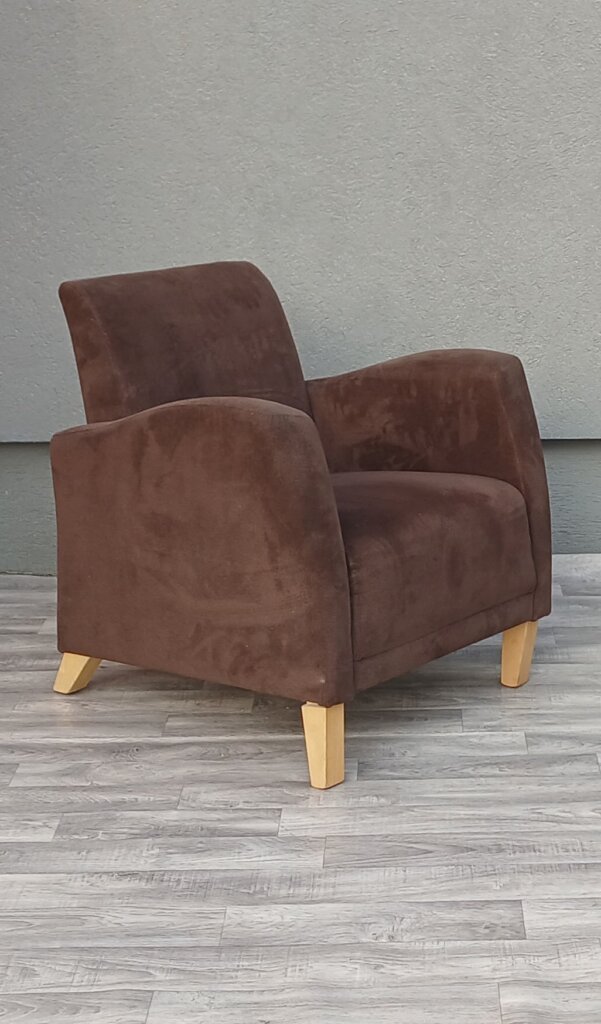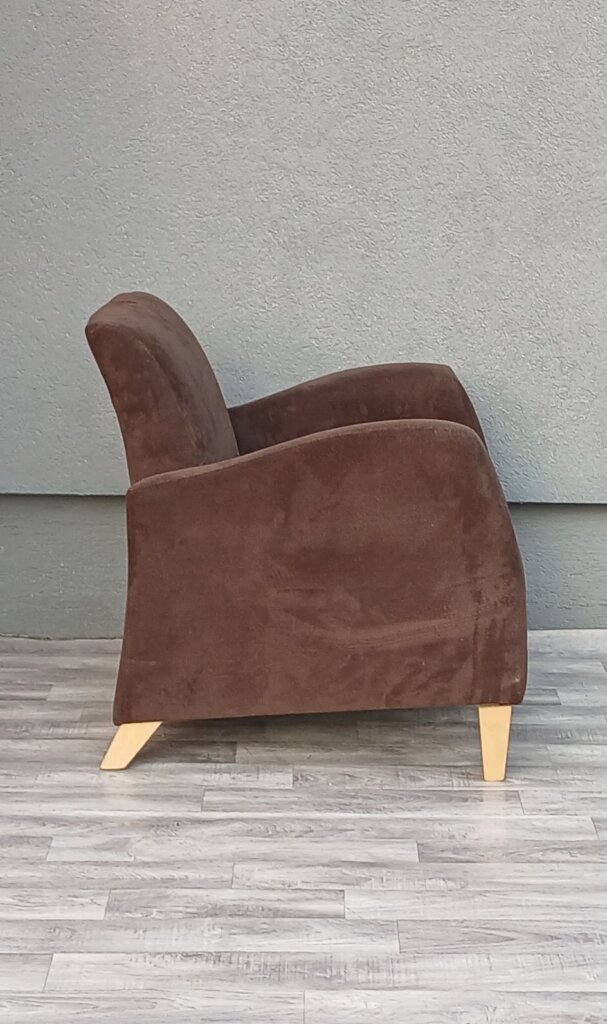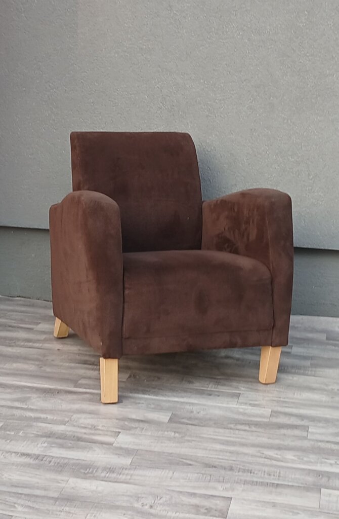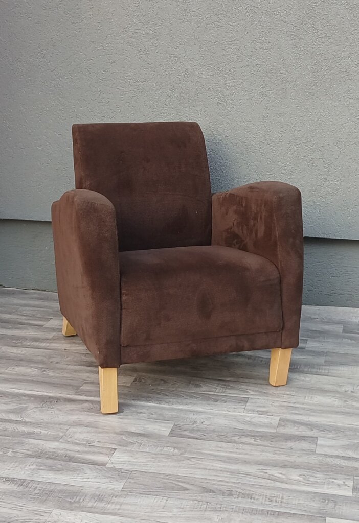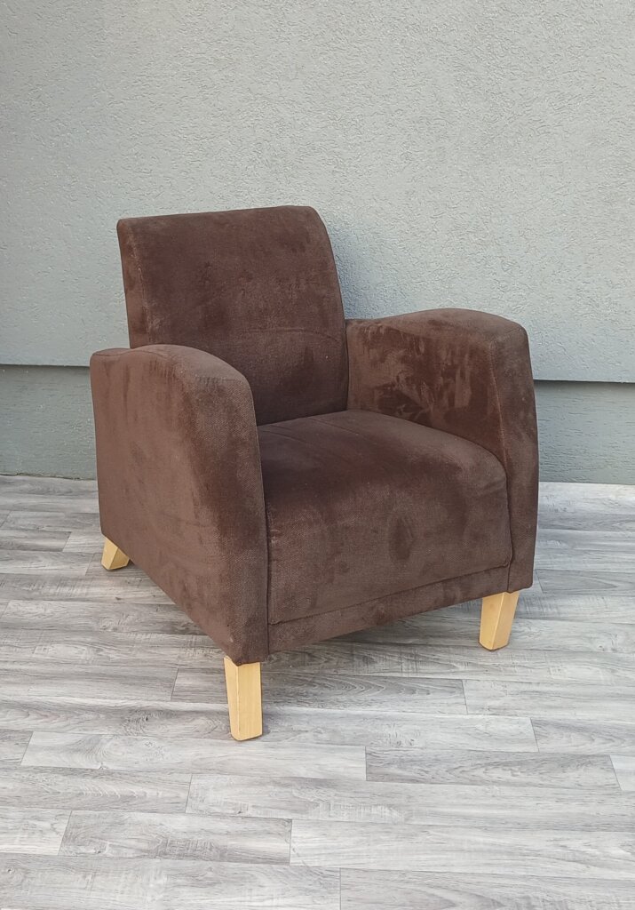 Toto tmavohnedé čalúnené kreslo sa vyznačuje minimalistickým a funkčným dizajnom, ktorý kombinuje prvky moderného štýlu s klasikou. Je ideálnou voľbou do obývačiek, kaviarní alebo hotelových priestorov vďaka svojmu kompaktnému tvaru. Kreslo má čisté línie s mierne zaoblenými hranami, čo mu dodáva prívetivý vzhľad. Používané . Výška – 78 cm , šírka – 72 cm , hĺbka – 65 cm , výška sedu – 40 cm , hĺbka sedenia – 52 cm .