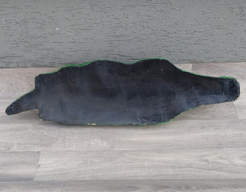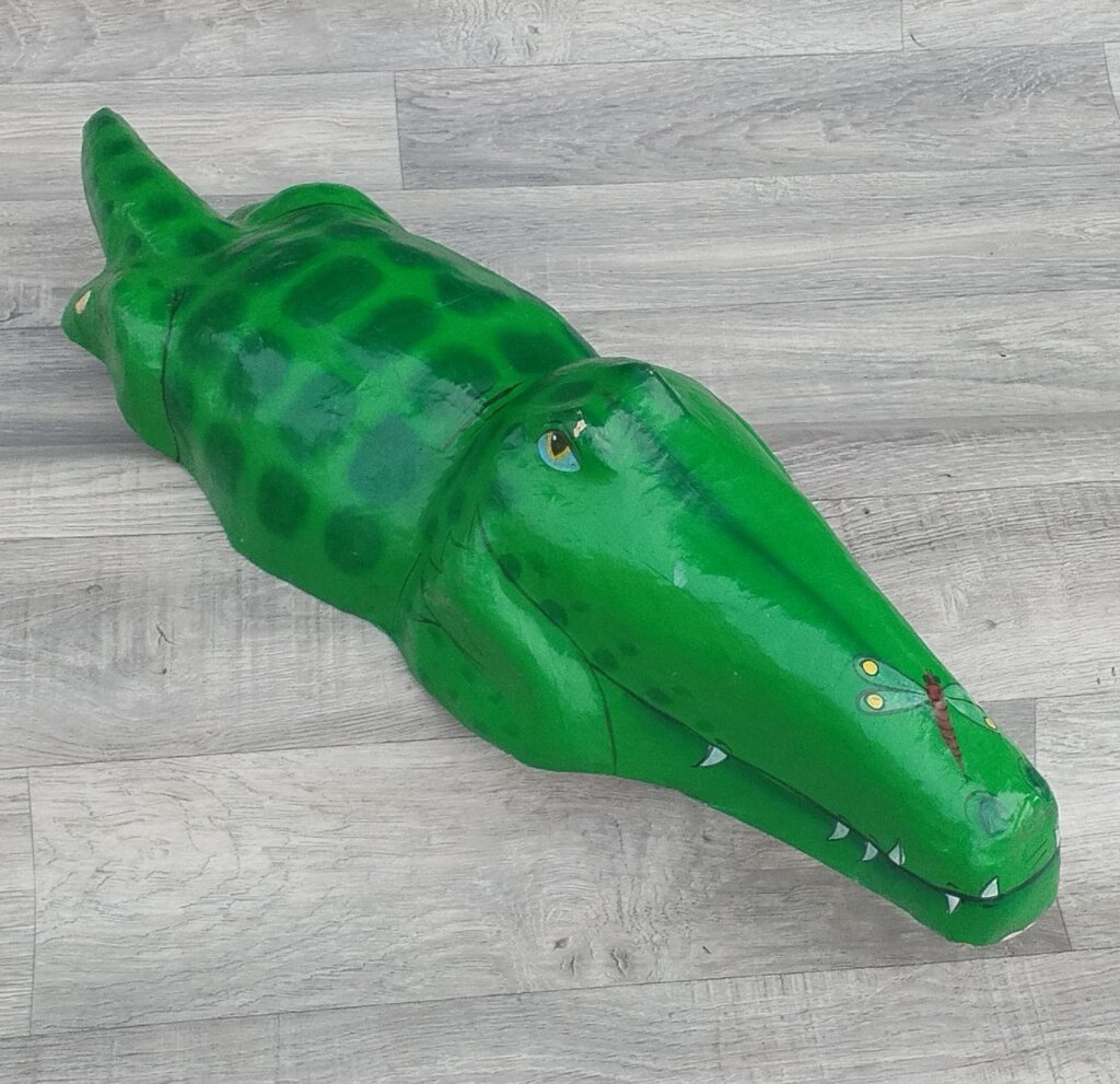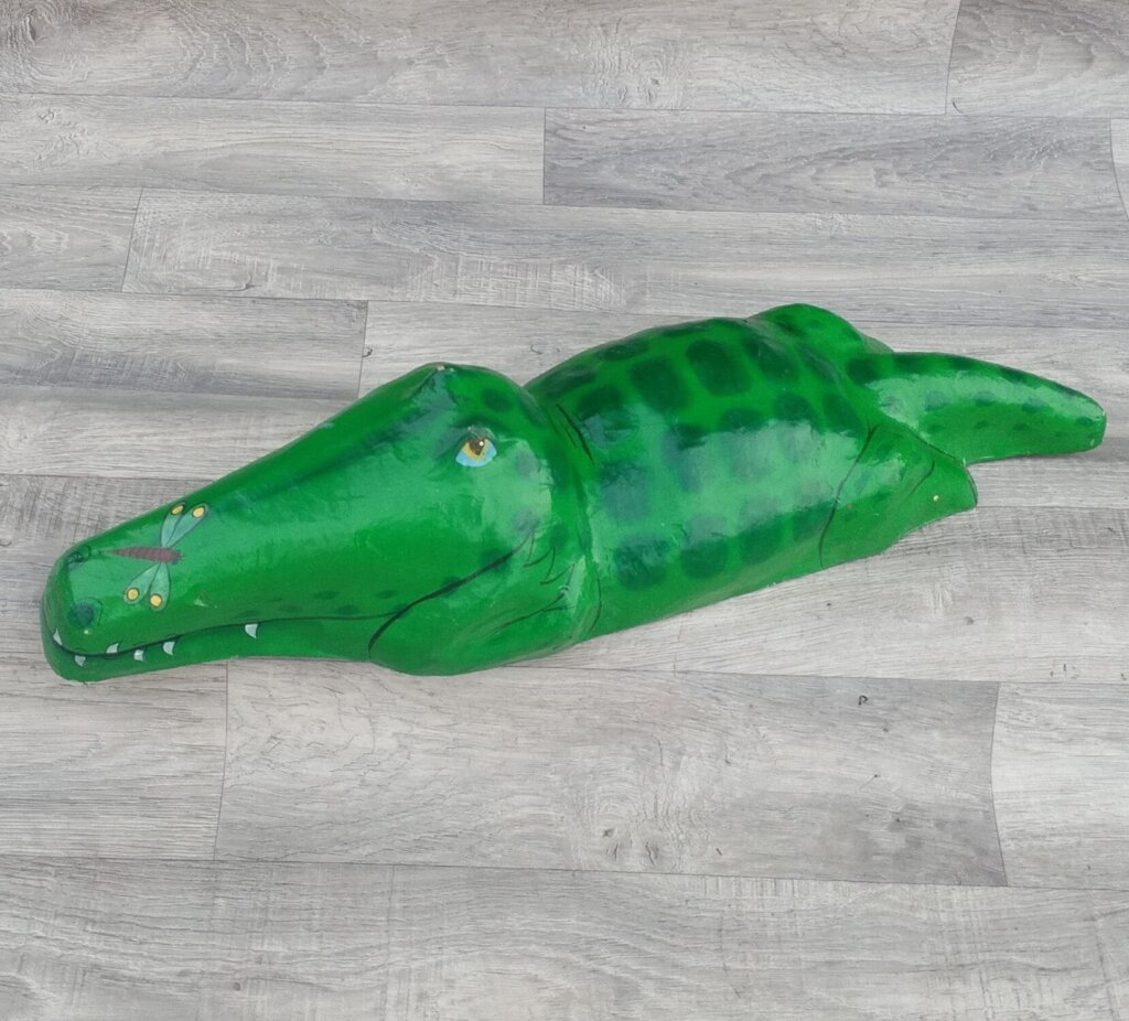 Tento krokodíl je ručne maľovaná figúrka, ktorá sa bežne používa ako dekorácia. Je vyrobený z papierovej masy a má výraznú zelenú farbu s detailmi vrátane zubov a očí, s ručne maľovanými vzormi na chrbte a motívom vážky na nose. Umiestnite ho na vhodné miesto a nechajte ho pôsobiť svojím kúzlom a veselým vzhľadom. Používaný . Výška – 16 cm , dĺžka – 64 cm , šírka – 18 cm .