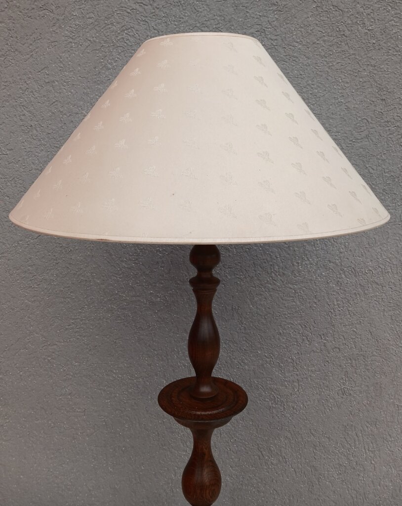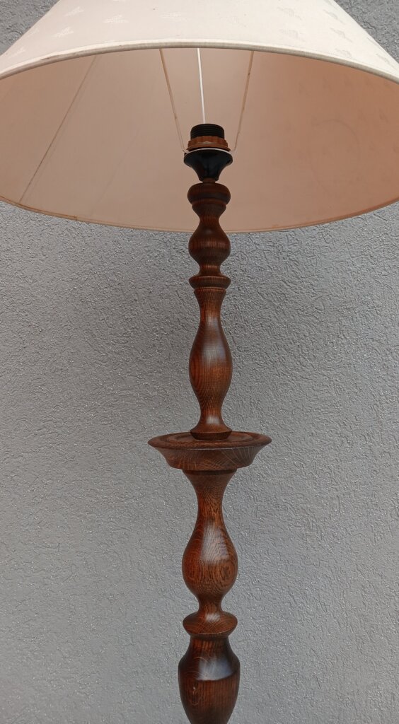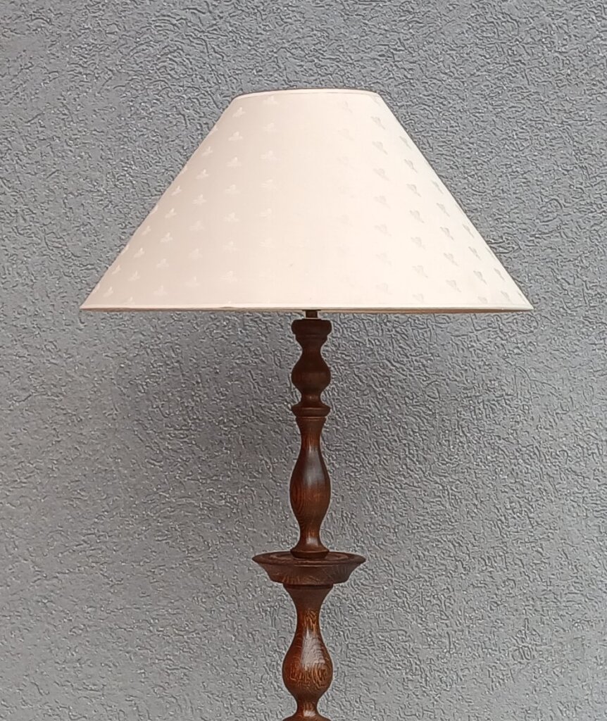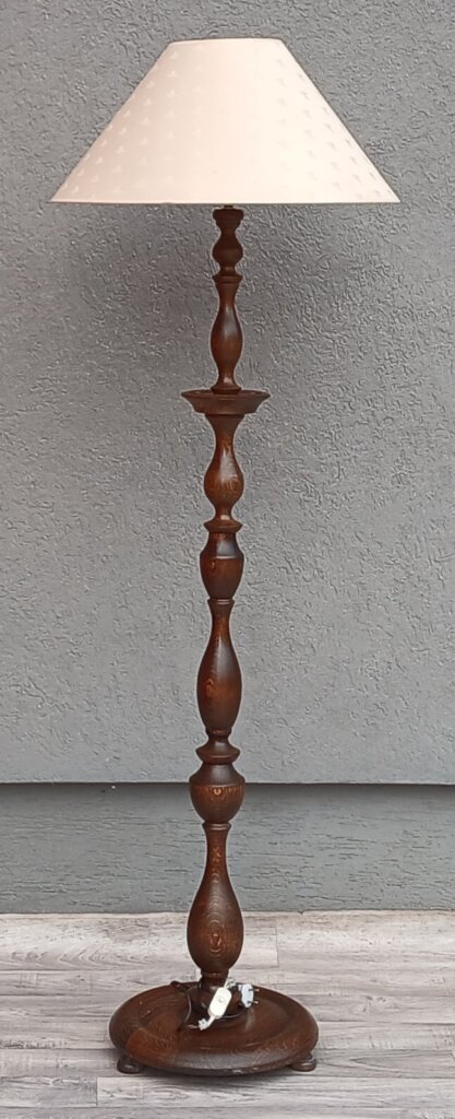 Lampa stojacia rustikálna sa vyznačuje elegantne tvarovaným telom z bohato vyrezávanou nohou z masívneho dreva a textilným tienidlom. V spodnej časti je noha zakončená širším kruhovým podstavcom, ktorý zabezpečuje stabilitu lampy na podlahe. Pre svoj rustikálny vzhľad sa bude hodiť do obývacích izieb, spální alebo kancelárií. Ovládať ju môžete pomocou prepínača umiestneného na prívodnom kábli. Žiarovka nie je súčasťou lampy. Používaná . Výška – 162 cm , priemer podstavca – 34 cm , priemer tienidla – 55 cm , výška tienidla – 31 cm .