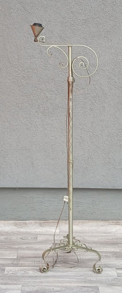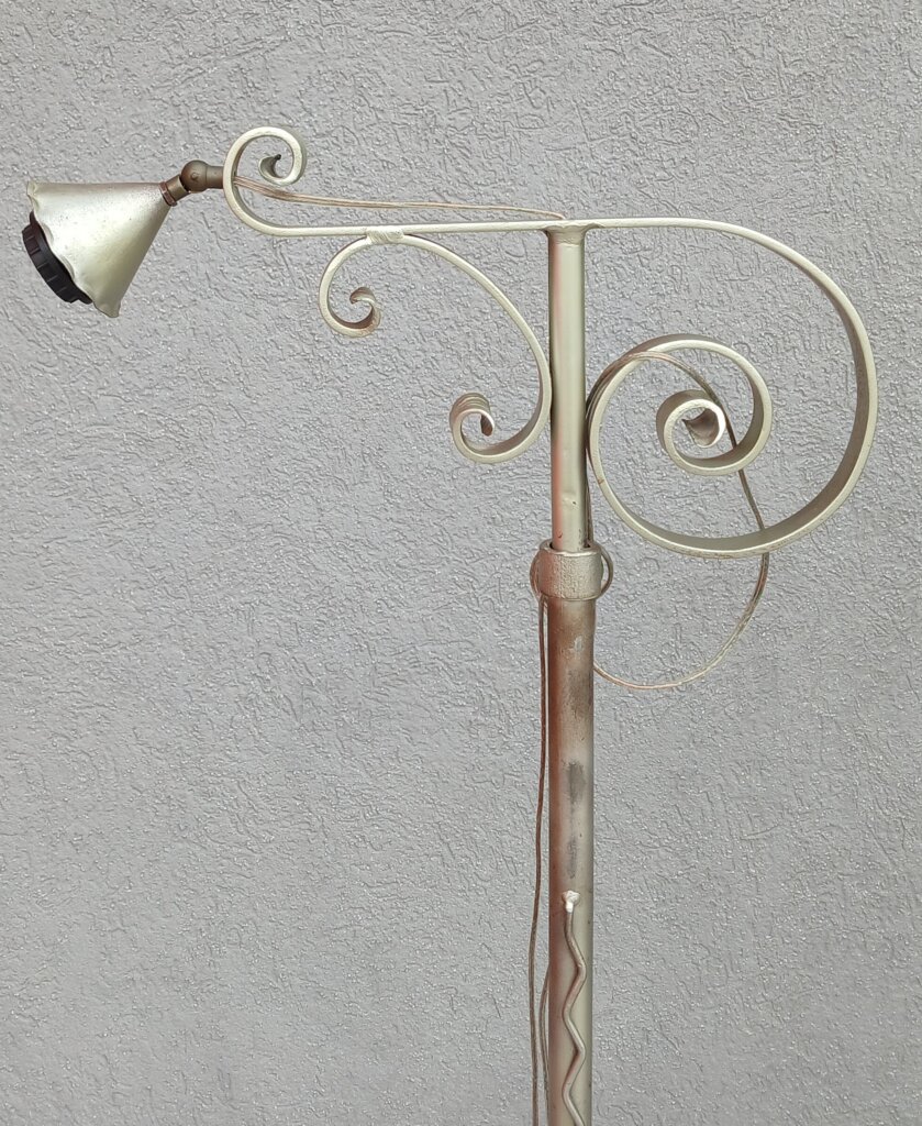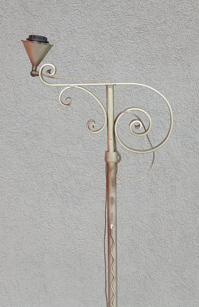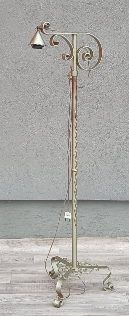 Táto nastaviteľná stojaca lampa z tepaného železa cca okolo 20. a začiatkom 30. rokov 20. storočia , ktorá má mostíkový vzhľad , horizontálne rameno vyčnievajúce zo stĺpa je navrhnuté tak, aby svetlo smerovalo nadol, čo je ideálne na čítanie. Rameno je bohato zdobené kovanými špirálami . Stredová tyč má pekný vlnitý dekor . Trojramenná podstava s ozdobnými pätkami zabezpečuje stabilitu . Používaná – predáva sa tak ako vidíte na fotografiách . Žiarovka nie je súčasťou lampy . Výška – 153 cm , šírka – 43 cm .