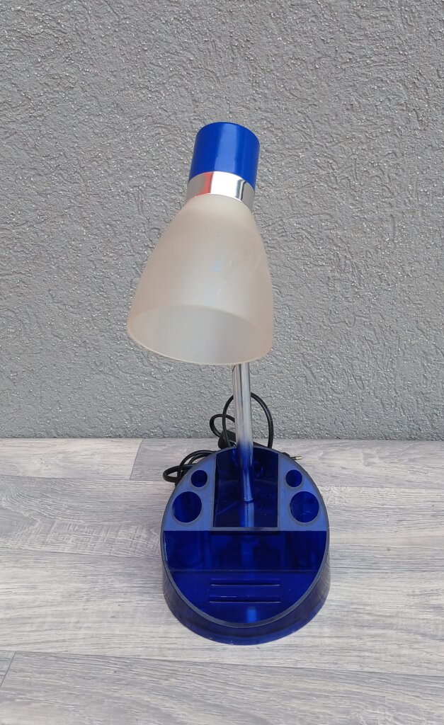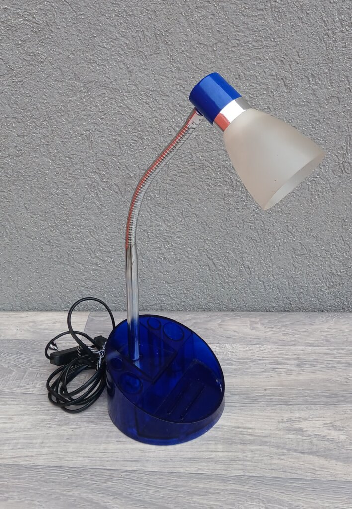 Stolná lampa s organizérom sa vyznačuje ohybným ramenom a priesvitnou modrou základňou, ktorá slúži ako držiak na perá a iné kancelárske potreby. Má matné tienidlo .Táto stolná lampa je vďaka svojmu dizajnu a funkciám ideálna do detských ,študentských izieb a pracovni . Používaná . Výška – 54 cm , priemer tienidla – 8 cm , priemer podstavca – 15 cm .
