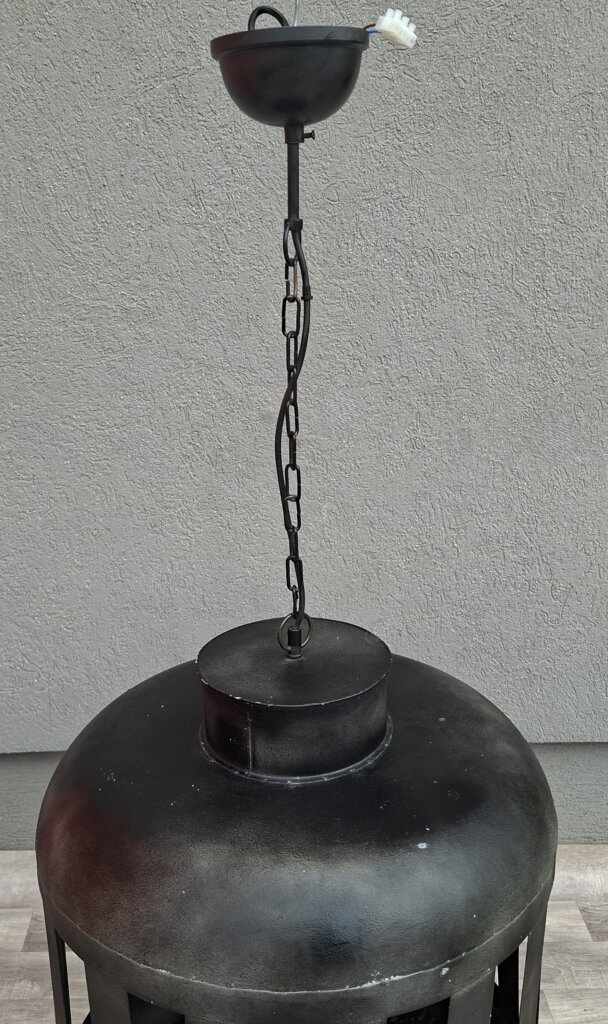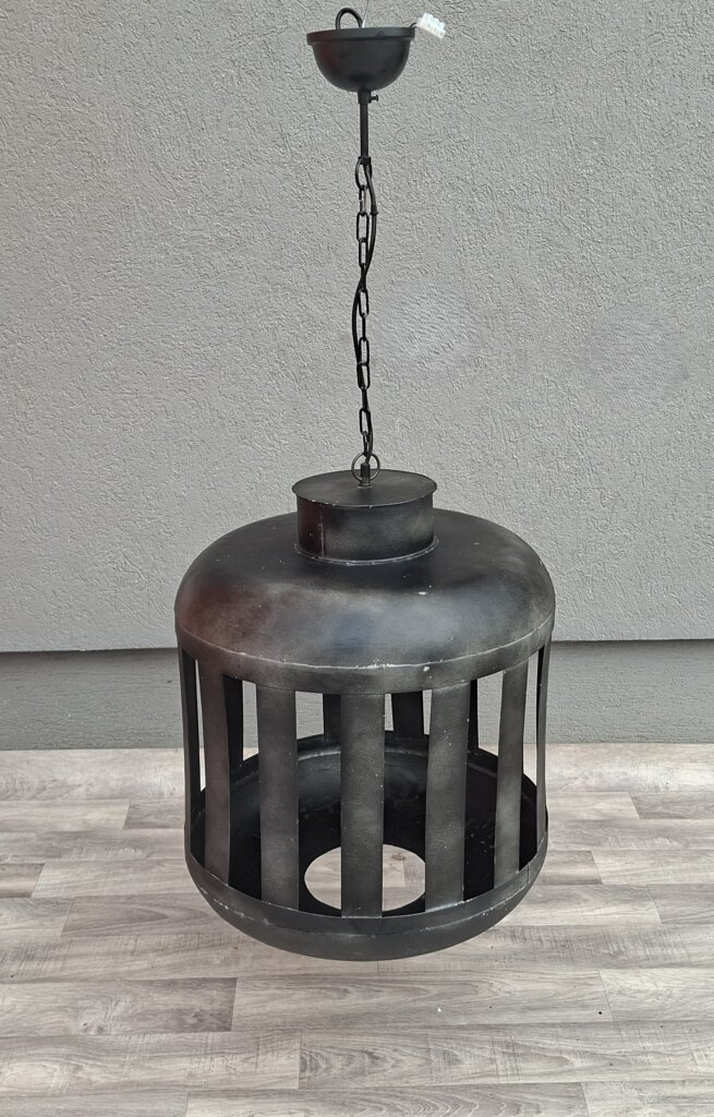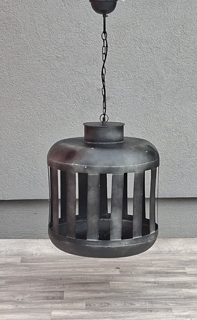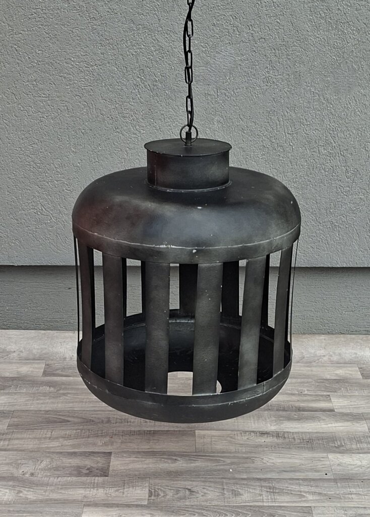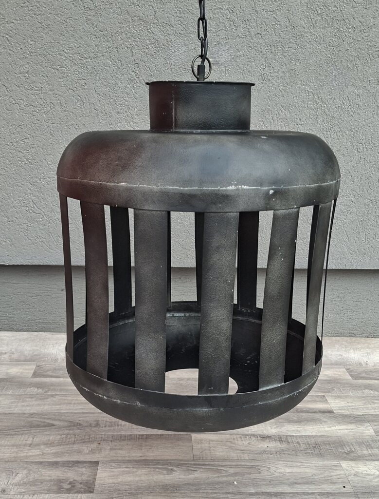 Toto štýlové svietidlo v tvare robustného lampáša spája industriálnu surovosť s vidieckou útulnosťou. Bude ideálnou voľbou pre milovníkov loftového štýlu, moderného retra alebo rustikálnych doplnkov. Lampa je charakteristická svojím valcovitým telom s vertikálnymi kovovými lamelami. Vďaka tomuto otvorenému dizajnu vytvára po rozsvietení v miestnosti dramatickú hru svetla a tieňov. Vyrobené z masívneho kovu (železa) s patinou v čierno sivej farbe . Povrch pôsobí prirodzene opotrebovaným dojmom, čo dodáva lampe autentický vintage charakter. Lampa visí na robustnej kovovej reťazi, ktorá podčiarkuje jej technický vzhľad. Skvele vynikne nad jedálenským stolom v kuchyni , nad barovým pultom, ale aj v krytých altánkoch či zimných záhradách. Používaná – nevyskúšaná . Výška – 110 cm , šírka tienidla – 55 cm , výška tienidla – 60 cm .