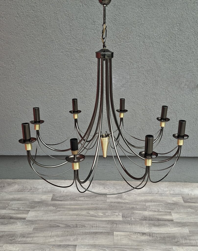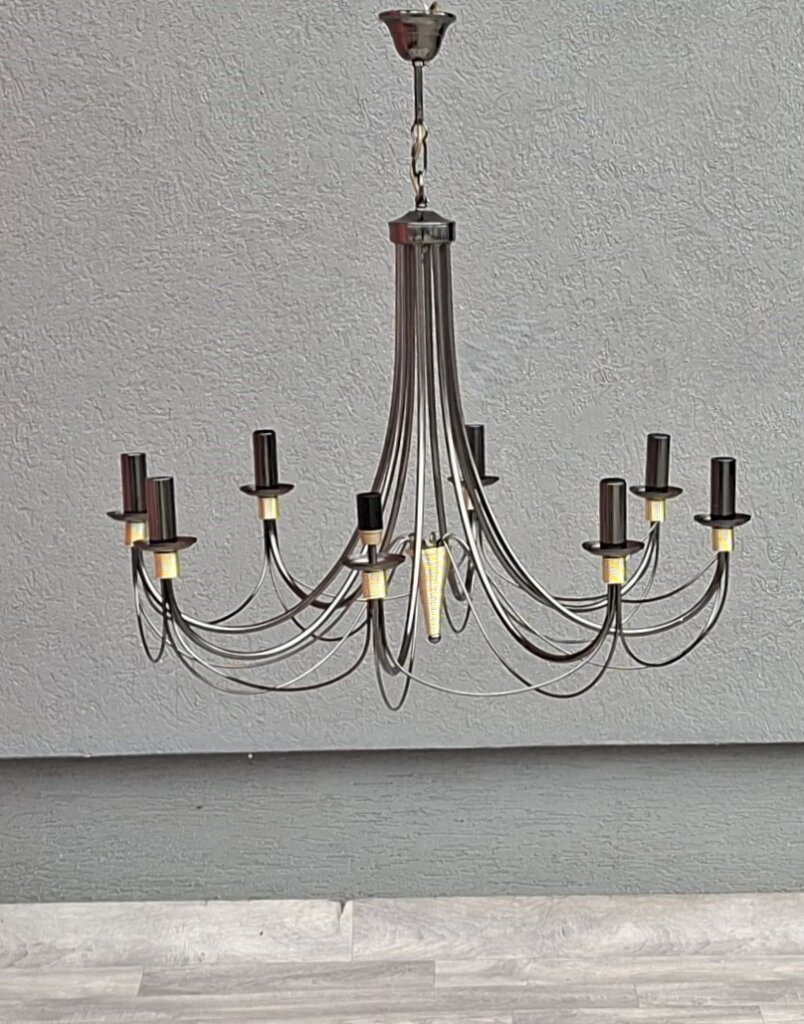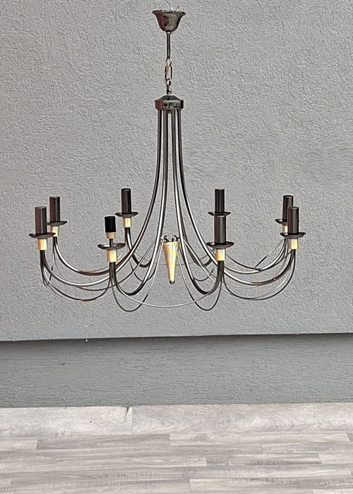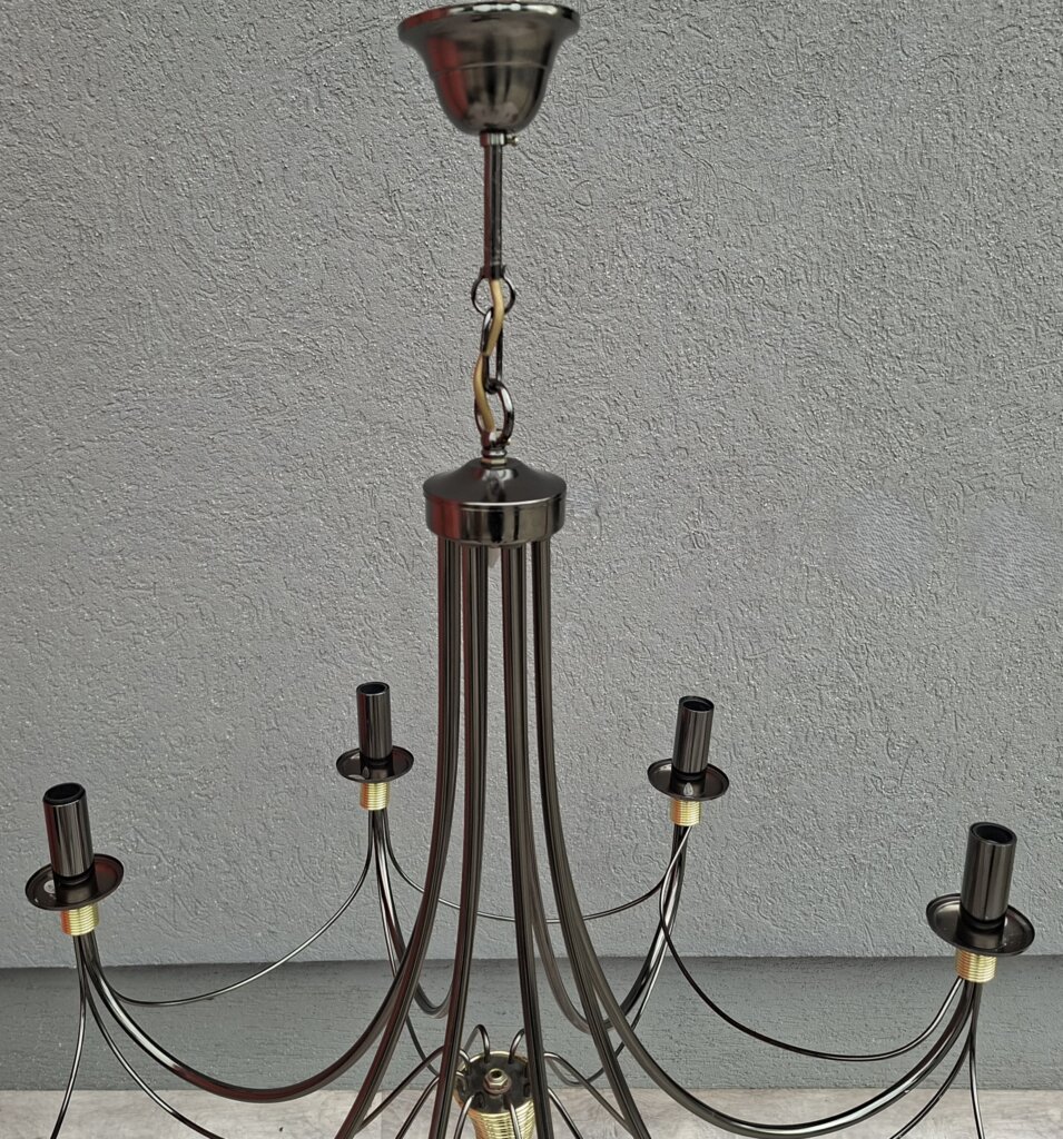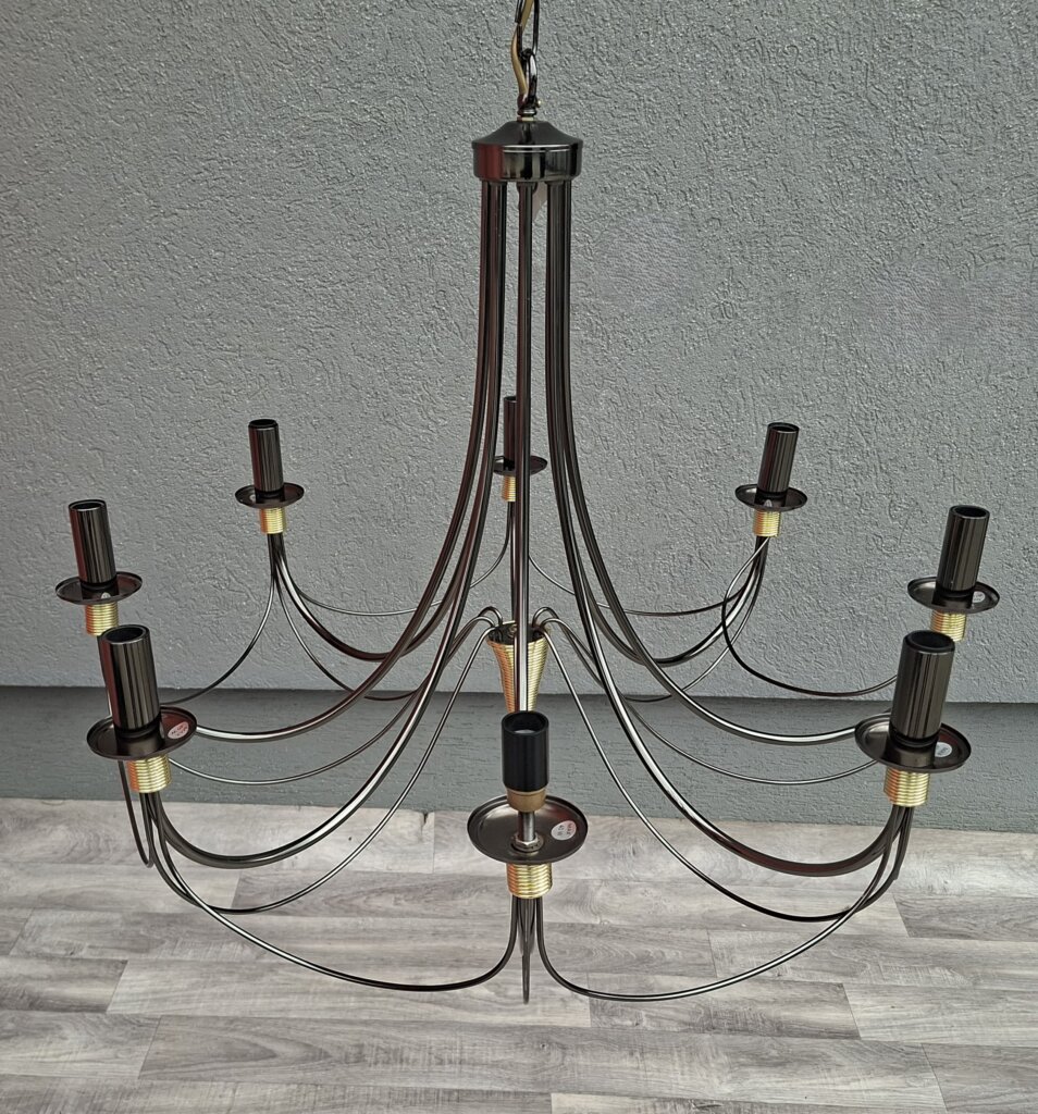 Tento luster je stelesnením rustikálnej elegancie a nadčasového dizajnu, ktorý vnesie do interiéru nádych histórie a noblesy. Jeho čisté línie a kovové prevedenie z neho robia ideálny doplnok pre priestory ladené vo vidieckom, provensálskom alebo klasickom štýle. Charakteristické plynule zahnuté ramená vytvárajú harmonickú siluetu, ktorá pripomína tradičné svietnikové lustre. Centrálna os je elegantne štíhla, čo dodáva svietidlu odľahčený vzhľad. Je vyrobený z kvalitného kovu s povrchovou úpravou v odtieňoch tmavej ocele s jemnými dekoratívnymi prvkami (objímky) v kontrastnej zlatej farbe. Dominantný prvok, ktorý sa bude skvele hodiť nad masívny jedálenský stôl, do obývacej izby s vysokými stropmi , alebo do štýlovo zariadenej spálne. Jedna kovová krytka na objímku chýba . Používaný – nevyskúšaný . Výška – 74 cm , šírka – 77 cm .