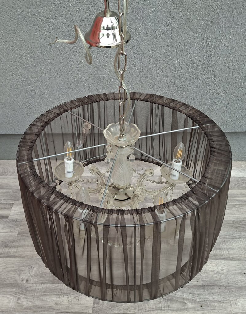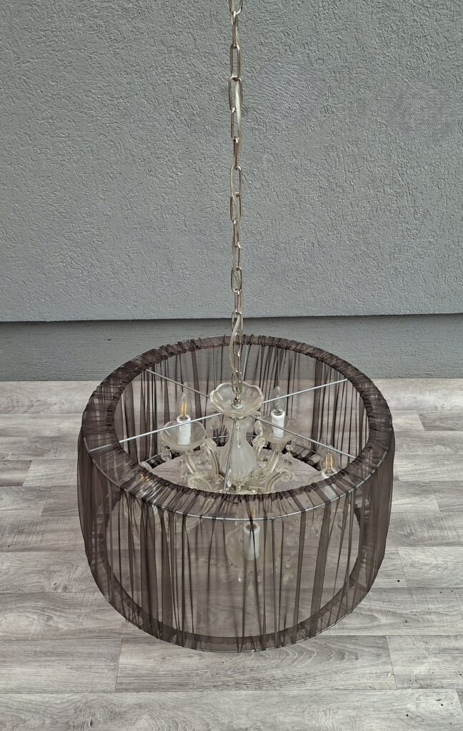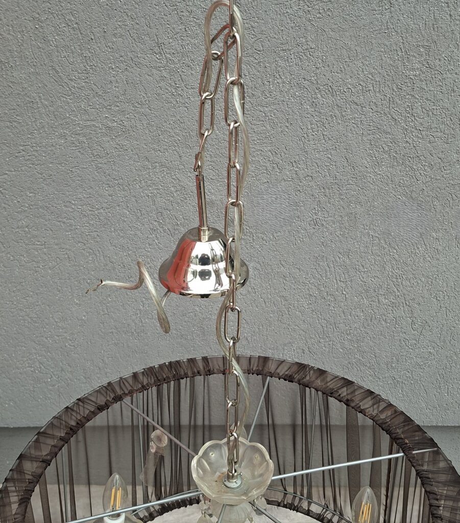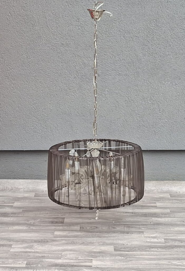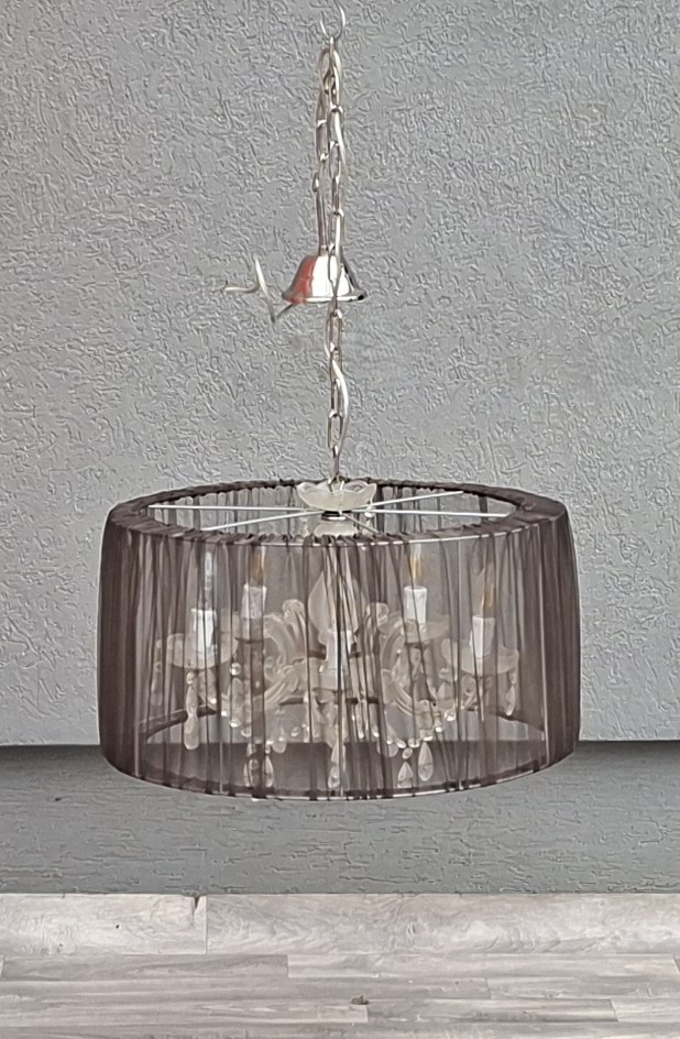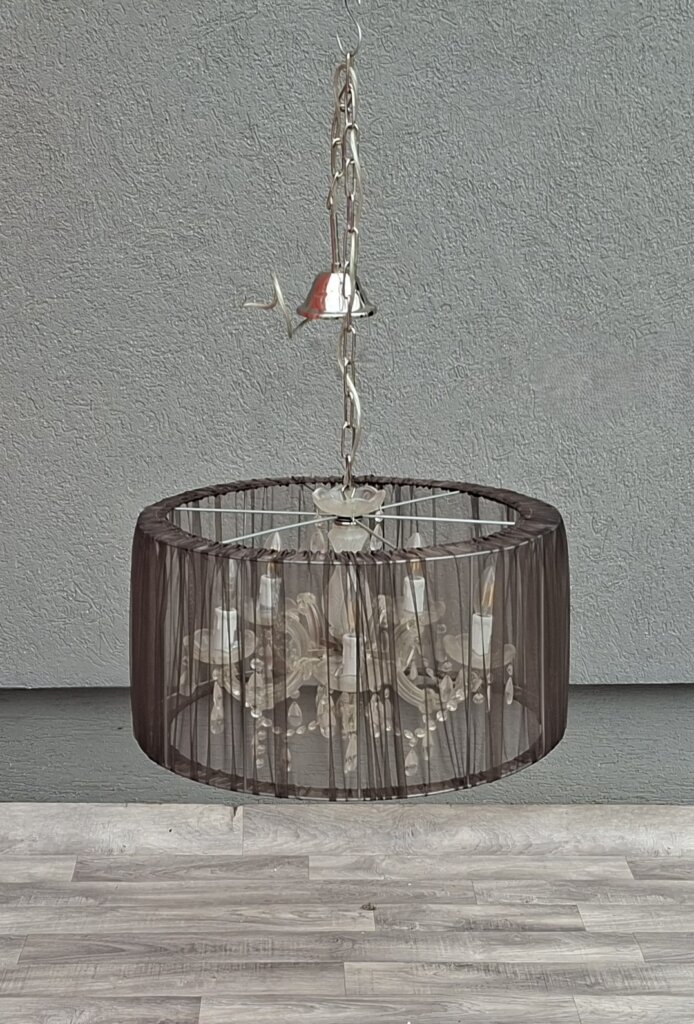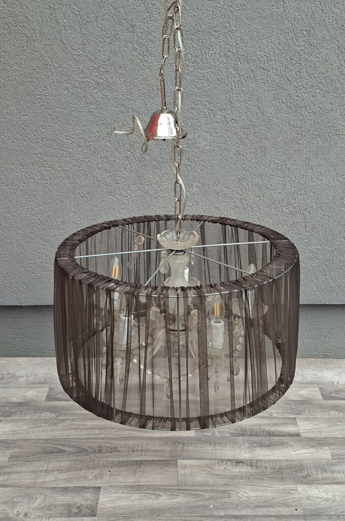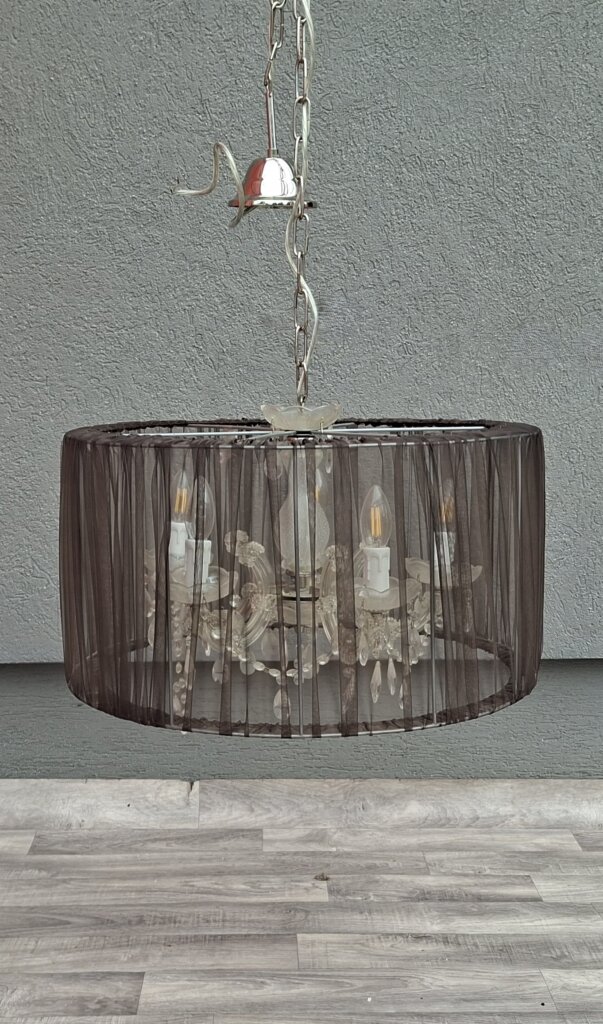 Tento päťramenný luster predstavuje dokonalú symbiózu klasického aristokratického štýlu a moderného dizajnu. Je ideálnou voľbou pre každého, kto chce do svojho interiéru vniesť nádych luxusu, no zároveň hľadá kúsok, ktorý nepôsobí príliš robustne. Jadro lustra tvorí populárny štýl Maria Theresa s jemne tvarovanými ramenami a sklenenými miskami, ktoré sú doplnené o brúsené krištáľové ovesy. Tie pri rozsvietení vytvárajú v miestnosti nádhernú hru svetla a odleskov. Čierne textilné tienidlo z jemne priehľadnej sieťoviny (organzy) elegantne tlmí priame svetlo žiaroviek. Výsledkom je príjemné, mäkké osvetlenie, ktoré neoslňuje a dodáva priestoru útulnú atmosféru. Vďaka kombinácii čiernej farby a číreho skla sa skvele hodí do moderne zariadenej obývačky, nad jedálenský stôl, ale aj do spálne ladenej v štýle glamour alebo vintage. Používaný – nevyskúšaný . Výška – 116 cm , priemer tienidla – 57 cm , výška tienidla – 60 cm .