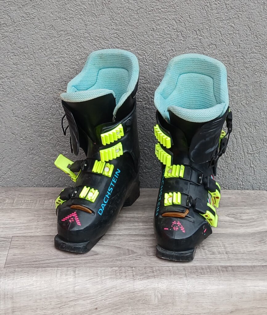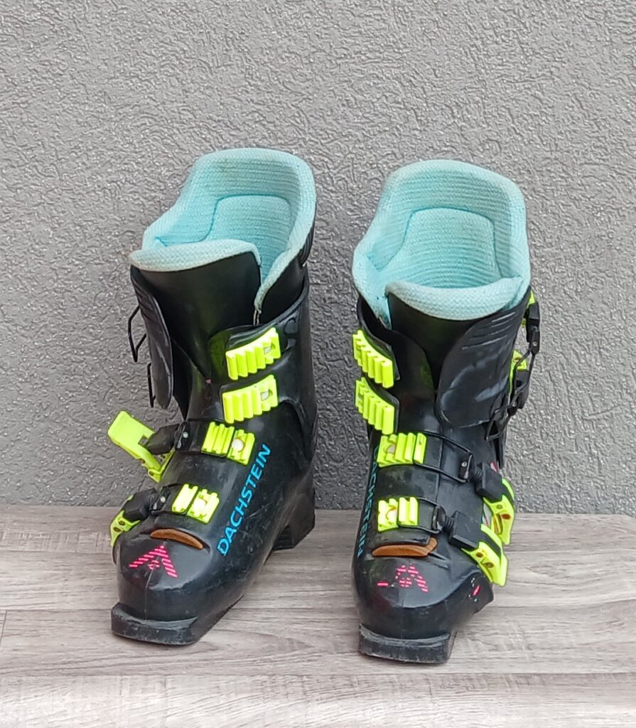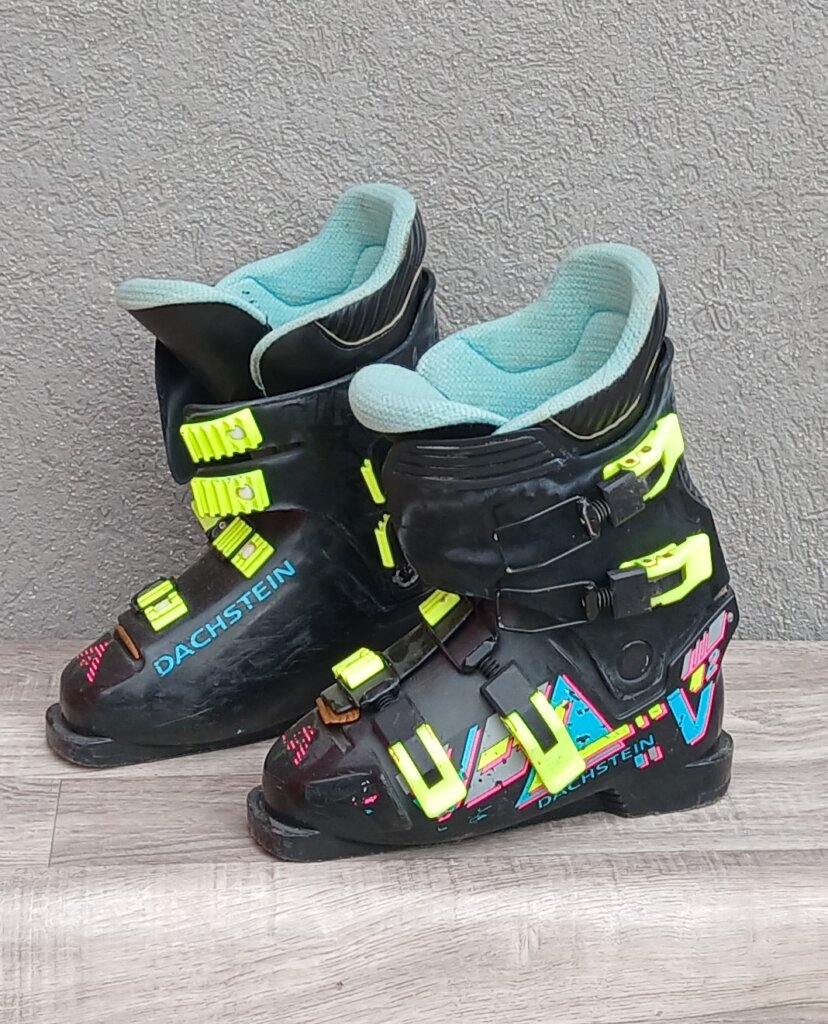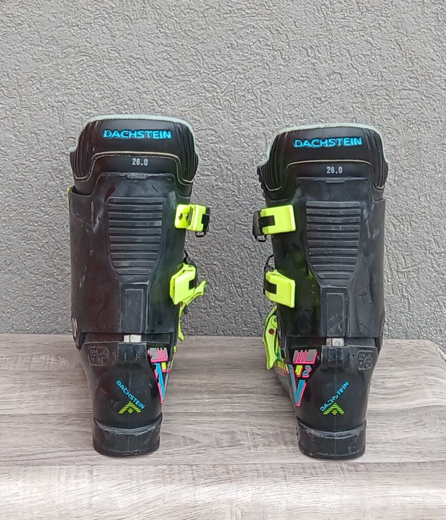 Tieto zjazdové lyžiarky sú zberateľským kúskom značky Dachstein z 80. alebo 90. rokov, ktoré sa vyznačujú retro dizajnom . Sú čiernej farby s výraznými neónovými prackami a farebnou grafikou . Vnútro topánky – výstelka je svetlo modré . Používané . Číslo 26 .