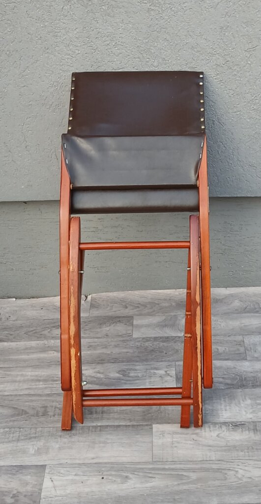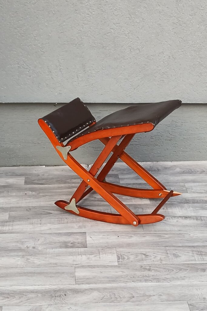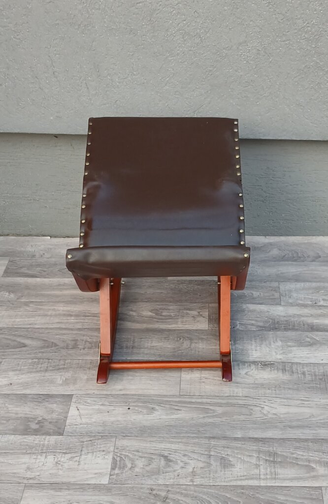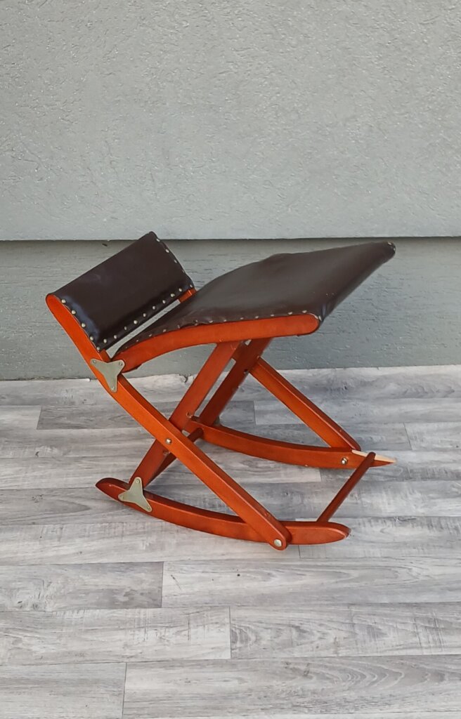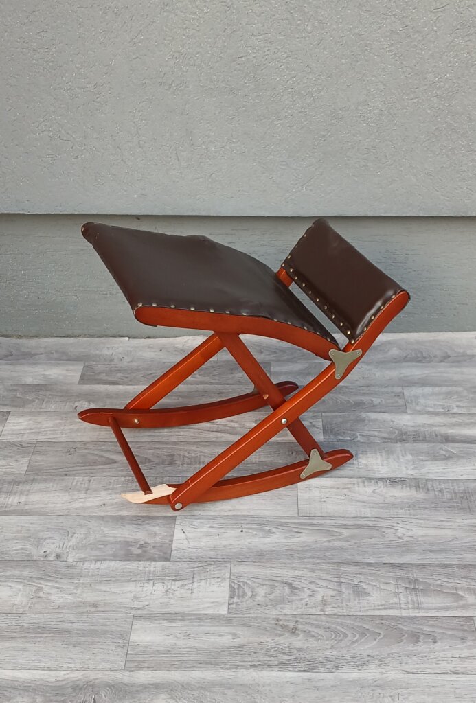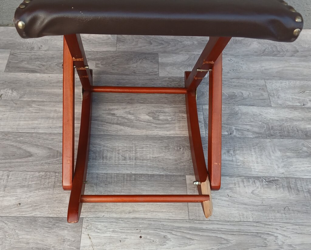 Skladacia hojdacia podnožka pod nohy , ktorá slúži na relaxáciu a úľavu unavených nôh. Ponúka tri rôzne výškové polohy, ktoré si môžete prispôsobiť podľa potreby. Konštrukcia je vyrobená z masívneho dreva , sedacia časť je čalúnená koženkou , upevnenou ozdobnými klincami. Podnožka je plne skladacia, čo uľahčuje jej uskladnenie, keď sa práve nepoužíva . Používaná s poškodením nohy viď. fotografie .Výška – 45 cm , šírka – 48 cm , hĺbka – 33 cm .