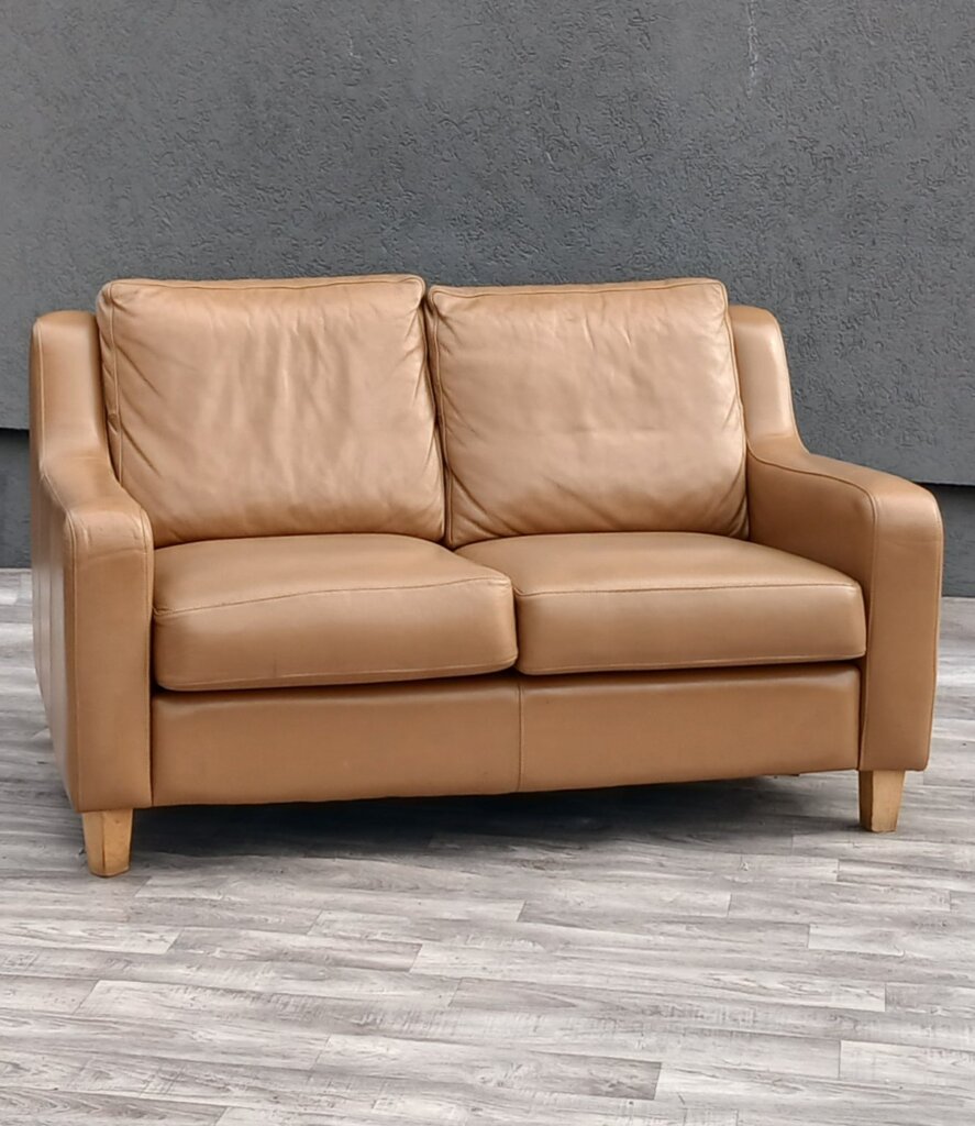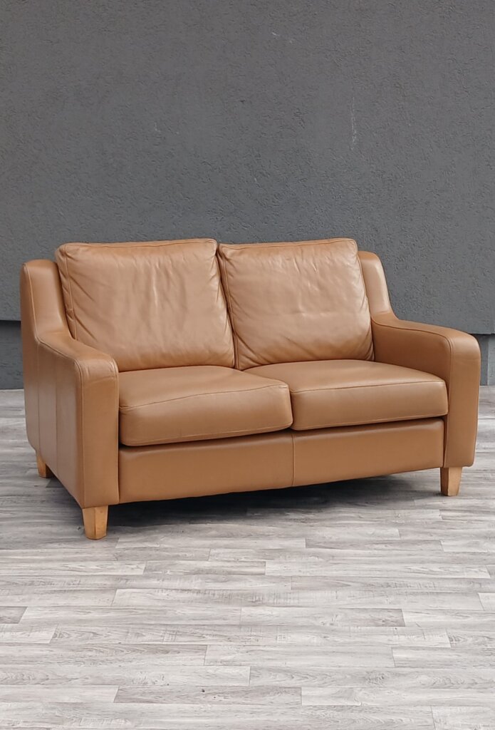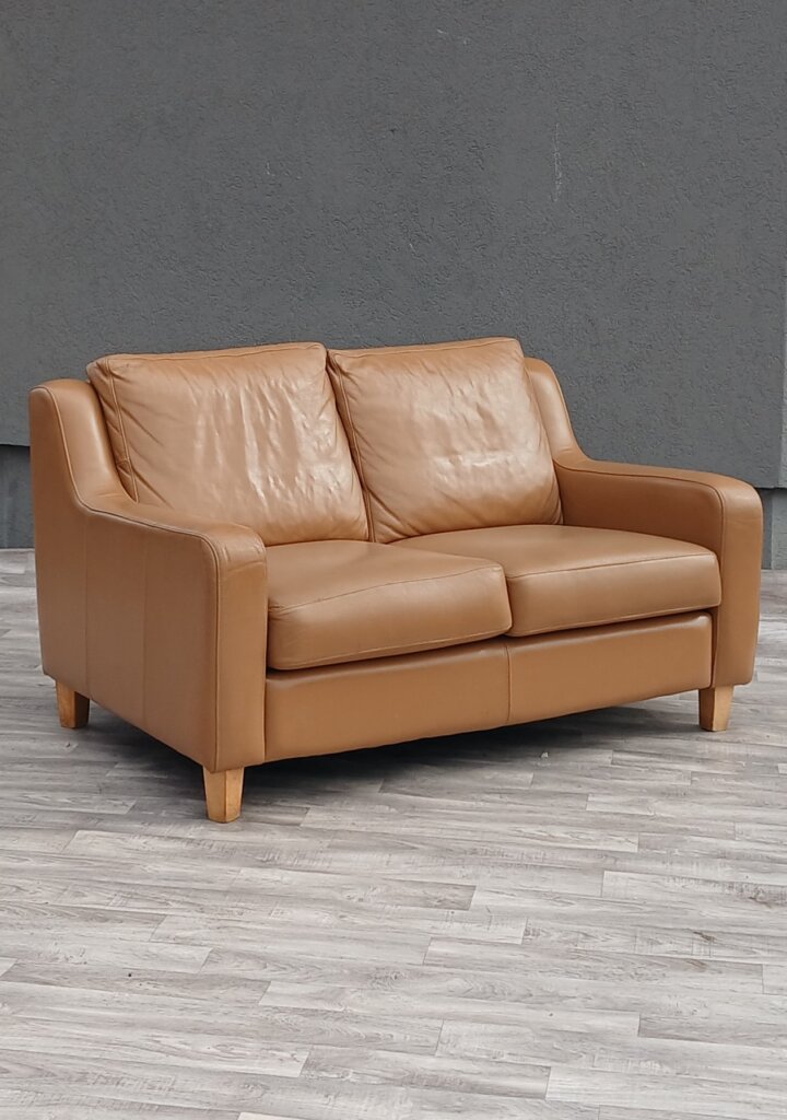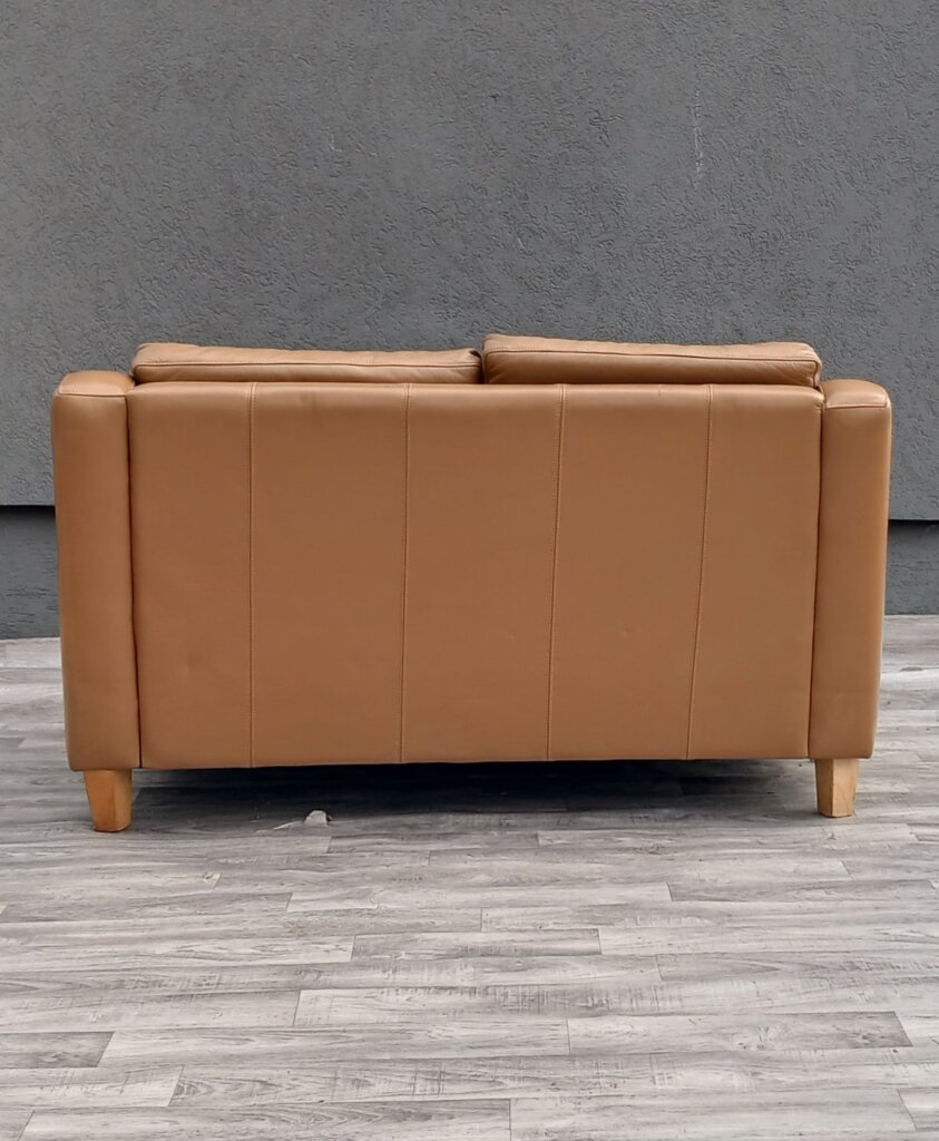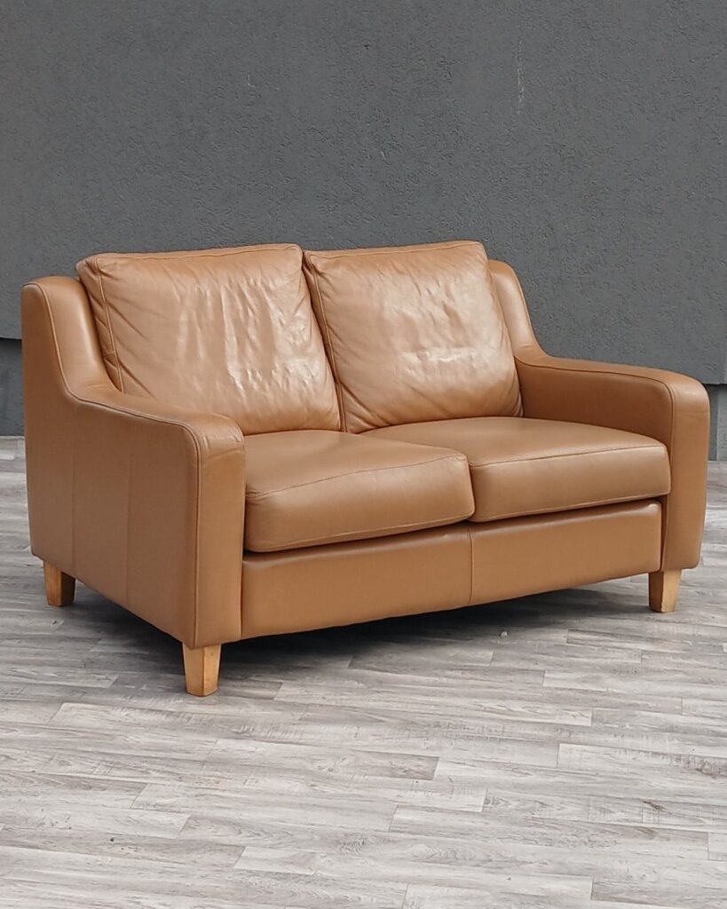 Táto dvojmiestna kožená pohovka spája nadčasovú eleganciu s moderným komfortom. Jej kompaktný dizajn je ideálny do menších obývačiek, pracovní alebo štýlových kaviarní. Kvalitné čalúnenie z kože v teplom koňakovom odtieni ,moderné čisté línie s charakteristickými skosenými podrúčkami, ktoré pohovke dodávajú ľahkosť a neformálny vzhľad. Stojí na kónických nohách zo svetlého dreva, čo vytvára jemný kontrast s tmavšou kožou . Má oddelené sedacie a oporné vankúše s bohatým polstrovaním, ktoré zabezpečujú mäkké a pohodlné sedenie. Stredový vertikálny šev na spodnom paneli svedčí o precíznom remeselnom spracovaní a zmysle pre detail. Používaná . Výška – 84 cm , šírka – 140 cm , hĺbka – 91 cm , výška sedu – 47 cm , hĺbka sedenia – 58 cm .