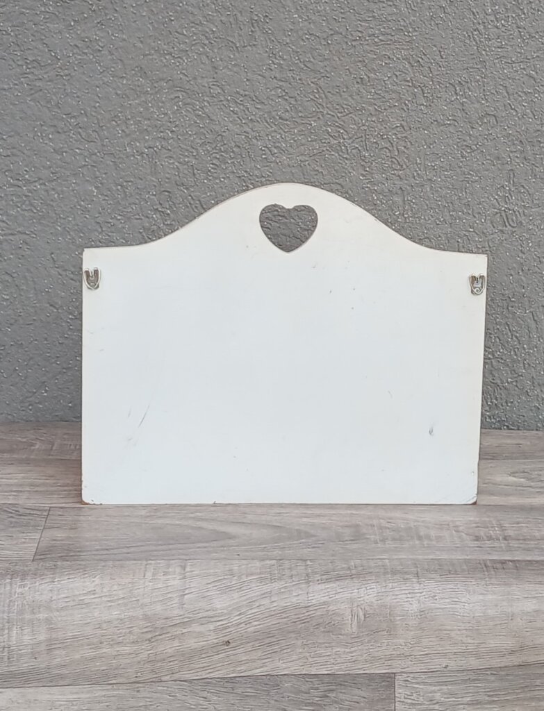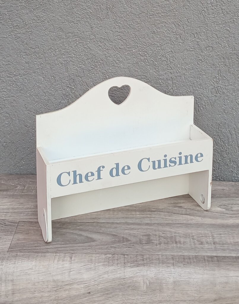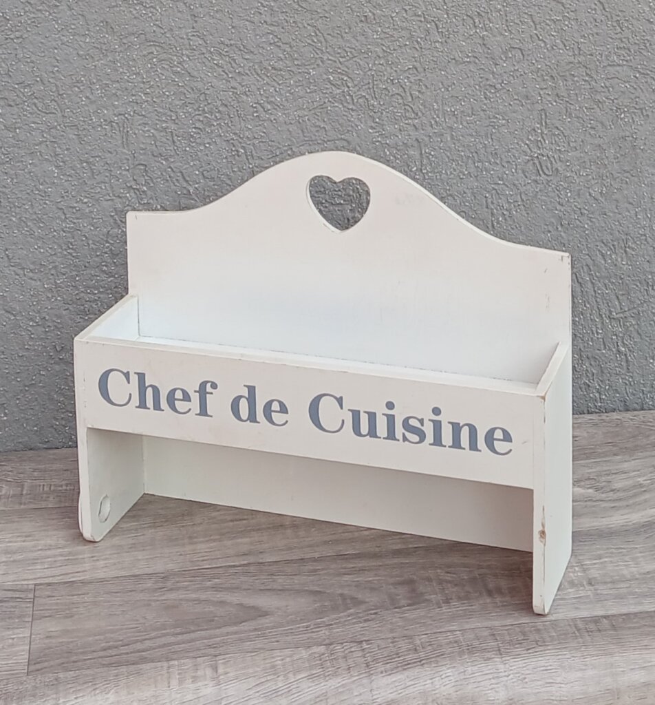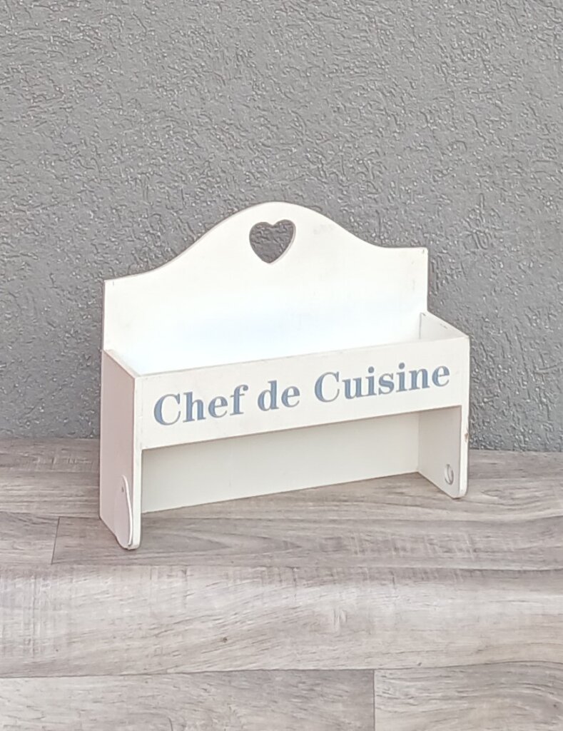 Polička , ktorá bude ideálna na odkladanie koreničiek s nádychom vidieckeho štýlu . Je vyrobená z masívneho dreva s jemnou povrchovou úpravou matná biela s decentnou patinou, ktorá podčiarkuje jej rustikálny charakter. Horná časť je dekoratívne vyrezávaná do vlnovky s centrálnym výrezom v tvare srdca. Čelnú stranu zdobí elegantný sivý nápis „Chef de Cuisine“ (v preklade šéfkuchár).Pevná základňa s vyvýšenými bočnicami zabezpečuje stabilitu uložených predmetov. Vďaka svojmu dizajnu je tento kúsok multifunkčný. Používaná . Výška – 30 cm , šírka – 36 cm , hĺbka – 10 cm .