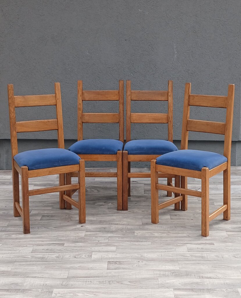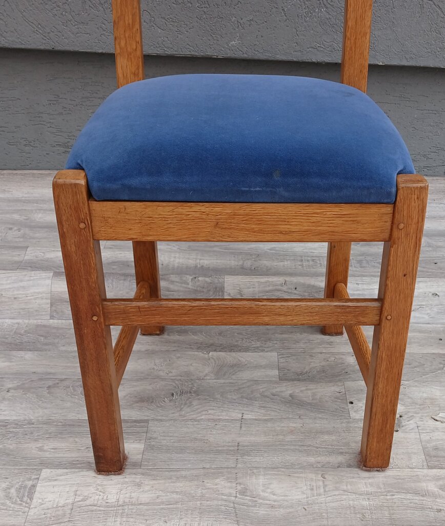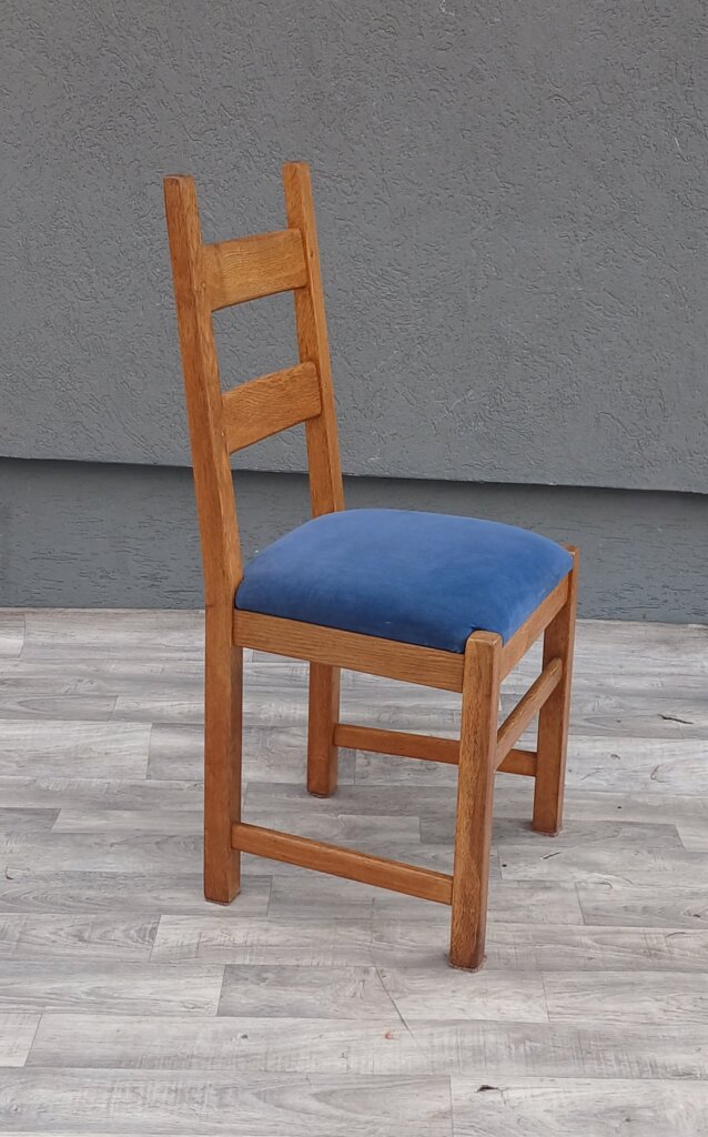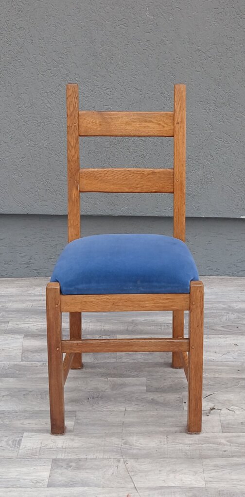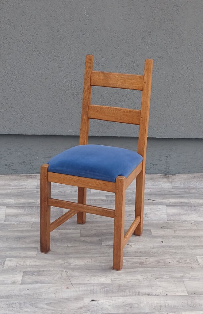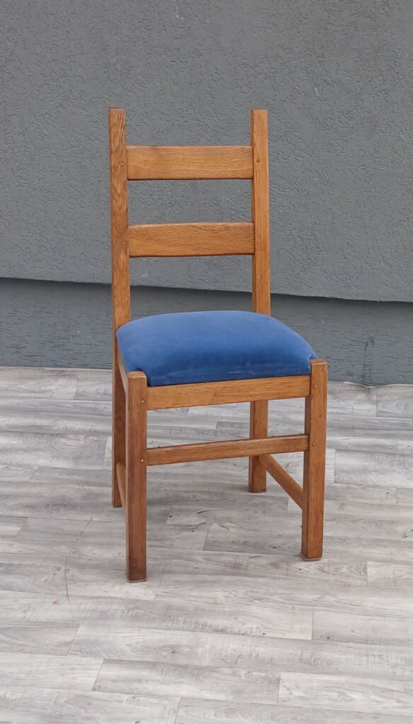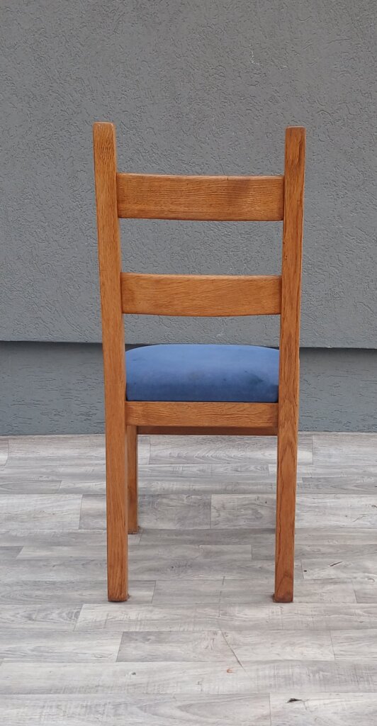 Tento set stoličiek sa vyznačuje robustným dizajnom a nadčasovým vzhľadom, ktorý kombinuje tradičné remeselné spracovanie s funkčnosťou. Stoličky sú vyrobené z masívneho dubového dreva , majú 2 široké vodorovné priečky , predĺžené zadné nohy, ktoré plynulo prechádzajú do opierky chrbta. Sedadlá sú polstrované a potiahnuté pevnou textíliou v tmavomodrej farbe, ktorá vytvára elegantný kontrast k drevu. Majú spevňujúce priečky v spodnej časti , čo zaručuje vysokú stabilitu a dlhú životnosť aj pri každodennom používaní. Ideálne sa budú hodiť do obývacích izieb a jedálni . Predáva sa iba set 4 ks. Používaný . Výška – 103 cm , šírka – 47 cm , hĺbka – 43 cm , výška sedu – 50 cm , hĺbka sedenia – 42 cm .