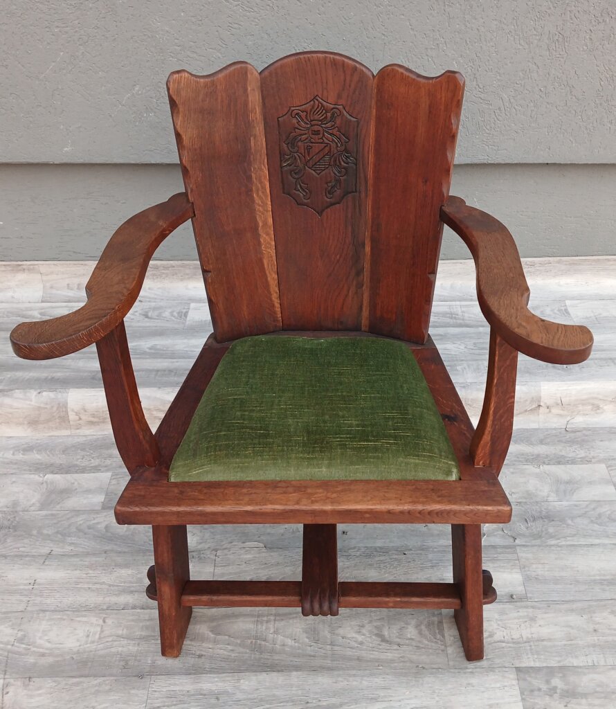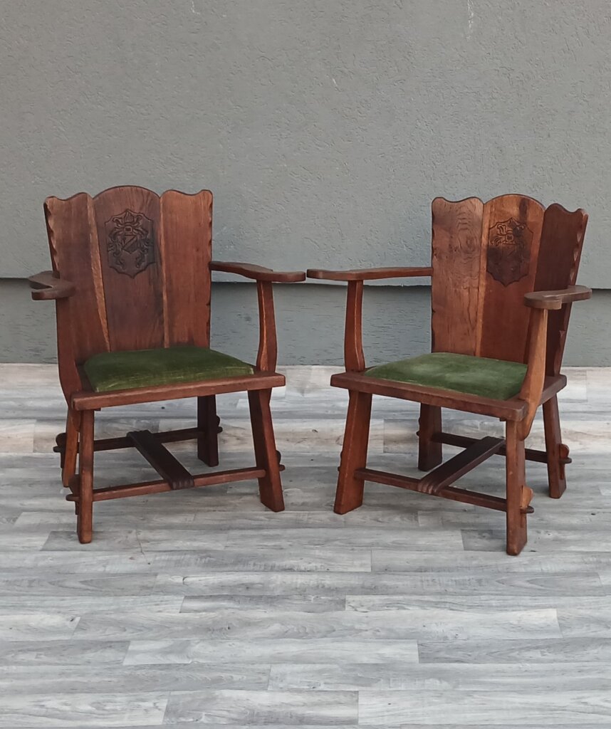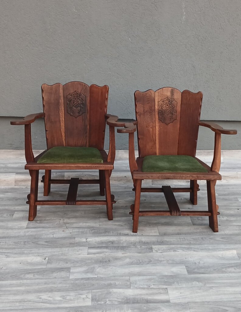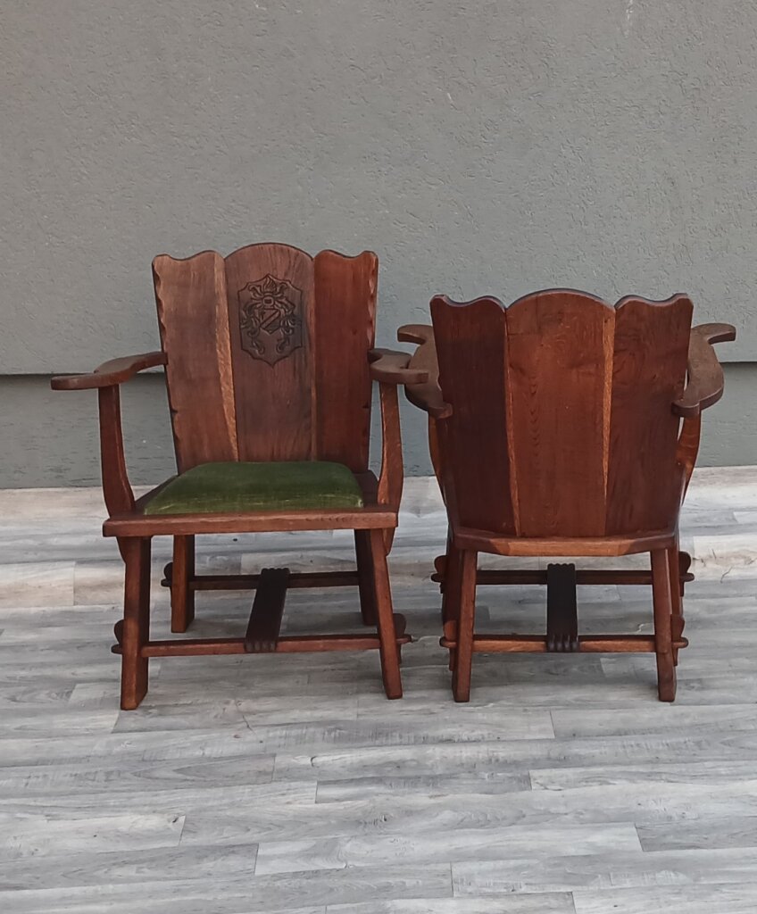 Tento set hradných kresiel často označovaný aj ako kláštorný ,je vyrobený z masívneho dubového dreva. Má robustnú konštrukciu a ozdobné prvky s historickým nádychom cca okolo roku 1910 . Na stredovom paneli operadla sa nachádza vyrezávaný ozdobný štít (erb), čo je typický prvok pre tento typ hradného, alebo kláštorného nábytku. Operadlo má po stranách jemne vlnité hrany.