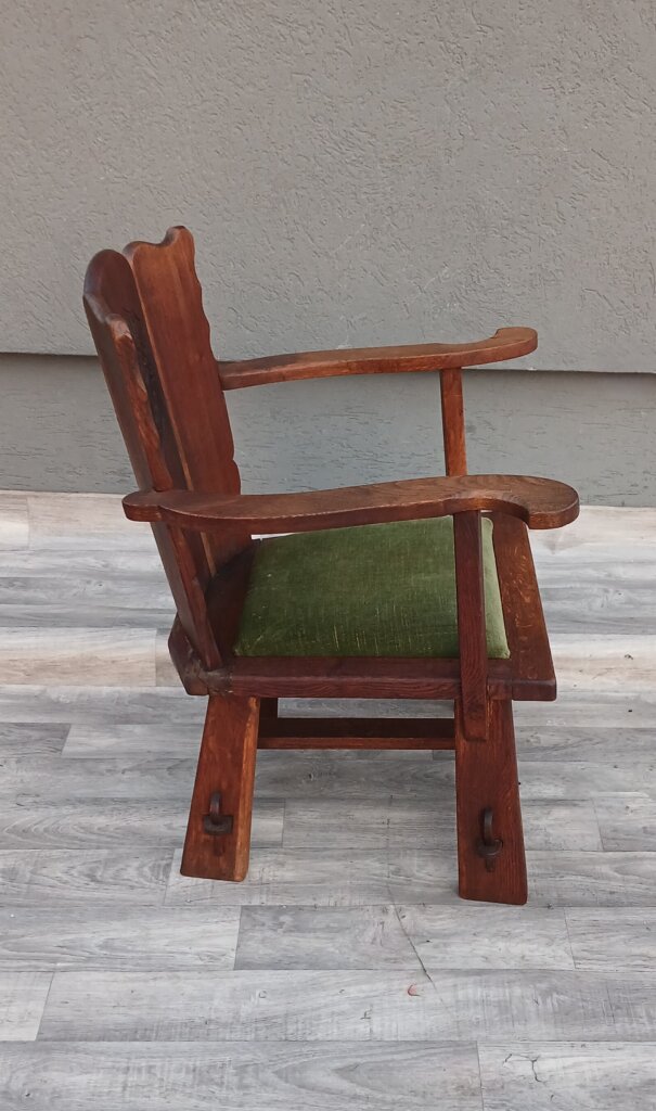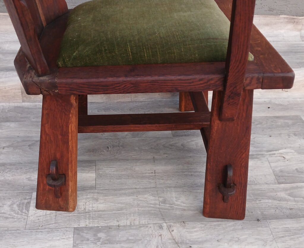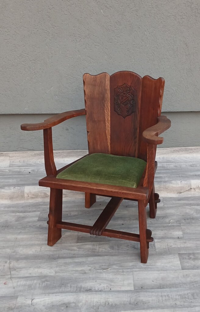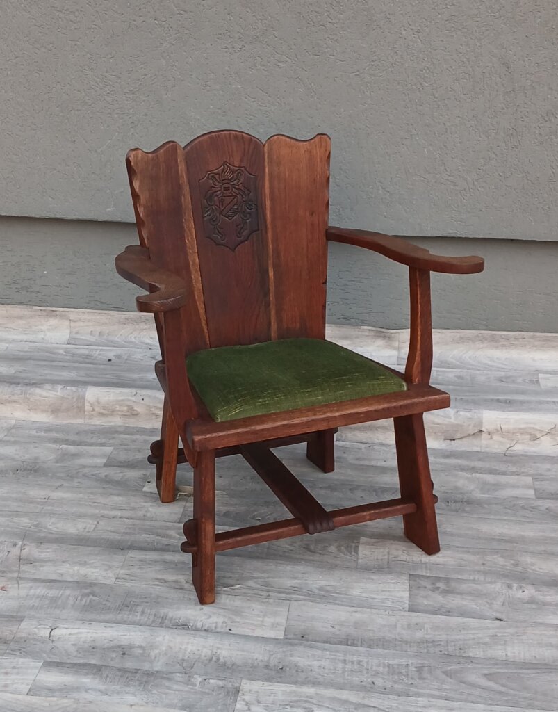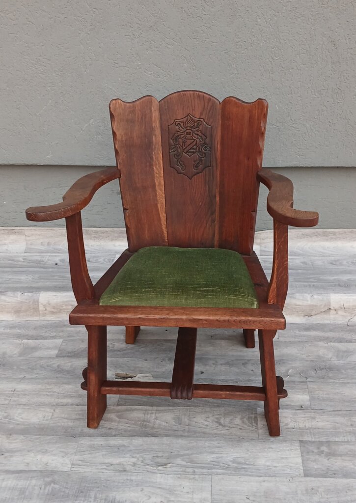 Tento set hradných kresiel často označovaný aj ako kláštorný ,je vyrobený z masívneho dubového dreva. Má robustnú konštrukciu a ozdobné prvky s historickým nádychom cca okolo roku 1910 . Na stredovom paneli operadla sa nachádza vyrezávaný ozdobný štít (erb), čo je typický prvok pre tento typ hradného, alebo kláštorného nábytku. Operadlo má po stranách jemne vlnité hrany.