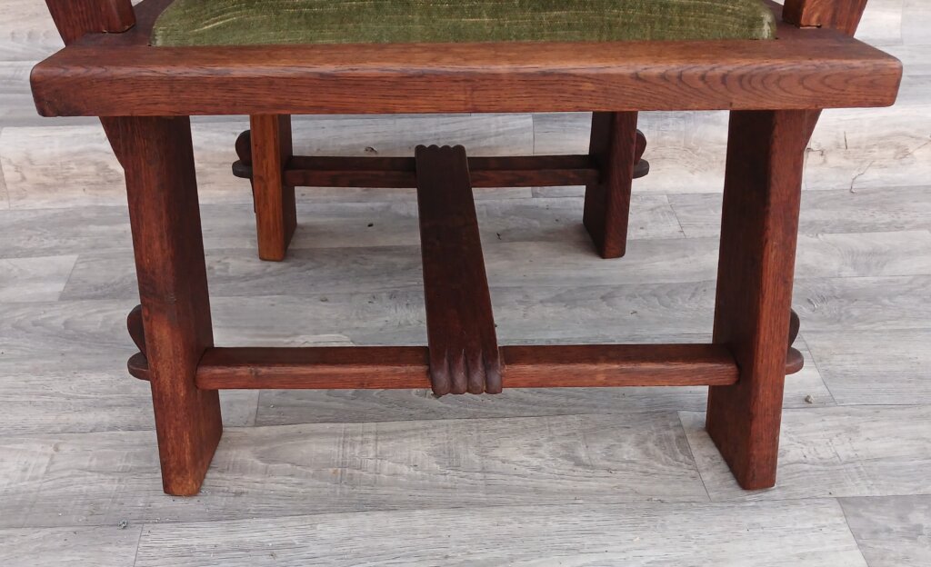 Má široké, ploché a mierne zakrivené podrúčky, ktoré mu dodávajú stabilitu a pohodlie. Nohy sú v spodnej časti prepojené pevnou krížovou podstavou. Má pôvodné zelené zamatové čalúnenie . Predáva sa iba set 2 ks . Používané . Výška – 79 cm , šírka – 69 cm , hĺbka – 48 cm , výška sedu – 36 cm , hĺbka sedenia – 43 cm .