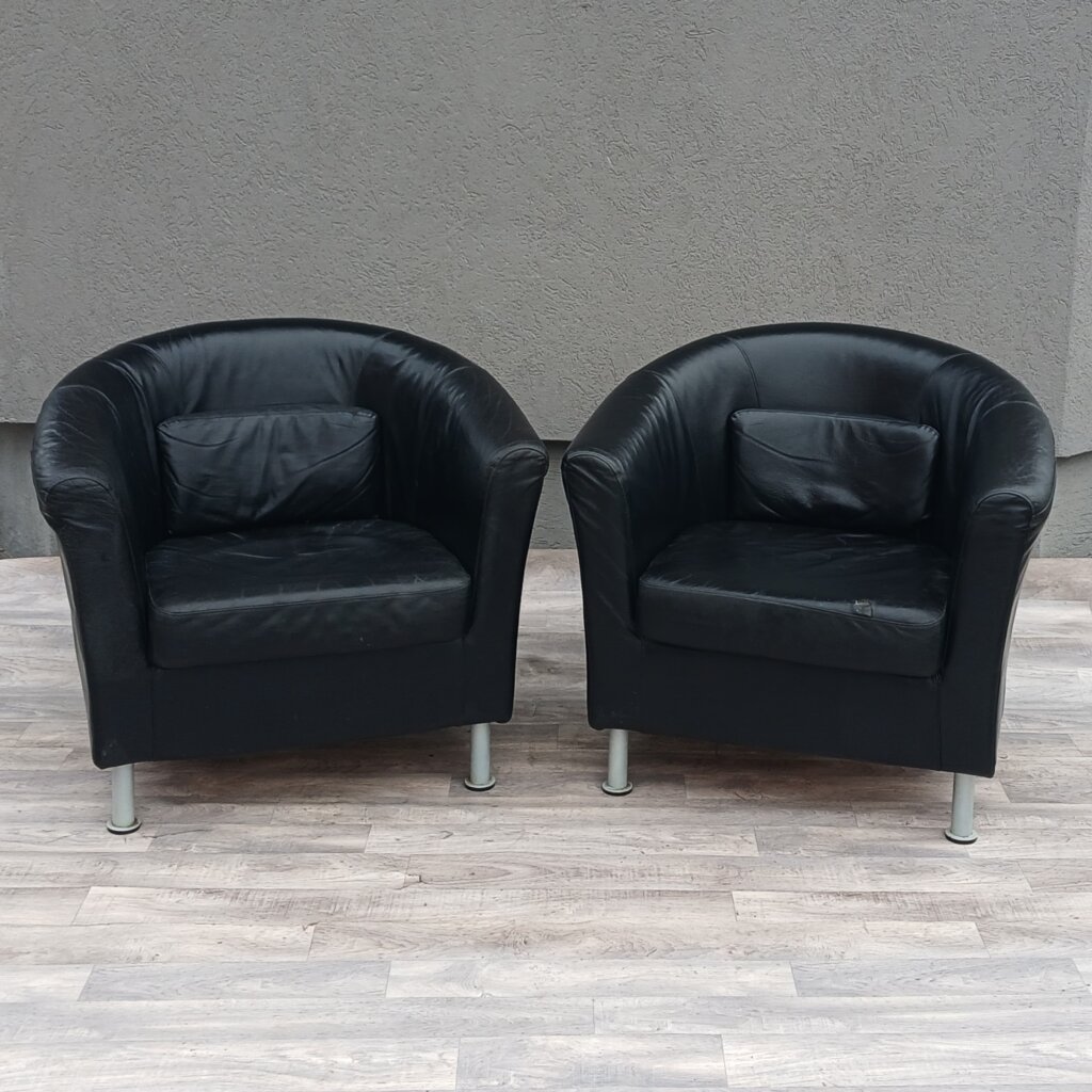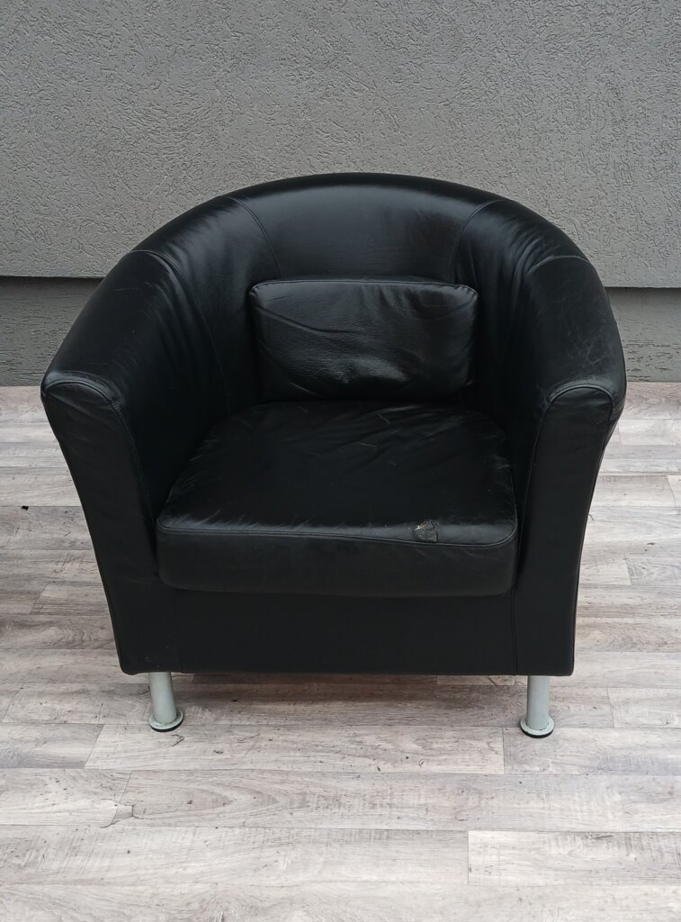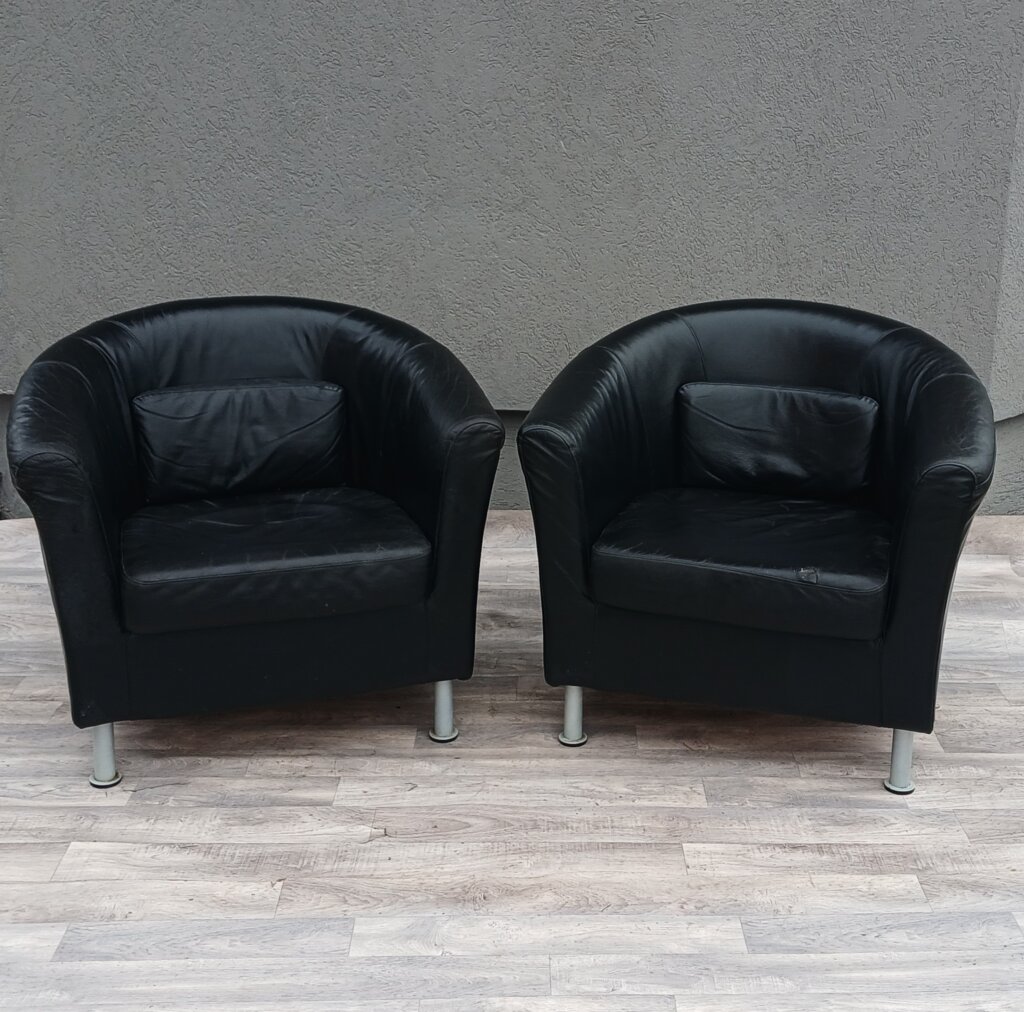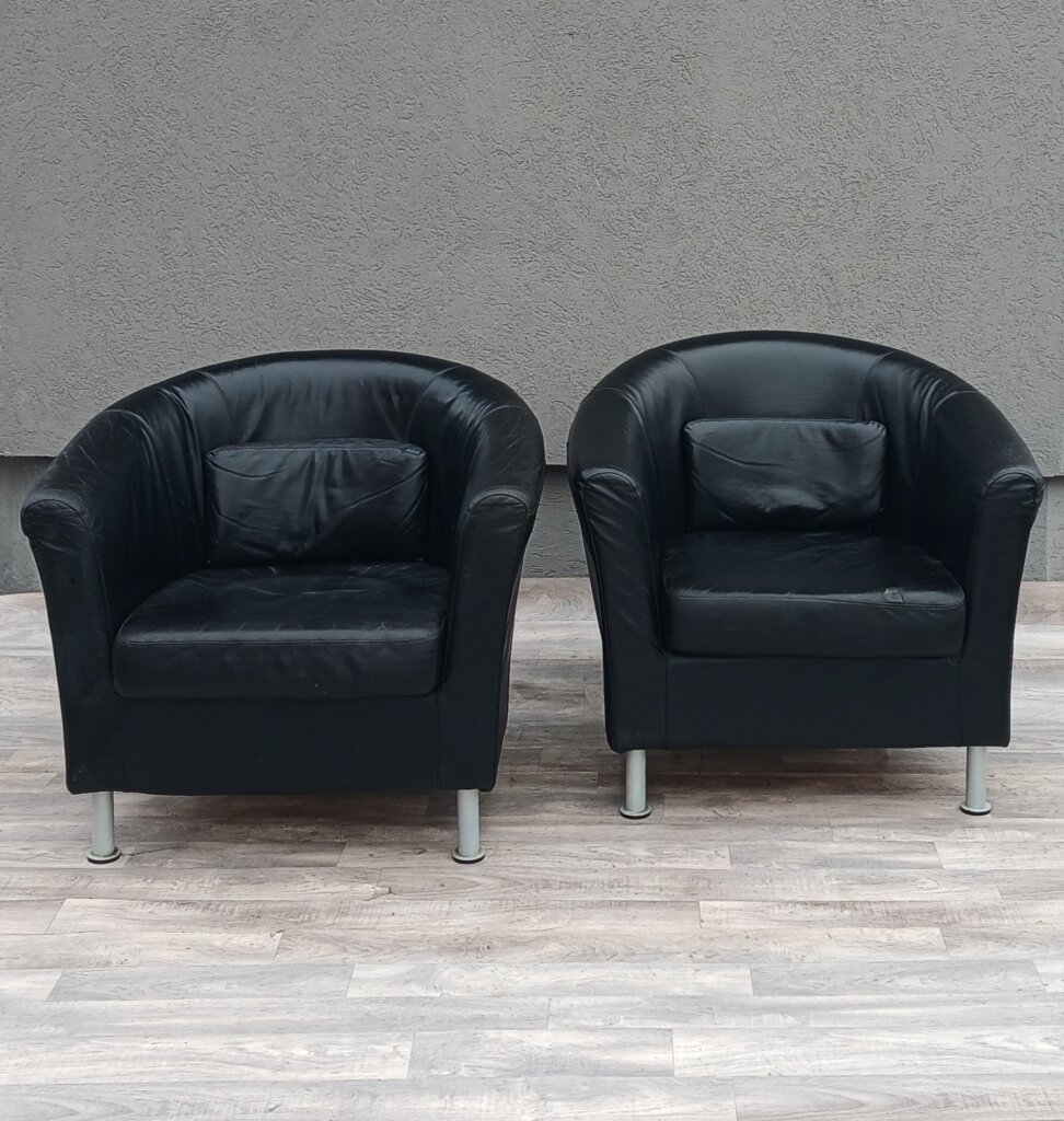 Tieto klubové kreslá, ktoré majú zaoblený dizajn s opierkami sú čalúnené čiernou kožou , majú odnímateľný sedací vankúš a kovové nohy. Budú sa hodiť do rôznych interiérov, od obývačiek až po kancelárie. Predáva sa iba set 2 ks . Jedno z kresiel má poškodenie viď. fotografie . Výška – 74 cm , šírka – 81 cm , hĺbka – 70 cm , výška sedu – 41 cm , hĺbka sedenia – 50 cm .
