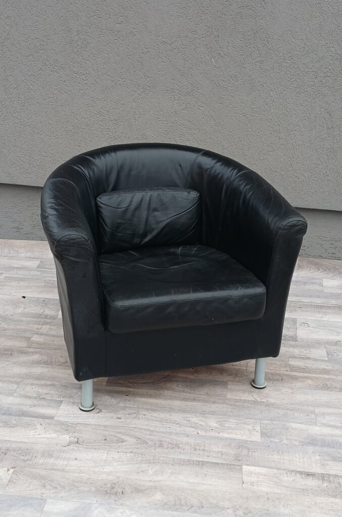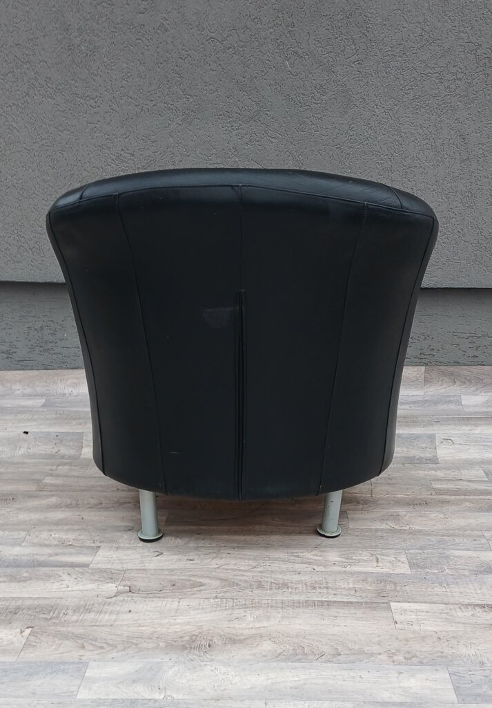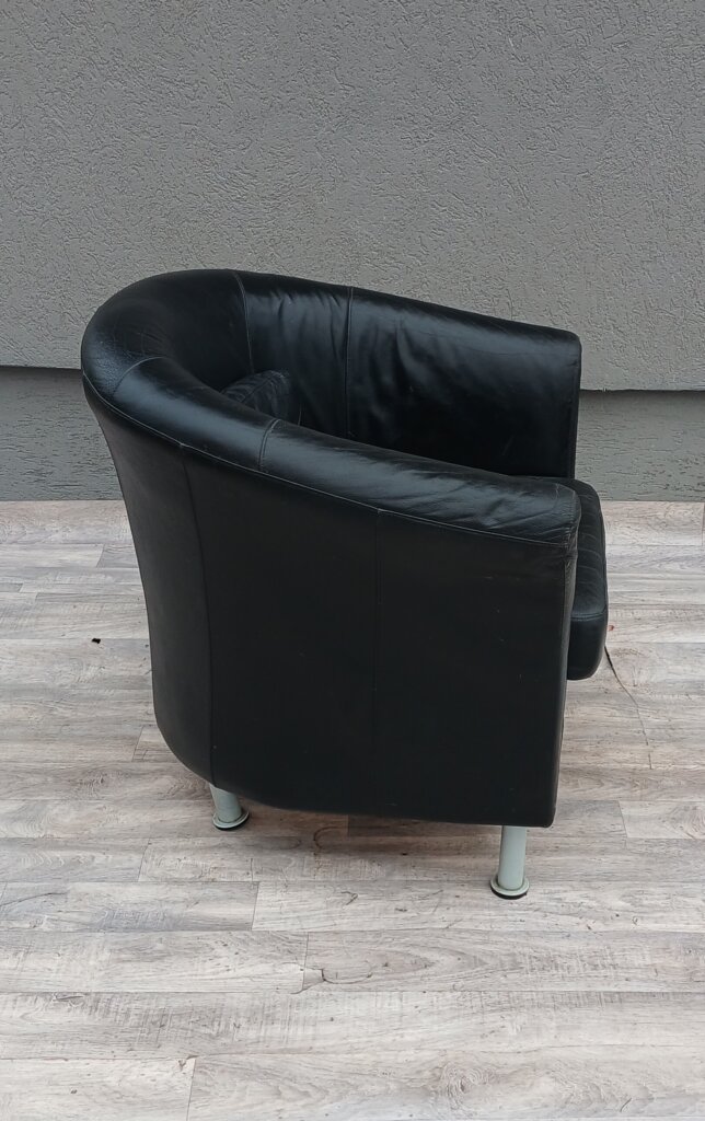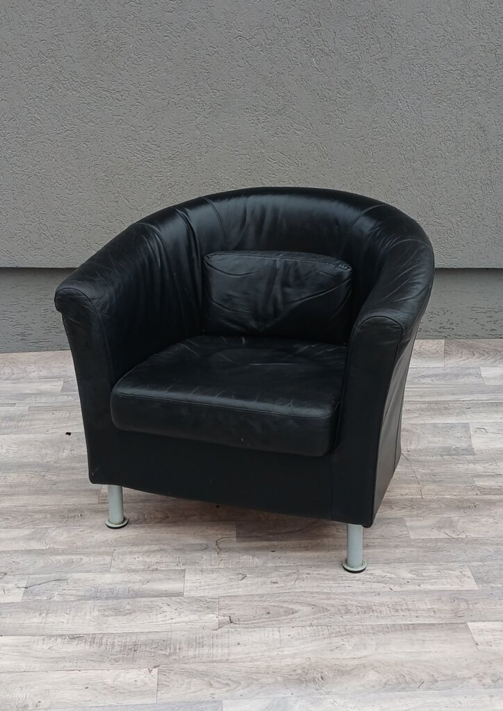 Tieto klubové kreslá, ktoré majú zaoblený dizajn s opierkami sú čalúnené čiernou kožou , majú odnímateľný sedací vankúš a kovové nohy. Budú sa hodiť do rôznych interiérov, od obývačiek až po kancelárie. Predáva sa iba set 2 ks . Jedno z kresiel má poškodenie viď. fotografie . Výška – 74 cm , šírka – 81 cm , hĺbka – 70 cm , výška sedu – 41 cm , hĺbka sedenia – 50 cm .