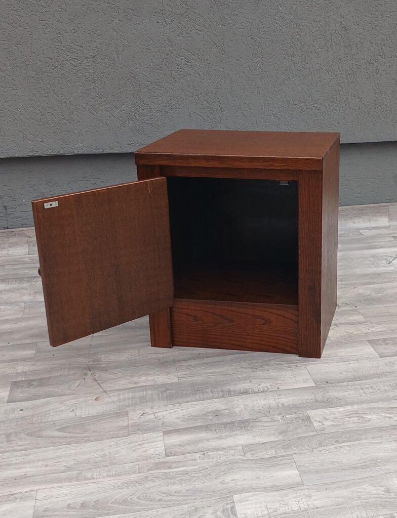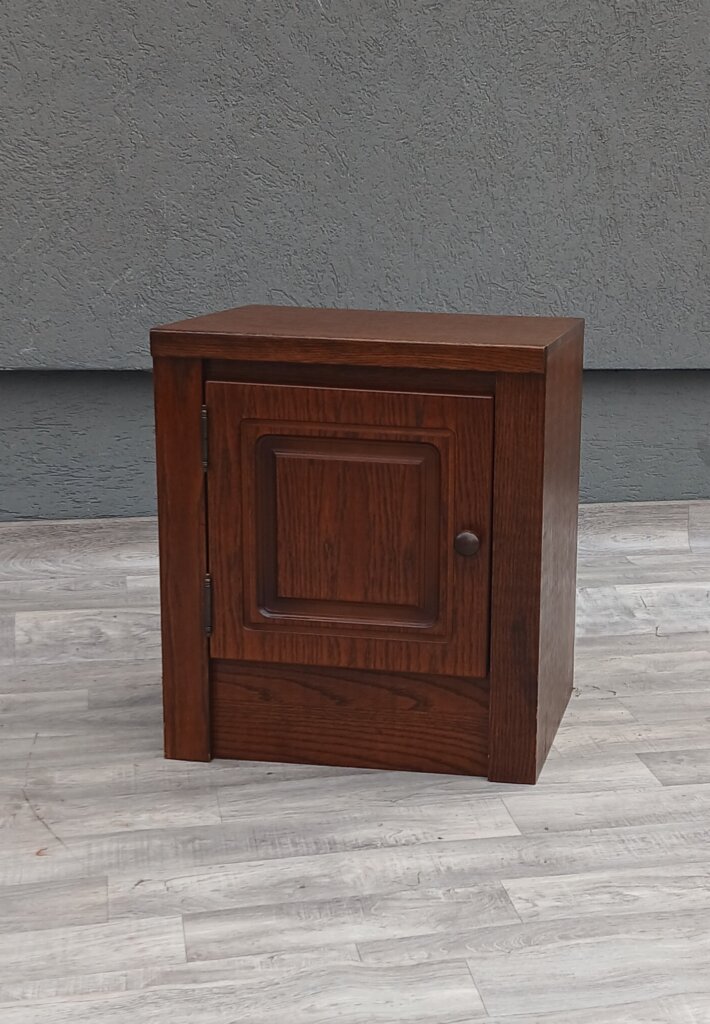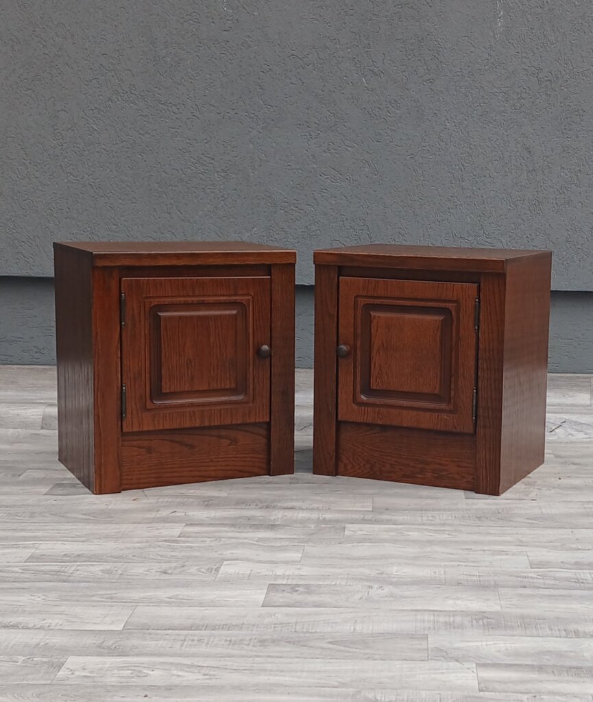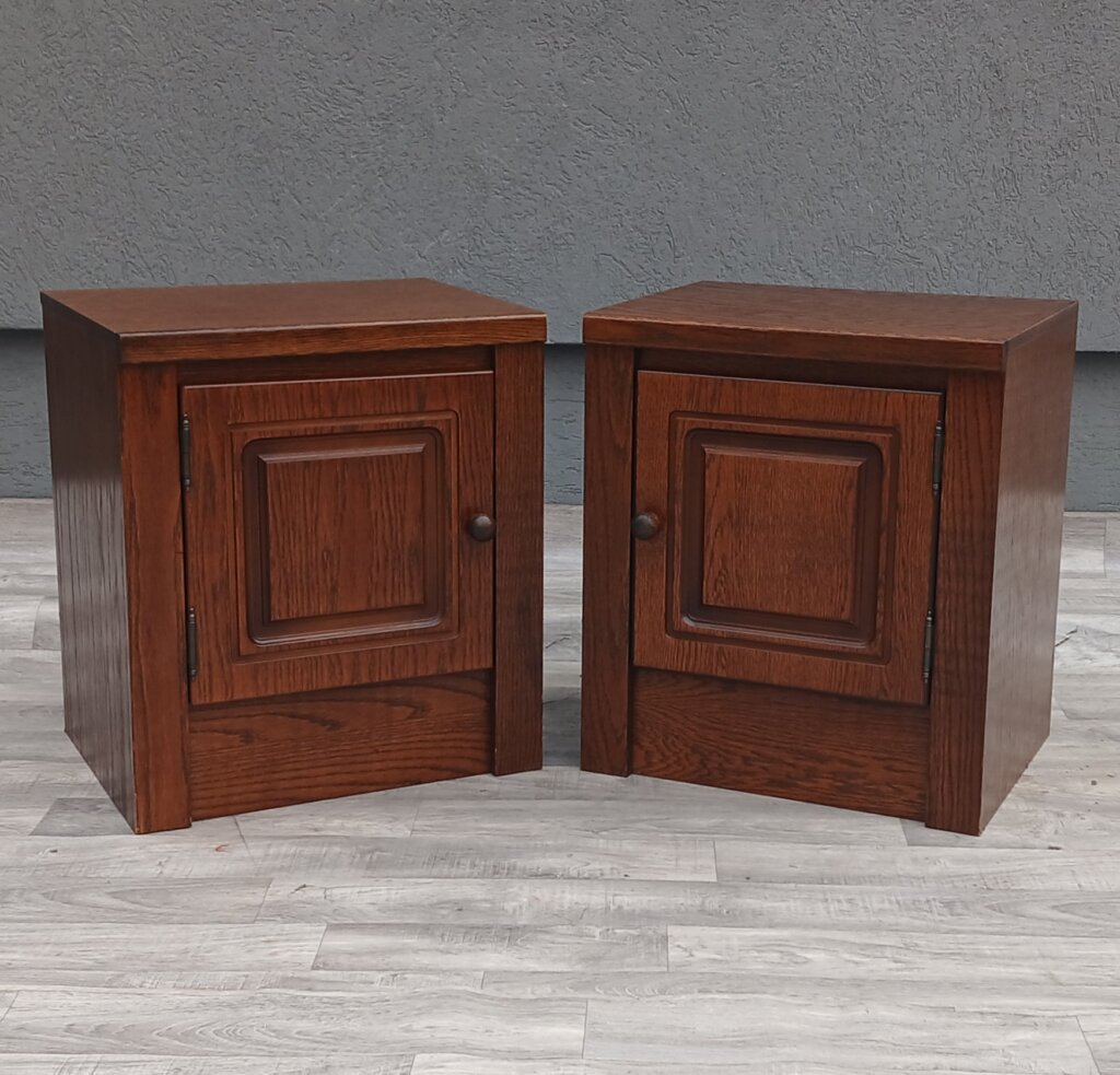 Tento set dvoch dubových nočných stolíkov , ktoré sú mimoriadne stabilné s prirodzenou krásnou kresbou dreva v teplom hnedom odtieni sa budú hodiť nielen do rustikálnych a koloniálnych spální, ale aj ako štýlové odkladacie stolíky do obývačky v klasickom štýle. Hranatý tvar s čistými líniami dopĺňajú kazetové dvierka s ozdobným frézovaním. Každý stolík disponuje priestrannou vnútornou skrinkou, ktorá je ideálna na odkladanie kníh, elektroniky či osobných vecí. Nenápadné okrúhle drevené úchytky a priznané bočné pánty umocňujú ich rustikálny až mierne „vintage“ charakter. Používané . Predáva sa iba set 2 ks. Výška – 58 cm , šírka – 51 cm , hĺbka – 41 cm .