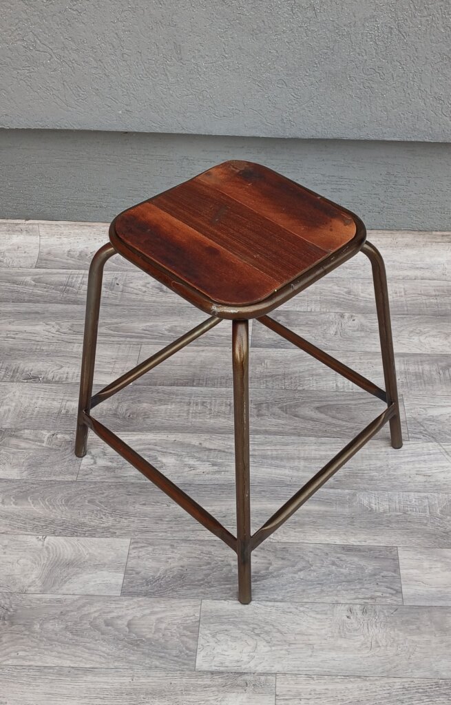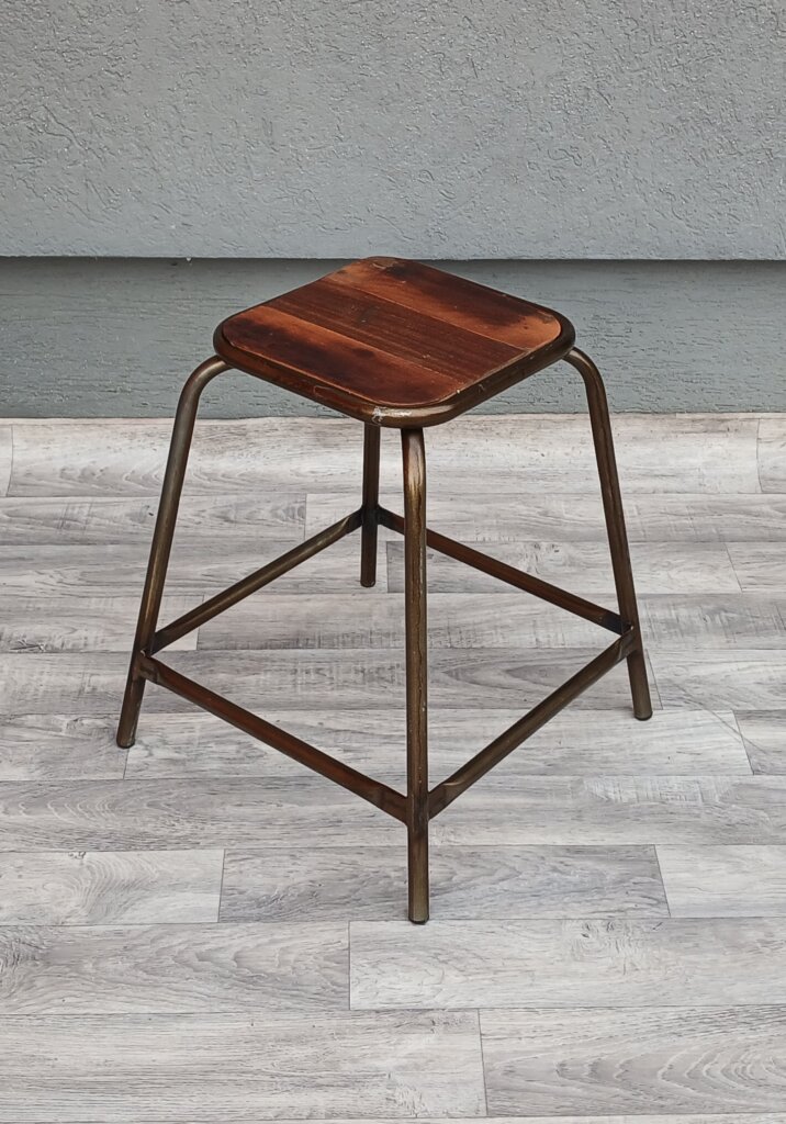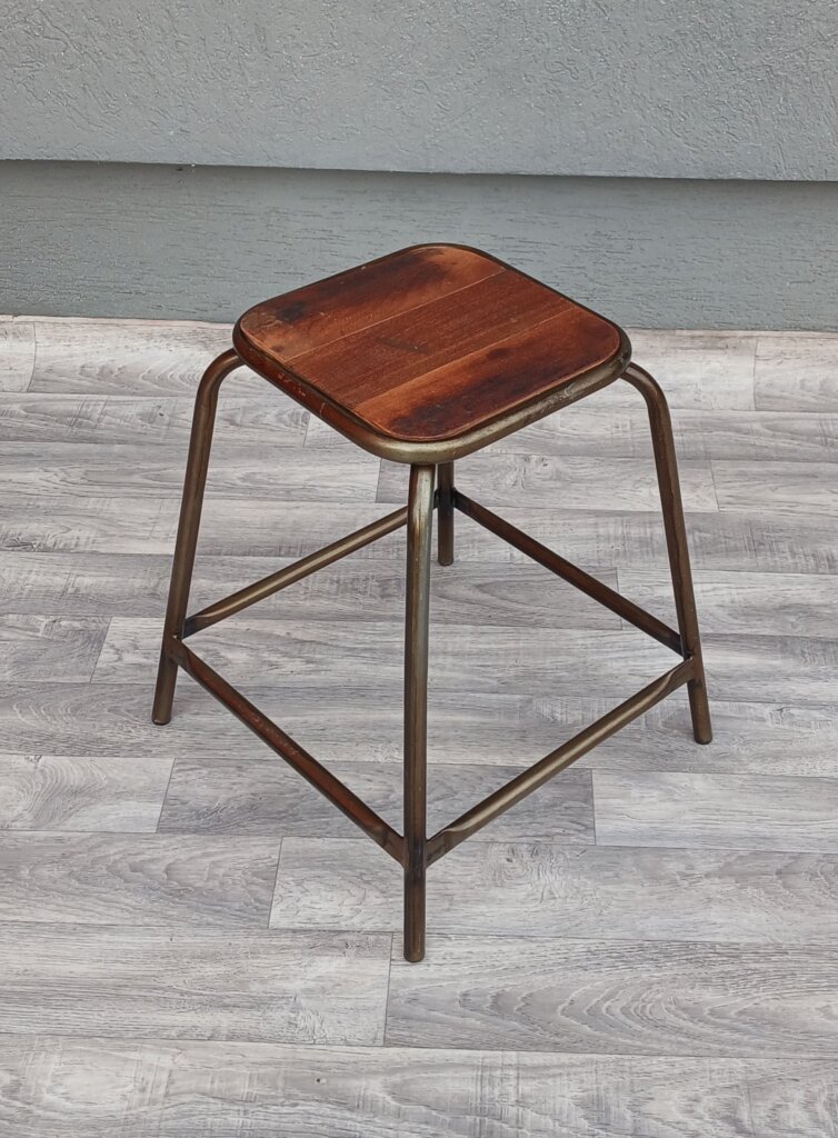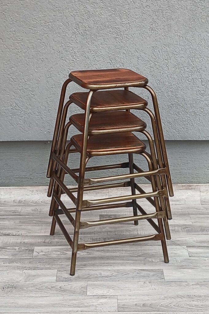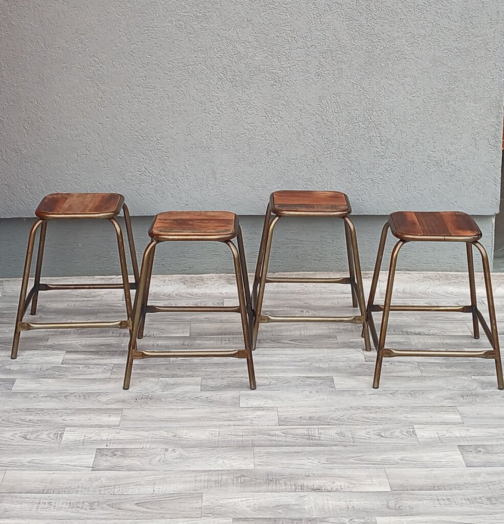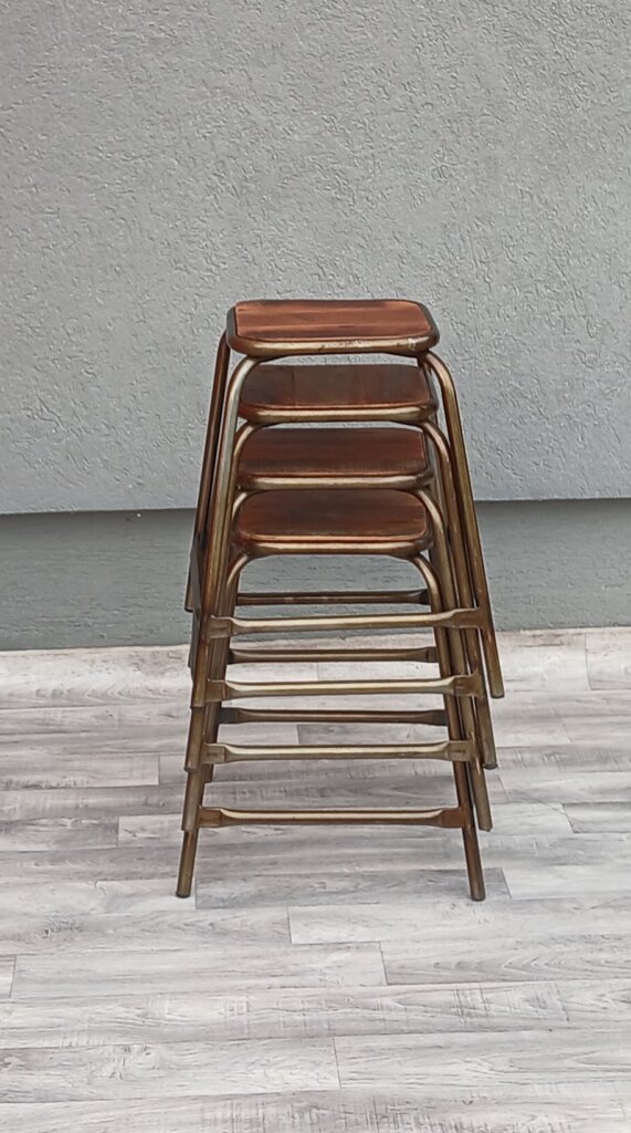 Stohovateľná bistro stolička v industriálnom štýle , alebo laboratórna stolička v kombinácii kovu a masívneho recyklovaného dreva je pevná a stabilná . Stoličky sú plne stohovateľné, čo umožňuje ich jednoduché skladovanie . Predáva sa iba set 4 ks . Používané . Výška – 48 cm , šírka – 39 cm , hĺbka – 39 cm , sedacia časť – 29 x 29 cm .