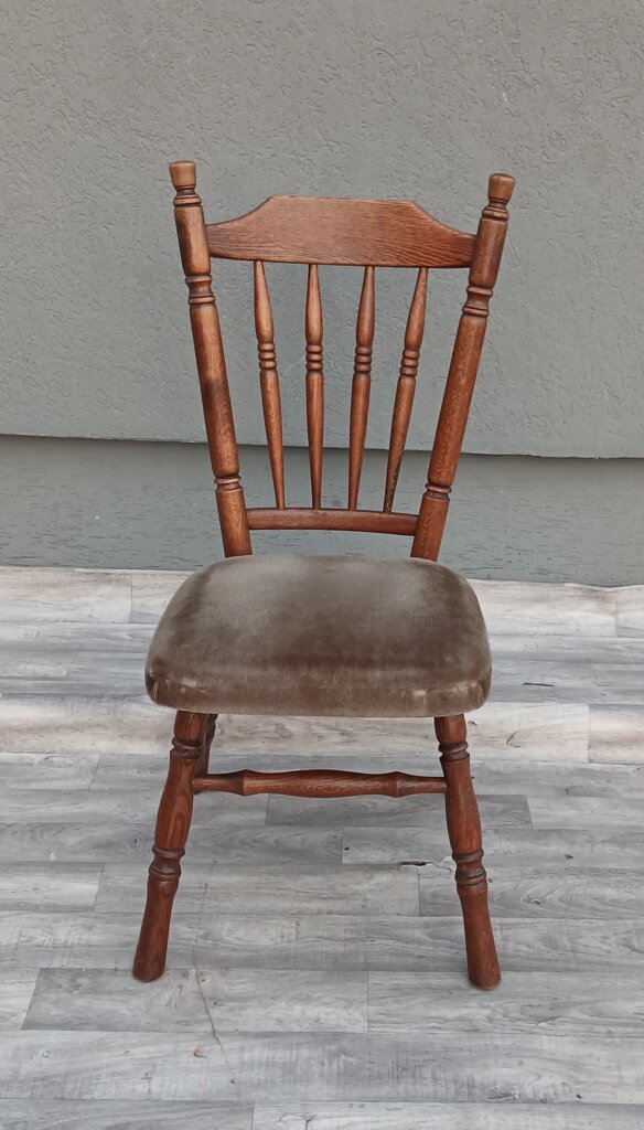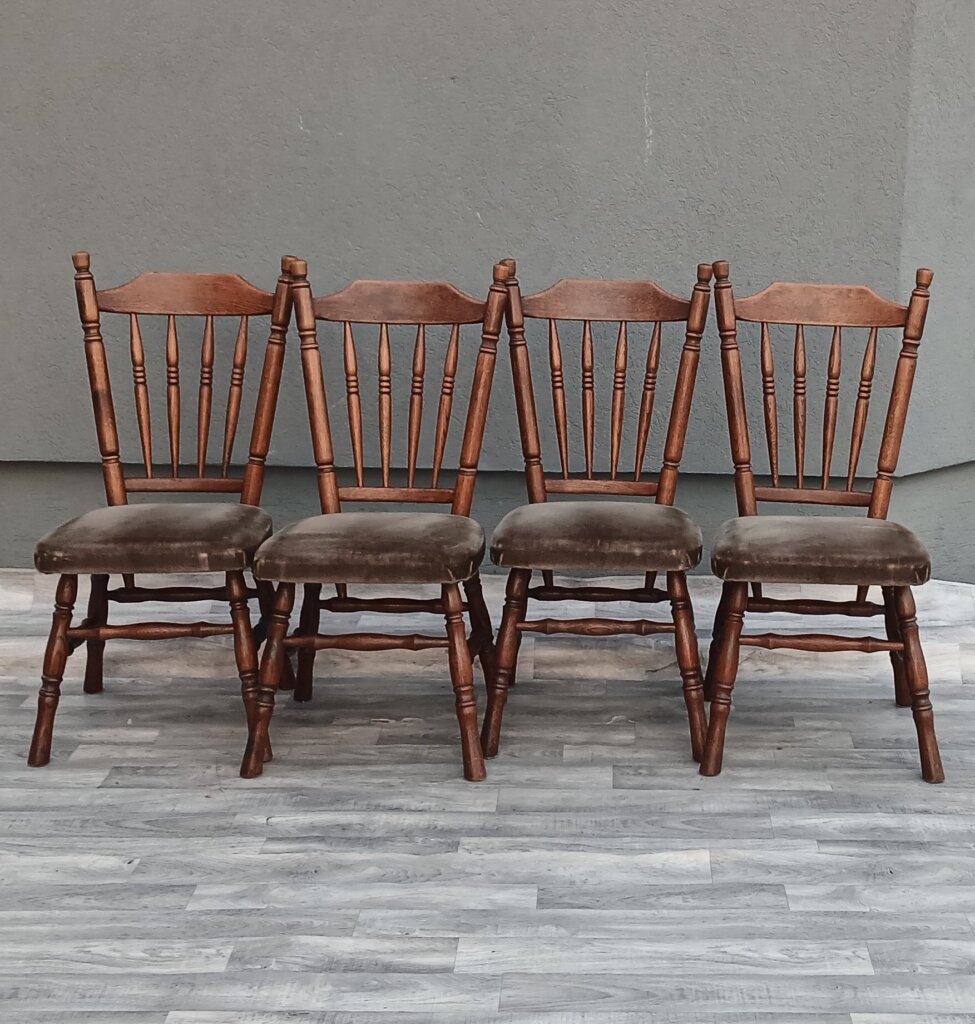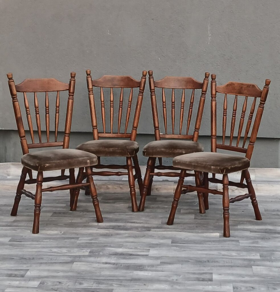 Set drevených jedálenských stoličiek v štýle Windsor, ktoré sa vyznačujú vysokým operadlom s vertikálnymi priečkami a tvarovaným sedadlom. Sú vyrobené z masívneho dubového dreva a majú čalúnené sedadlá potiahnuté zamatovou látkou . Vhodné do rôznych typov interiérov .Používané . Predáva sa iba set 4 ks. Výška – 97 cm , šírka – 44 cm , hĺbka – 50 cm , výška sedu – 46 cm , hĺbka sedenia – 45 cm .