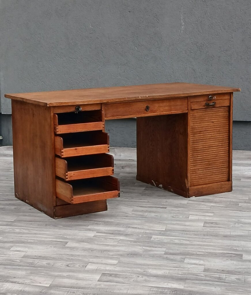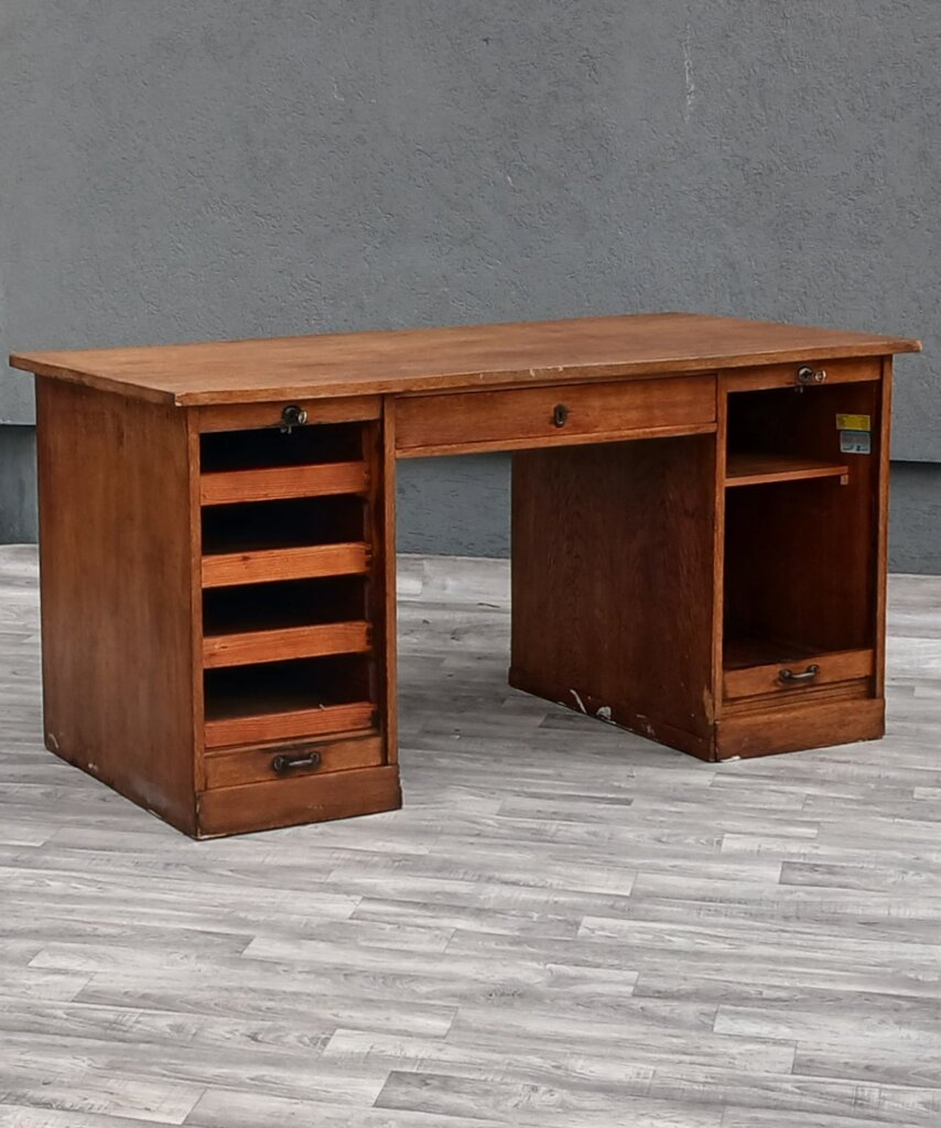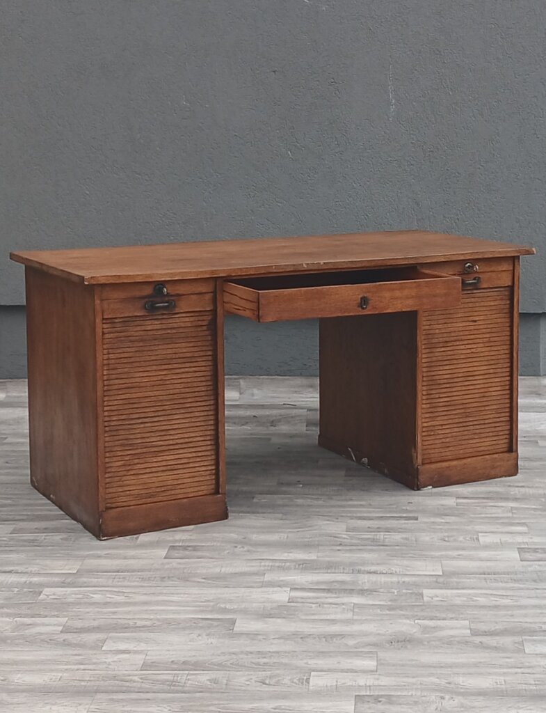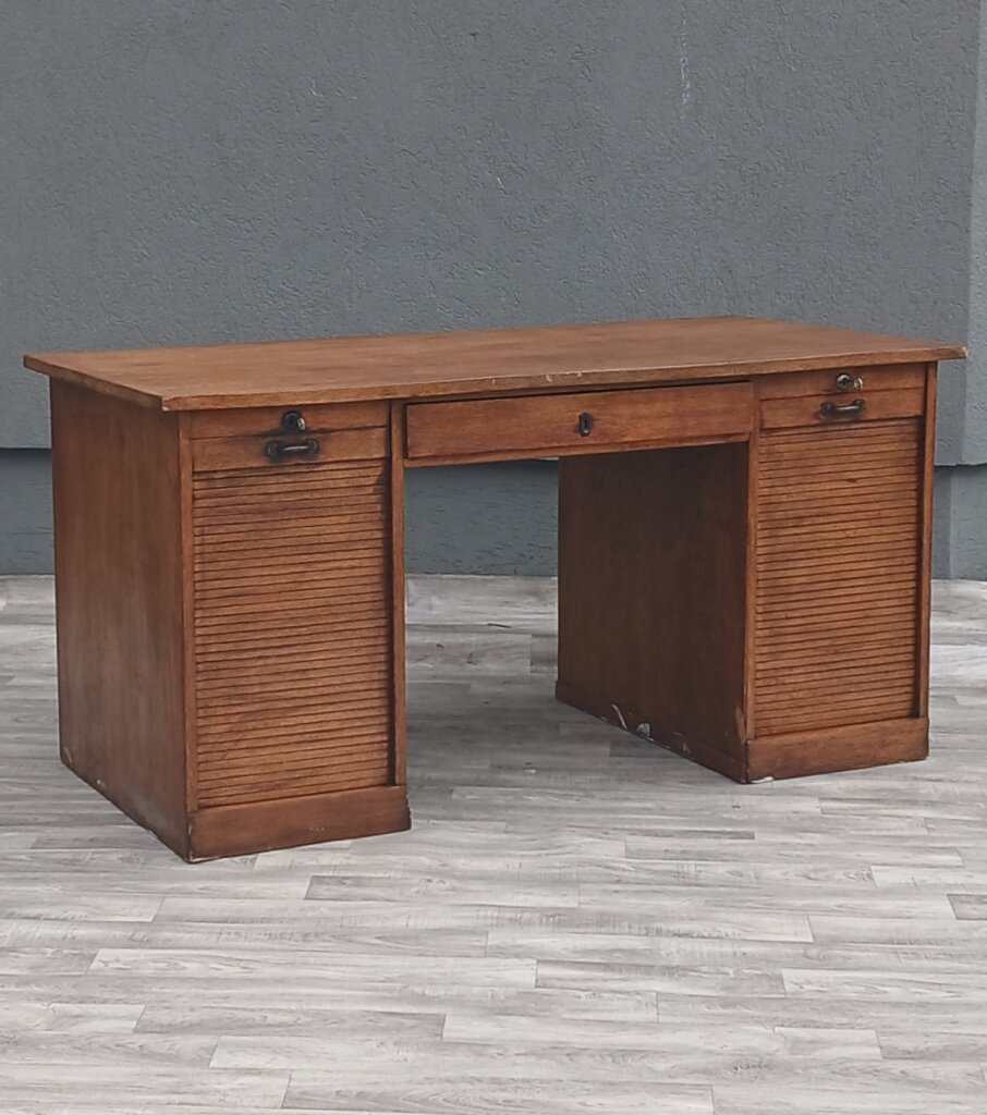 Tento starožitný písací stôl z obdobia cca 1920 – 1940. Je vyrobený z masívneho dubového dreva s prirodzenou hnedou patinou, ktorá zdôrazňuje vek a charakter dreva . Je postavený na dvoch robustných bočných kontajneroch. Unikátnym prvkom sú vertikálne lamelové rolety (žalúzie). Tieto rolety sú sťahovacie a uzamykateľné, čo v minulosti slúžilo na rýchle a bezpečné ukrytie rozpracovaných dokumentov. Za roletami sa nachádzajú praktické výsuvné priehradky a police, ideálne na organizáciu listín a kancelárskych potrieb . V stredovej časti pod pracovnou doskou je umiestnená jedna širšia zásuvka. Stôl je doplnený o pôvodné mosadzné úchyty a štítky zámkov, ktoré dotvárajú jeho dobový vzhľad . Vďaka svojmu reprezentatívnemu vzhľadu a historickej hodnote sa ideálne bude hodiť do štýlových pracovní a domácich knižníc . Používaný v pôvodnom stave viď. fotografie . Výška – 79 cm , šírka – 156 cm , hĺbka – 78 cm .
