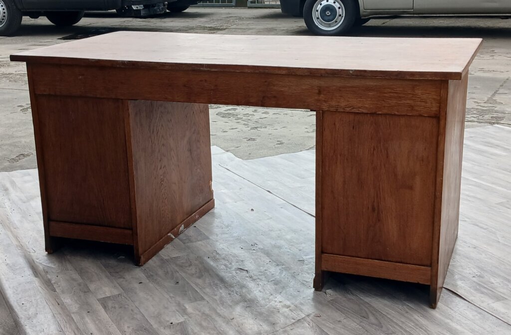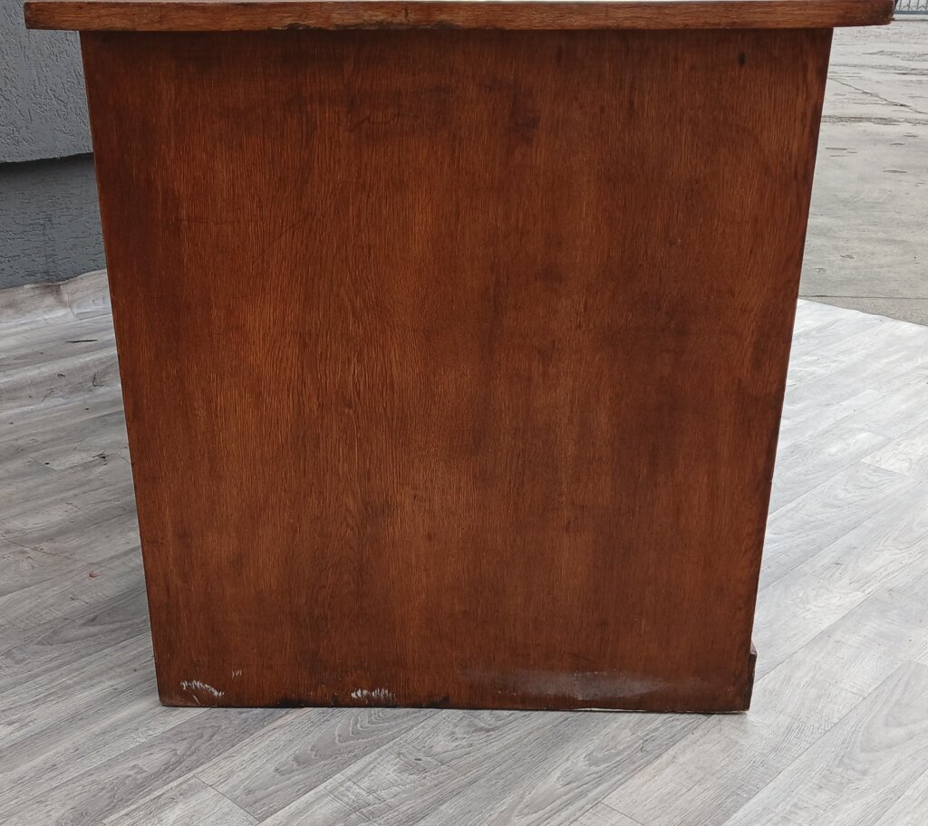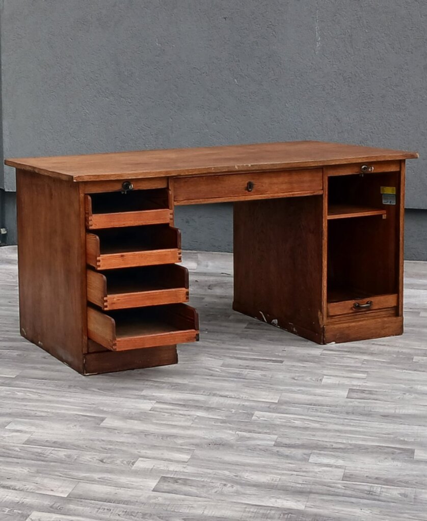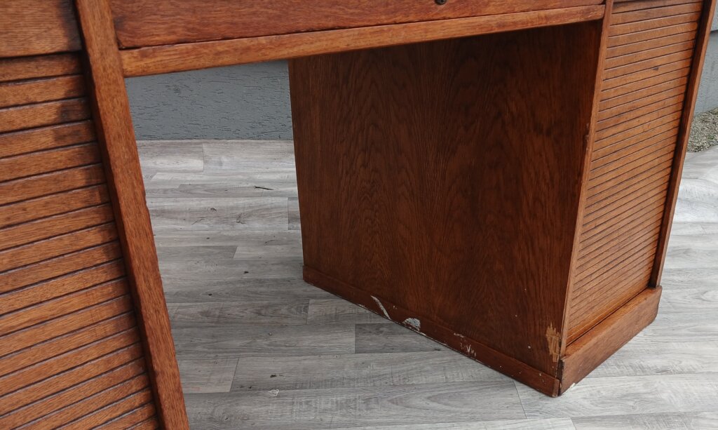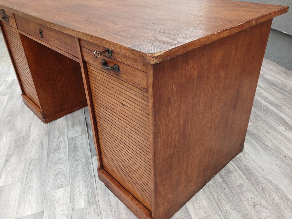 Tento starožitný písací stôl z obdobia cca 1920 – 1940. Je vyrobený z masívneho dubového dreva s prirodzenou hnedou patinou, ktorá zdôrazňuje vek a charakter dreva . Je postavený na dvoch robustných bočných kontajneroch. Unikátnym prvkom sú vertikálne lamelové rolety (žalúzie). Tieto rolety sú sťahovacie a uzamykateľné, čo v minulosti slúžilo na rýchle a bezpečné ukrytie rozpracovaných dokumentov. Za roletami sa nachádzajú praktické výsuvné priehradky a police, ideálne na organizáciu listín a kancelárskych potrieb . V stredovej časti pod pracovnou doskou je umiestnená jedna širšia zásuvka. Stôl je doplnený o pôvodné mosadzné úchyty a štítky zámkov, ktoré dotvárajú jeho dobový vzhľad . Vďaka svojmu reprezentatívnemu vzhľadu a historickej hodnote sa ideálne bude hodiť do štýlových pracovní a domácich knižníc . Používaný v pôvodnom stave viď. fotografie . Výška – 79 cm , šírka – 156 cm , hĺbka – 78 cm .
