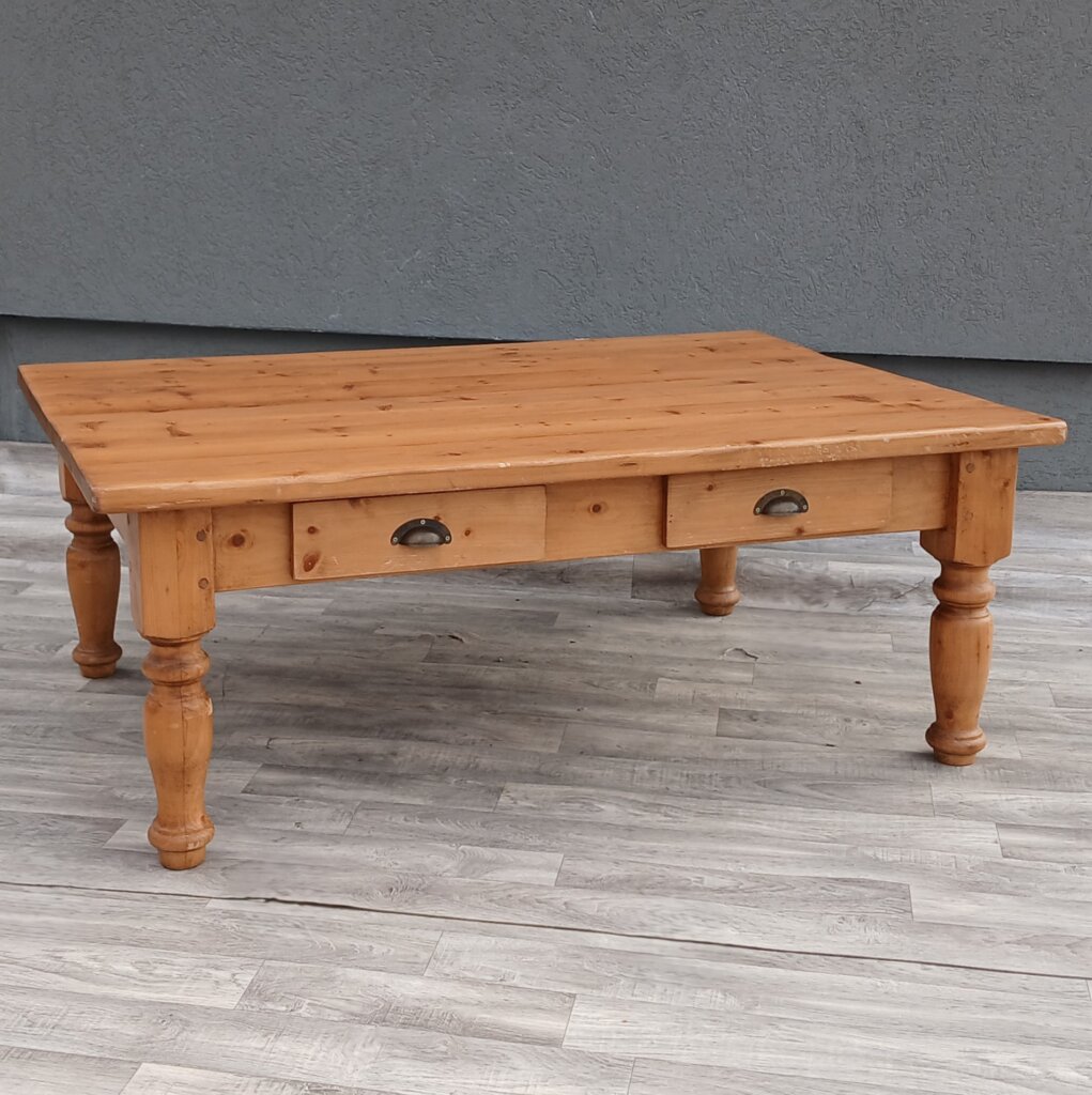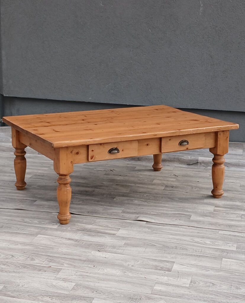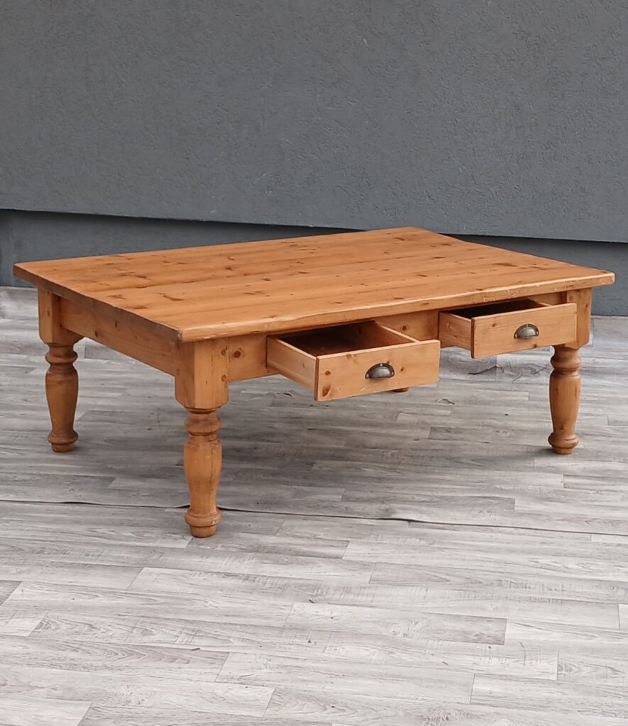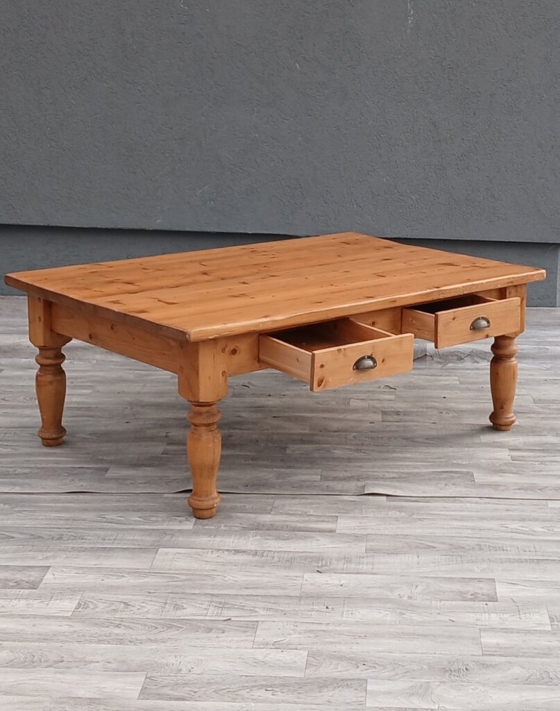 Tento konferenčný stolík zo smrekového dreva vďaka svojej robustnej konštrukcii a tradičnému spracovaniu sa bude hodiť najmä do obývačiek ladených vo vidieckom, chalupárskom , alebo koloniálnom štýle. Masívne vyrezávané nohy dodávajú stolíku stabilitu . Disponuje praktickými zásuvkami s ozdobnými mušľovými kovovými úchytkami , ideálnymi na odkladanie ovládačov, časopisov alebo drobností. Používaný . Výška – 50 cm , dĺžka – 130 cm , šírka – 90 cm .