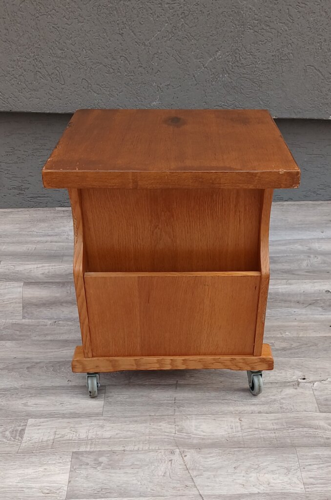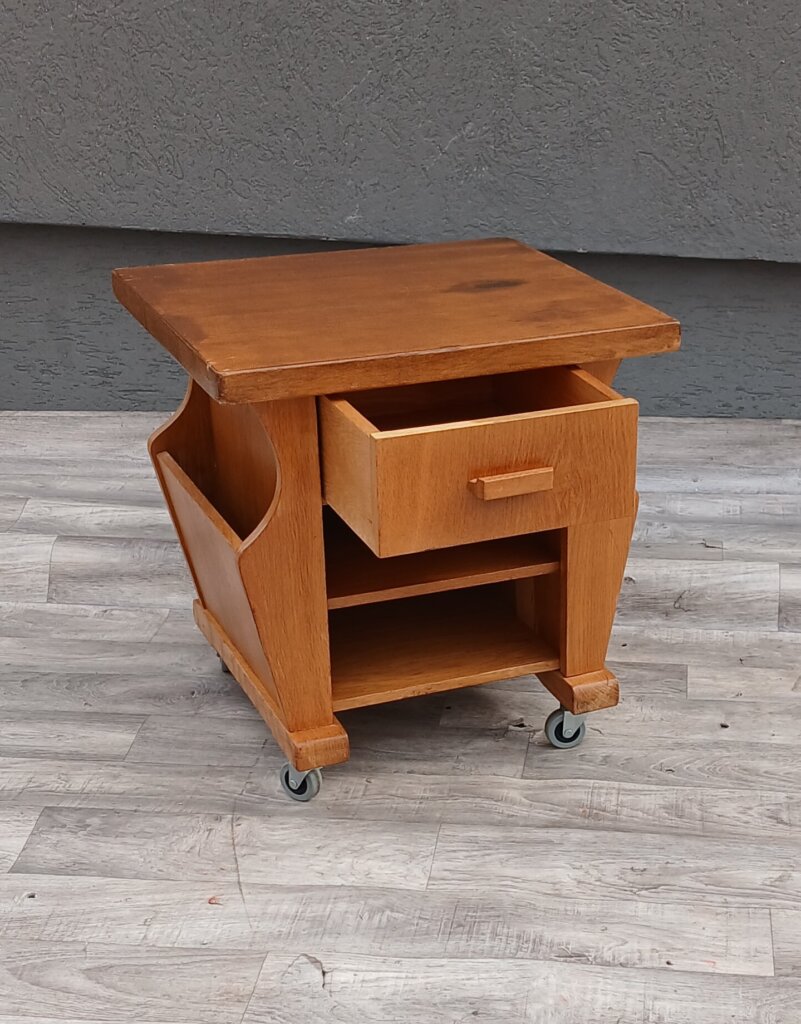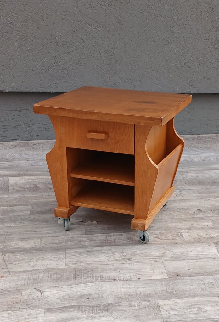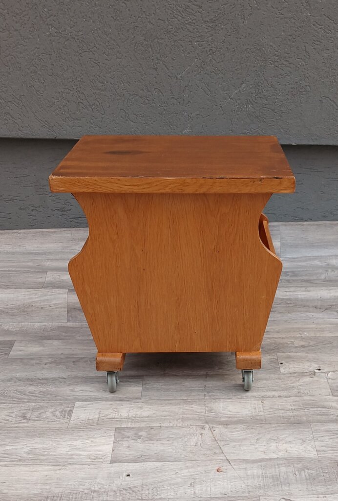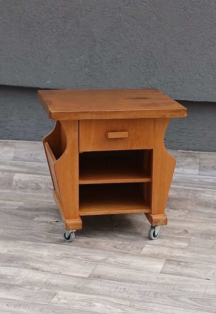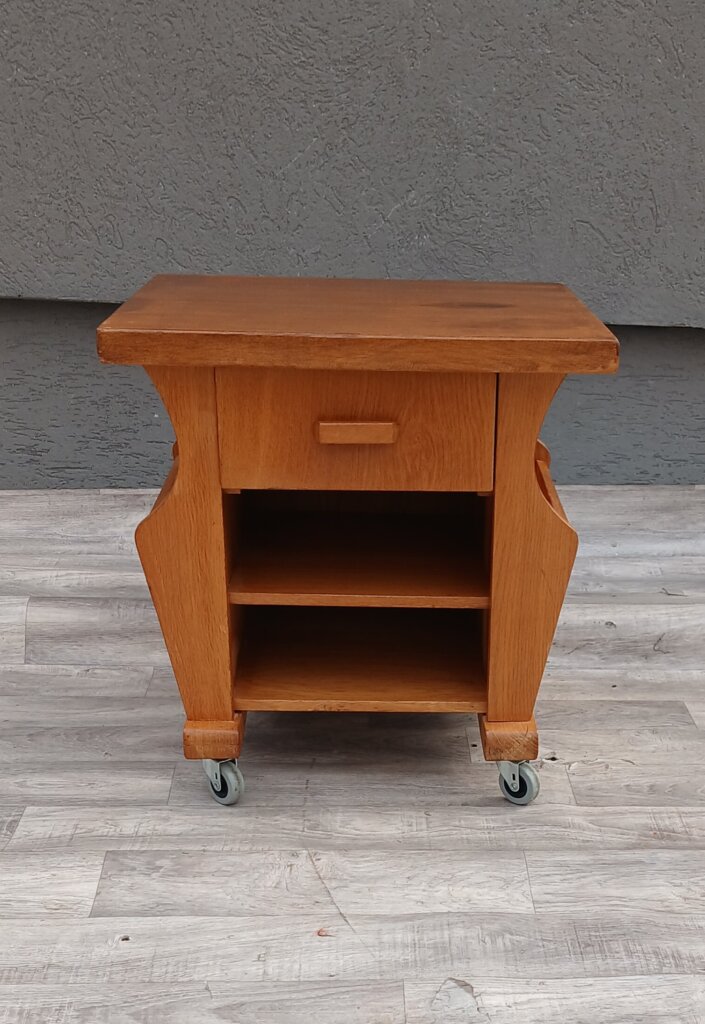 Tento štýlový a praktický stolík z masívneho dubového dreva , ktorý sa bude hodiť ako nočný stolík, príručný stolík k pohovke alebo mobilný bar. Má praktickú zásuvku v hornej časti na drobnosti , otvorená polica môže zasa poslúžiť na knihy , alebo dekorácie. Bočné priehradky na časopisy, noviny alebo tablety. Stolík je osadený na pevných kolieskach, takže ho v priestore presuniete bez námahy presne tam, kde ho práve potrebujete. Používaný . Výška – 52 cm , šírka – 51 cm , hĺbka – 43 cm .