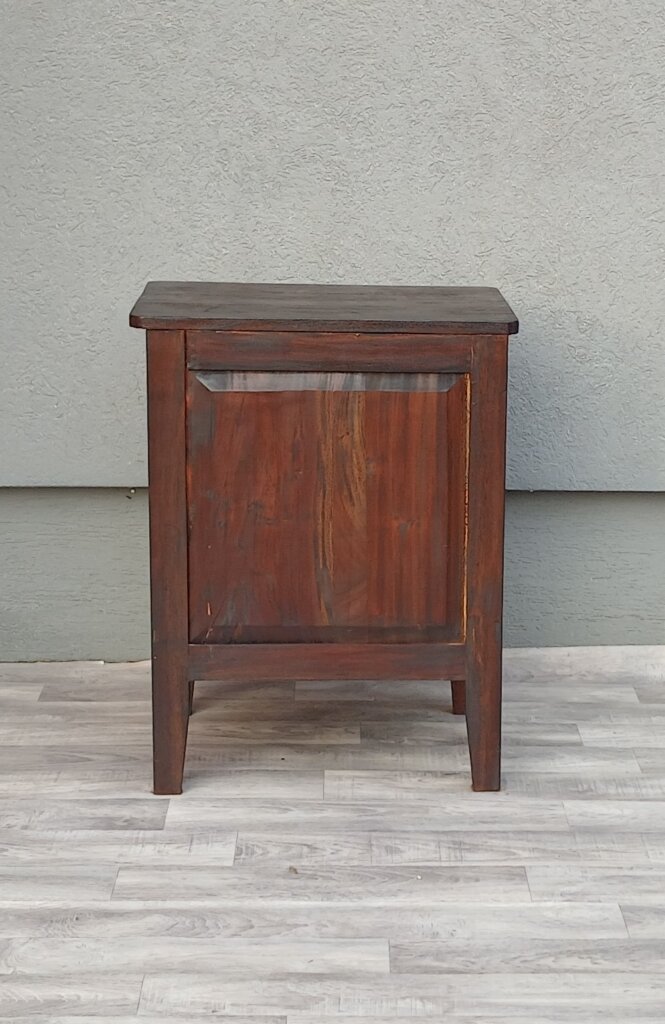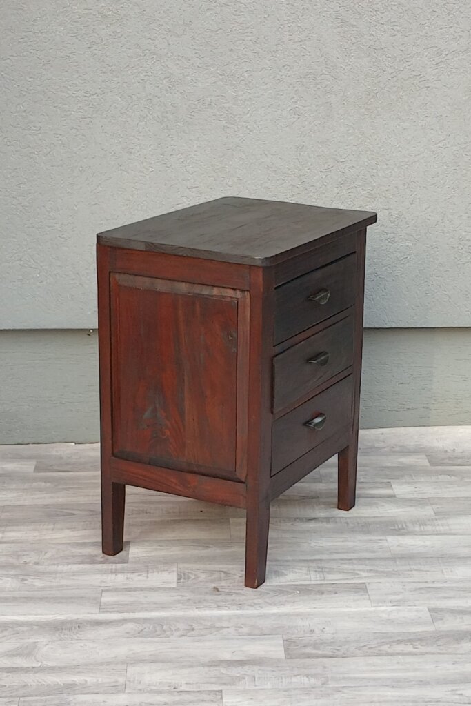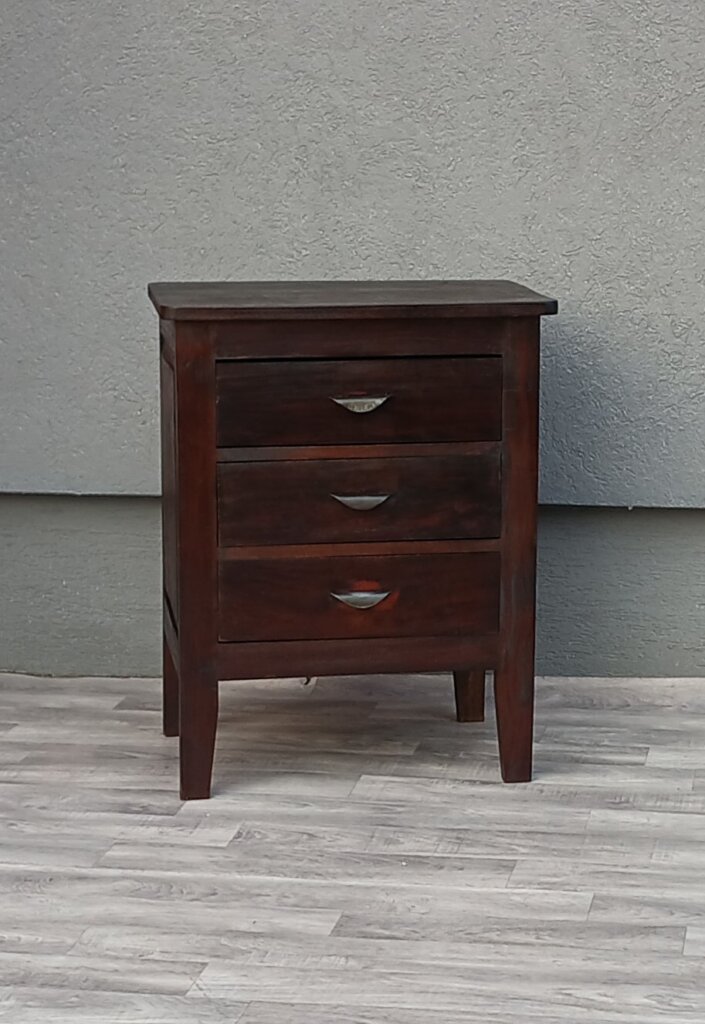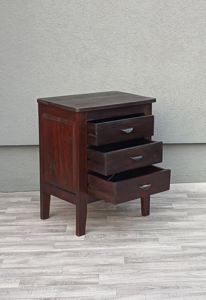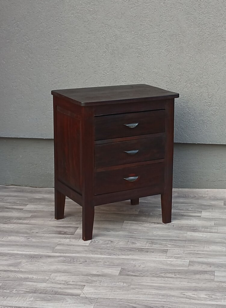 Nočný stolík z masívneho teakového dreva v tmavohnedom prevedení s 3 zásuvkami a polmesiacovými kovovými úchytmi , poskytuje dostatok miesta na odkladanie rozčítaných kníh, okuliarov či nabíjačiek, ktoré chcete mať po ruke, ale skryté pred očami. Vhodný do spálni , ale aj na rôzne iné účely . Používaný . Výška – 70 cm , šírka – 55 cm , hĺbka – 40 cm .