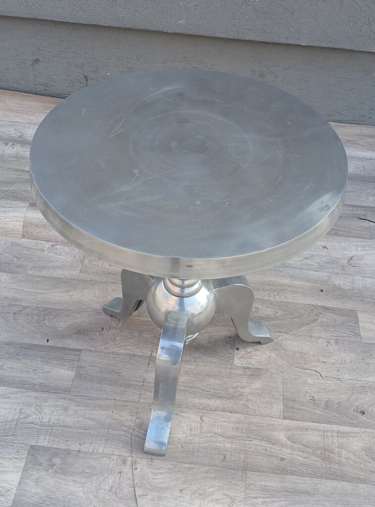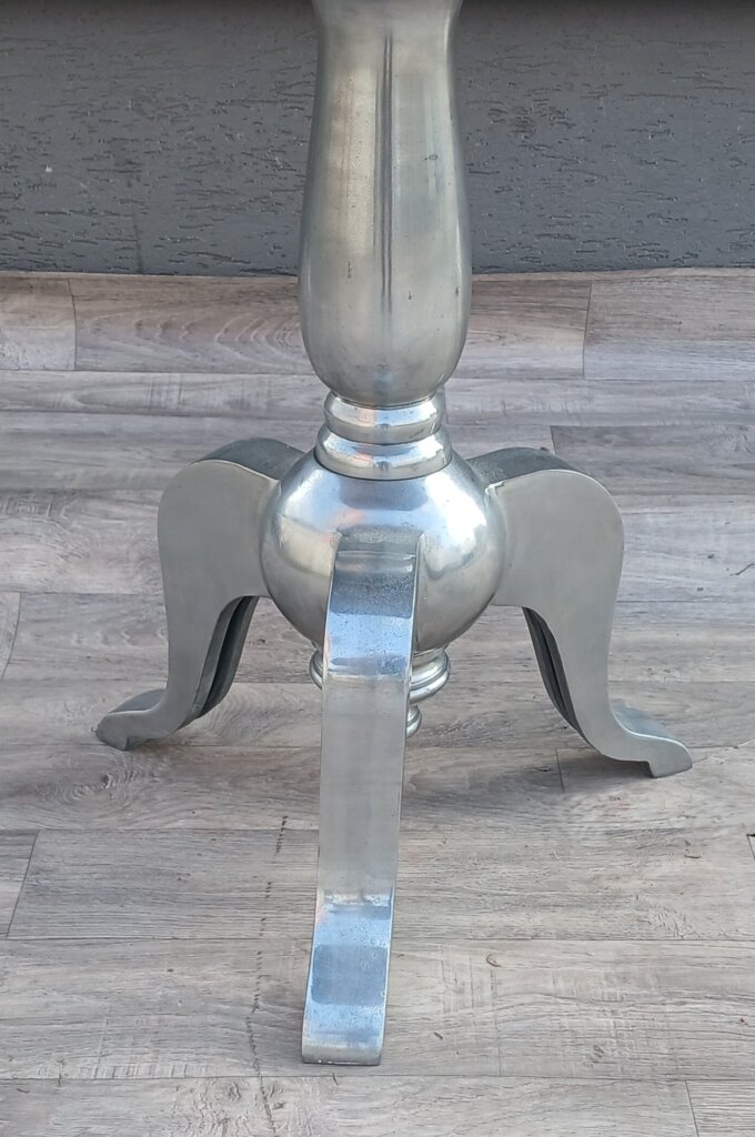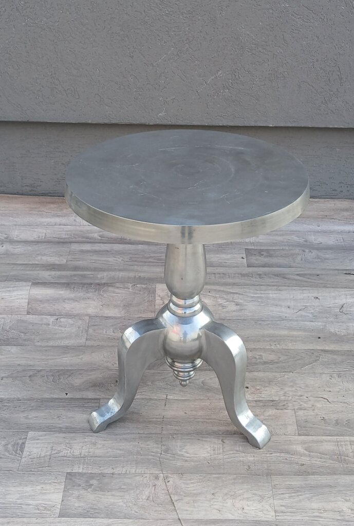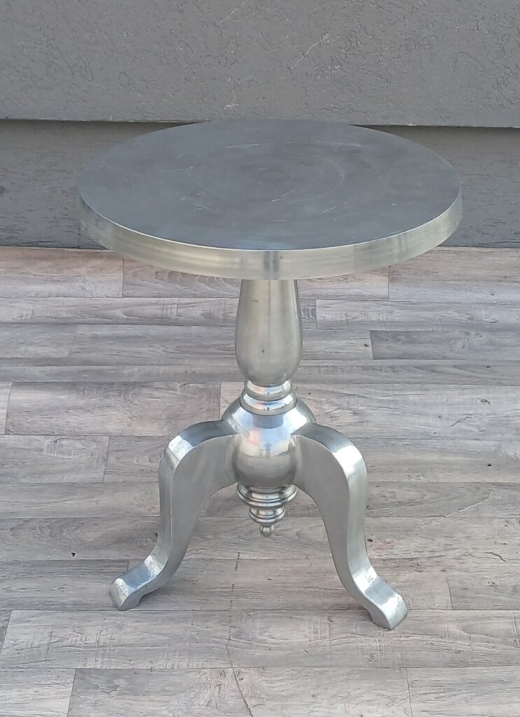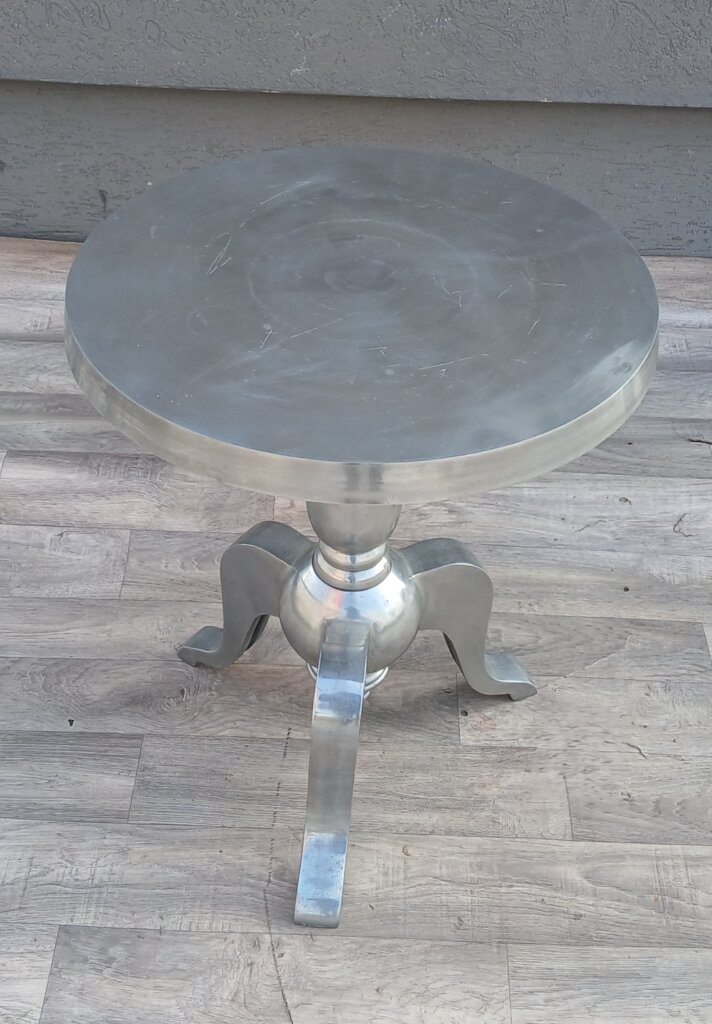 Tento strieborný príručný stolík bude výrazným kúskom do Vášho interiéru . Je vyrobený z lešteného hliníka , má vysoký lesk, ktorý pripomína striebro alebo chróm a krásne odráža svetlo v miestnosti. Vrchná doska je okrúhla s hladkým povrchom . Dominantou je stredová noha, ktorá prechádza do masívnejšej spodnej časti. Stabilitu zabezpečujú tri elegantne prehnuté nožičky . Vďaka svojim rozmerom bude ideálny ako odkladací stolík pri pohovke , alebo dekoračný podstavec pod kvetináč či lampu v predsieni . Používaný . Výška – 61 cm , priemer – 51 cm .