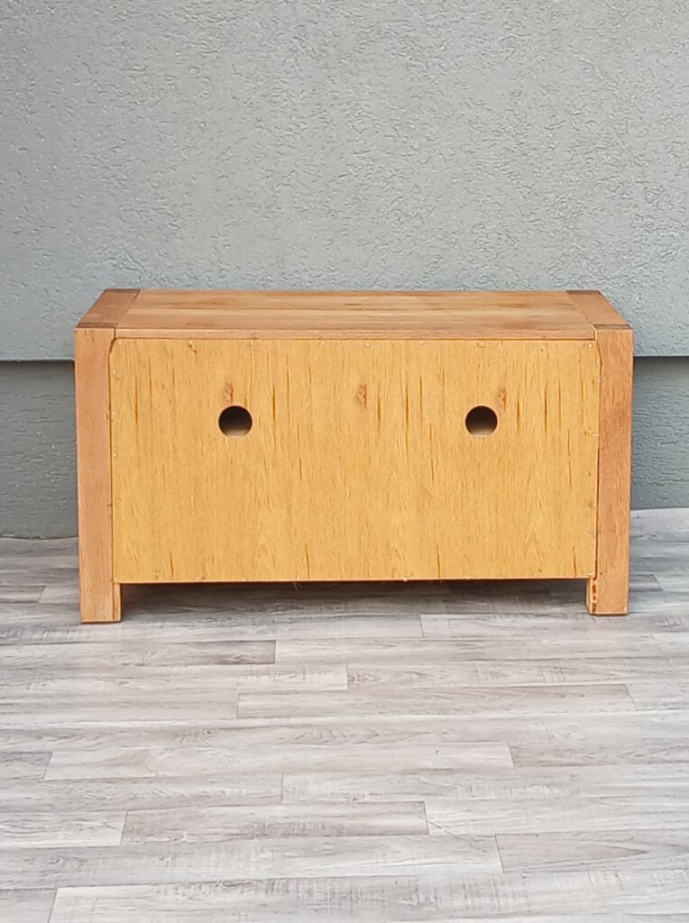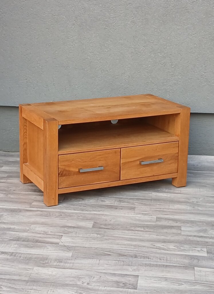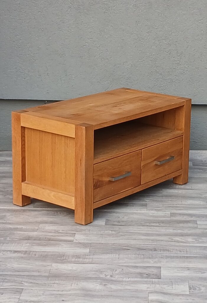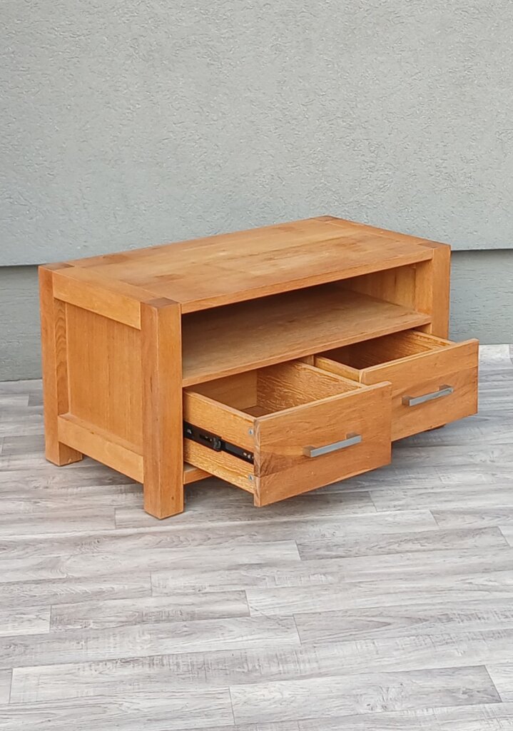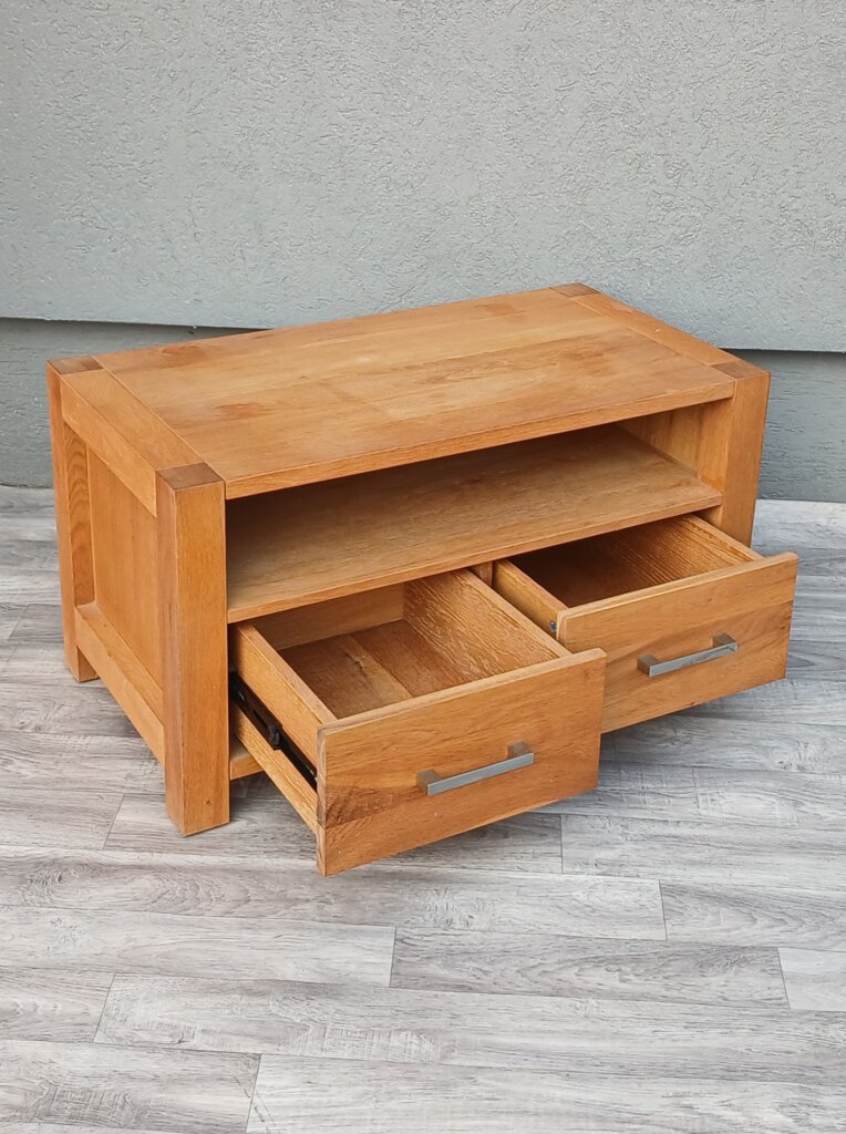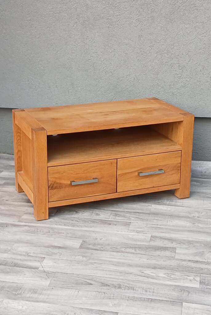 Tento televízny stolík z masívneho dubového dreva , ktorý kladie dôraz na prirodzenú krásu a robustnosť materiálu. V spodnej časti má dve praktické zásuvky s nerezovými úchytkami v tvare hranatých madiel . V menších priestoroch môže slúžiť aj ako nízka komoda , alebo odkladací stolík. Používaný . Výška – 46 cm , šírka – 84 cm , hĺbka – 45 cm .