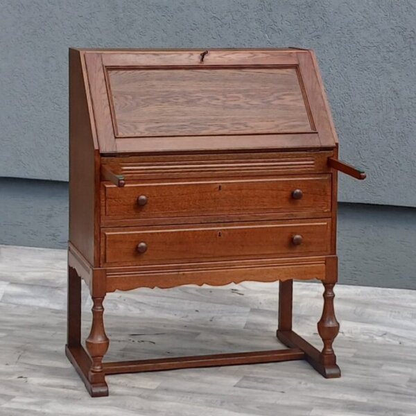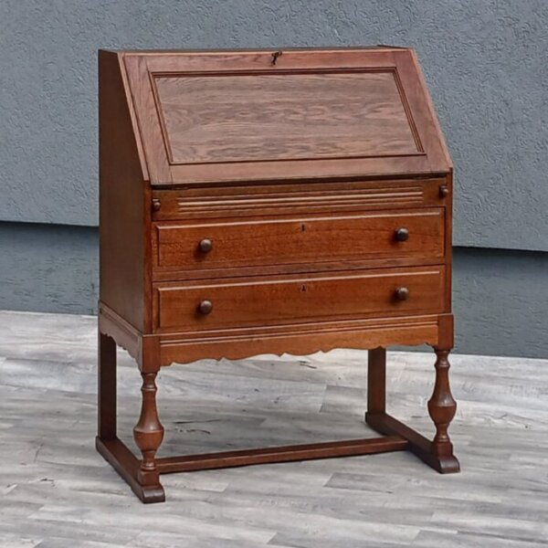 Prezentácia veľkolepého barokového sekretára z roku cca 1720 s intarzovaným dizajnom. Horná skrinka má malé polovičné zásuvky lemujúce strednú skrinku , hornú , spodnú a bočné. Dvere skrinky sa odomknú , aby odhalili priestor obsahujúci západku na oboch stranách , ktorá umožňuje odomknutie a otvorenie ostatných poličiek. Stredná časť obsahuje šikmé veko , ktoré sa otvára a potom sa môže používať ako písací stôl. Spodná časť sekretára obsahuje tri dlhé hlboké uzamykateľné zásuvky. Nádherné kontrastné vložky intarzie spolu s vynikajúcimi ručne vyrobenými detailmi a remeselným spracovaním sú dôkazom druhu remeselného spracovania. Sekretár je vo vynikajúcom stave s originálnym povrchom , skutočnou ukážkou pre znalca jemného starožitného barokového nábytku. Výška – 233 cm ,šírka – 120 cm , hĺbka – 73 cm.