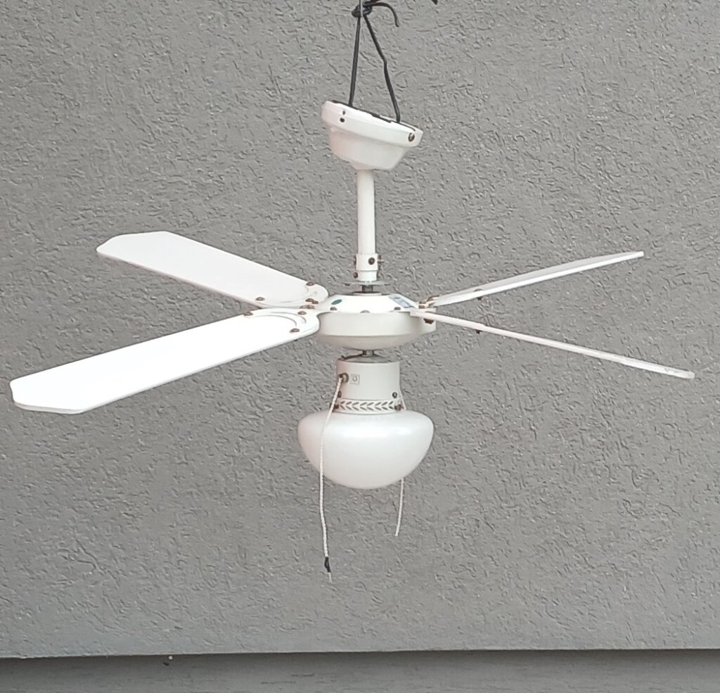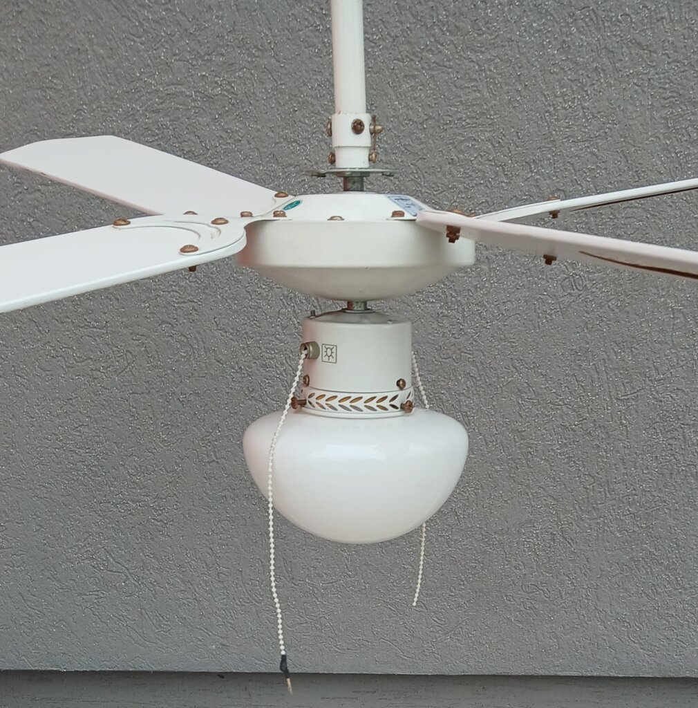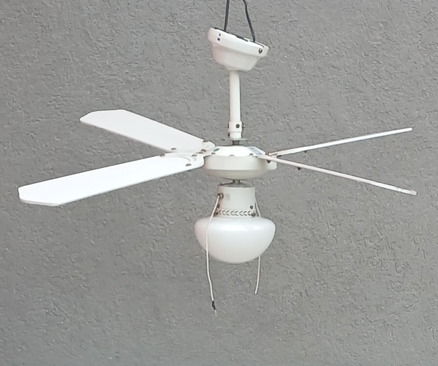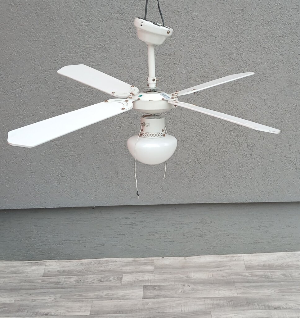 Integrované svietidlo s opálovým skleneným tienidlom, ktoré poskytuje príjemné, rozptýlené svetlo. Klasické a spoľahlivé ovládanie pomocou ťahových retiazok (jedna pre rýchlosť ventilátora, druhá pre svetlo). Kovová konštrukcia, lopatky z odolného materiálu z MDF s povrchovou úpravou. 3 nastaviteľné stupne výkonu. Používaný – nevyskúšaný . Výška – 62 cm , šírka – 106 cm .