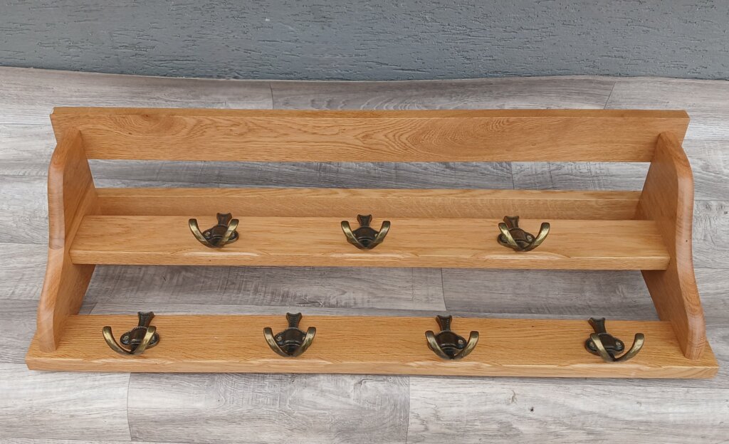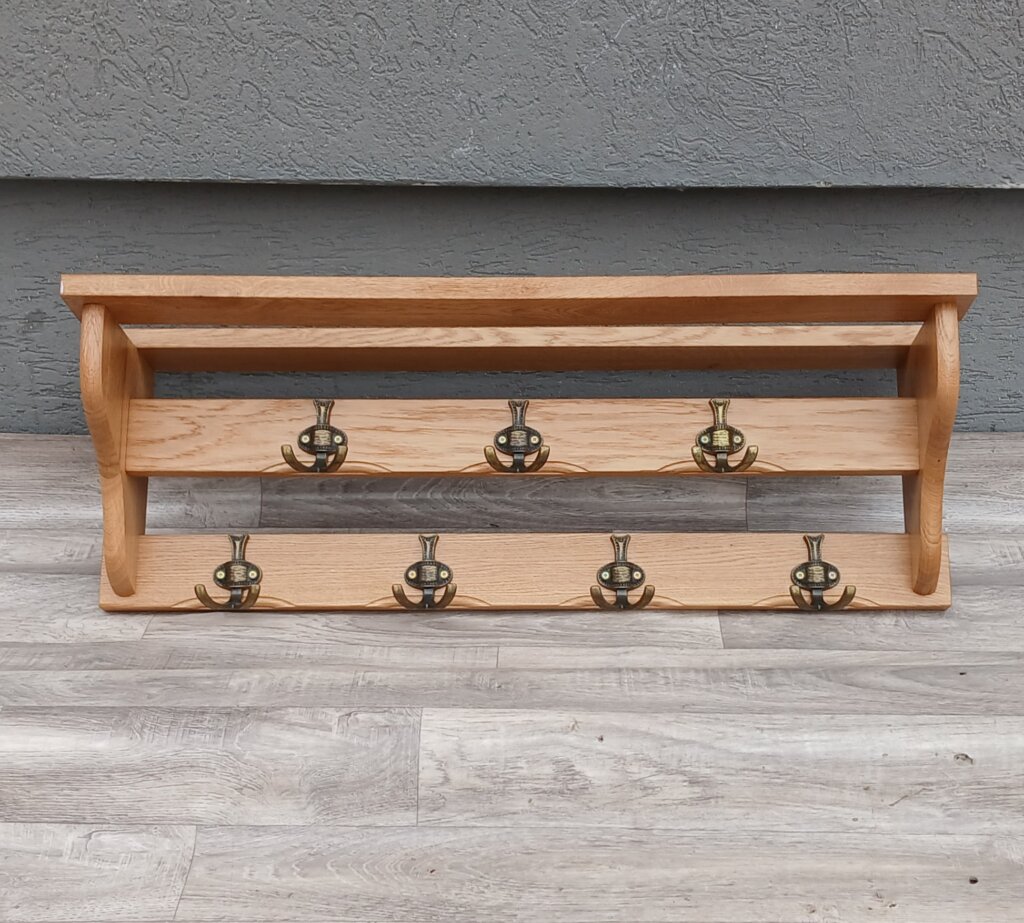 Je vyrobený z dubového masívu s výraznou a prirodzenou kresbou dreva. Robustné vyhotovenie s hornou odkladacou policou, ktorá je ideálna na klobúky, čiapky alebo dekorácie. Polica je spevnená bočnými bočnicami, ktoré jej dodávajú stabilitu a zaujímavý vizuálny profil. Vešiak je osadený siedmimi kovovými háčikmi v starobylom bronzovom prevedení. Háčiky sú usporiadané v dvoch radoch: horný rad s 3 háčikmi na dlhšie kabáty , dolný rad so 4 háčikmi na kratšie kusy oblečenia, tašky alebo kľúče. Používaný . Výška – 37 cm , šírka – 85 cm , hĺbka – 22 cm .