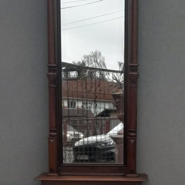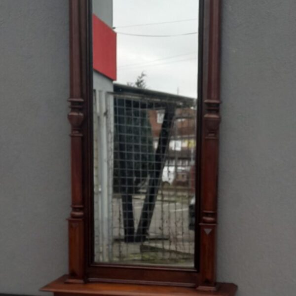 Zrkadlo nástenné z 80.rokov je ručne vyrobené zo smrekového dreva. Má oválny tvar so skoseným sklom . Odporúčame ho umiestniť napríklad do spálne k toaletnému stolíku, do priestrannej chodby či predsiene , alebo na krbovú rímsu. Na zadnej strane zrkadla visí kovový drôt , ktorý slúži na zavesenie . Používané. Výška – 64 cm , šírka – 90 cm .
